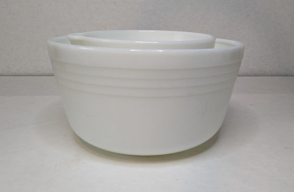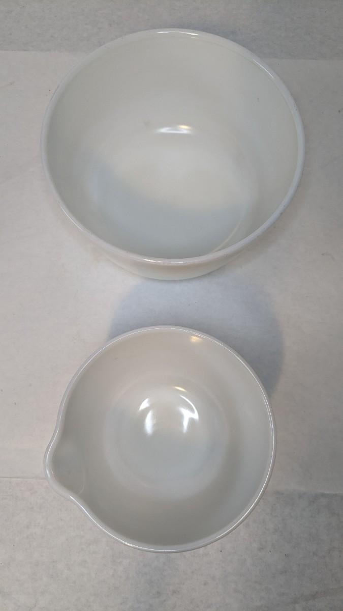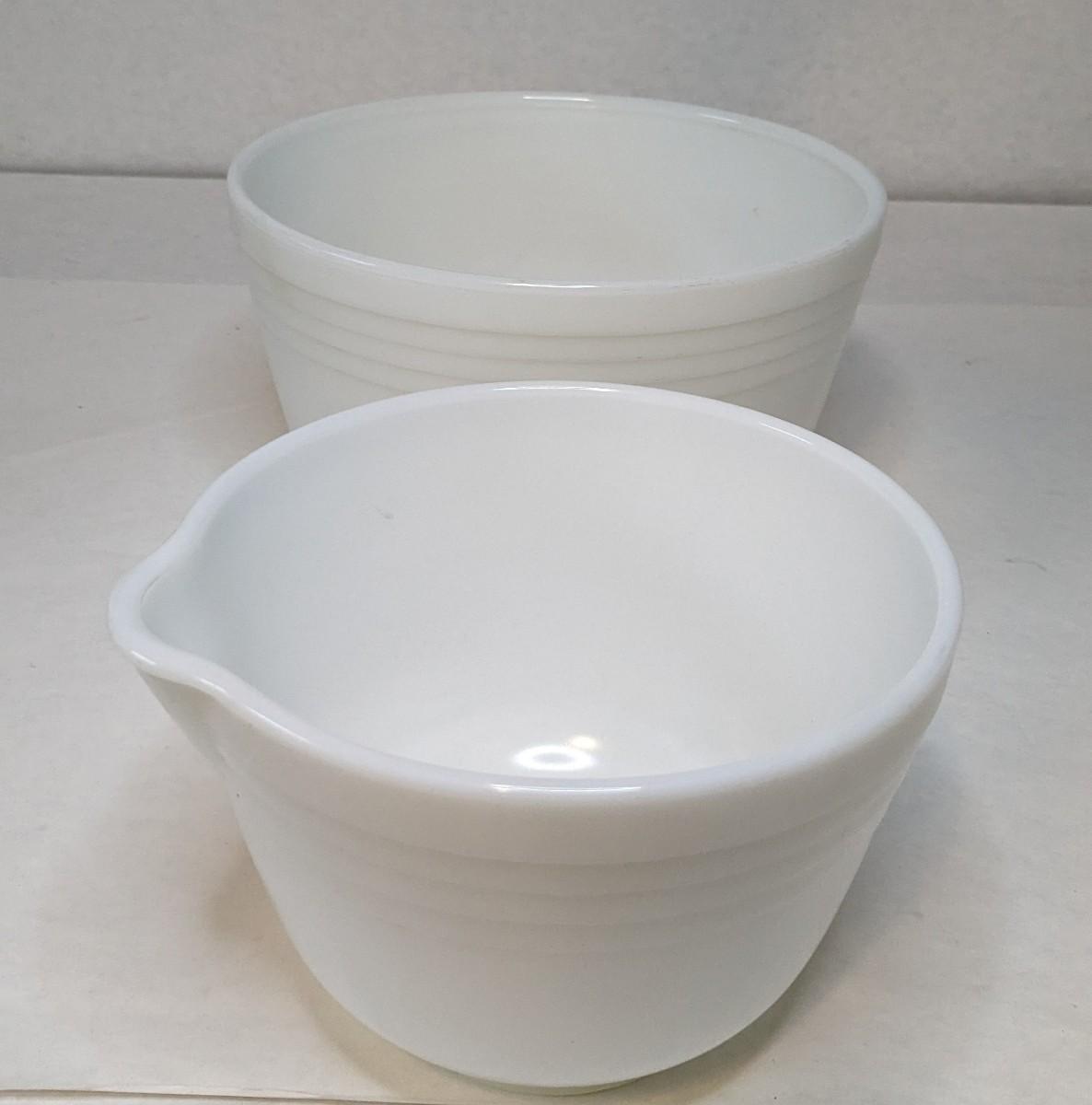 (2) 6.75" with pour spout no.5 milk glass mixing bowl and 8 5/8" no. 12 bowl both for use in countertop mixer by Hamilton Beach or perfect for everyday use. Both are in great condition with no chips or cracks noted, slight discoloration is present as noted in photos.