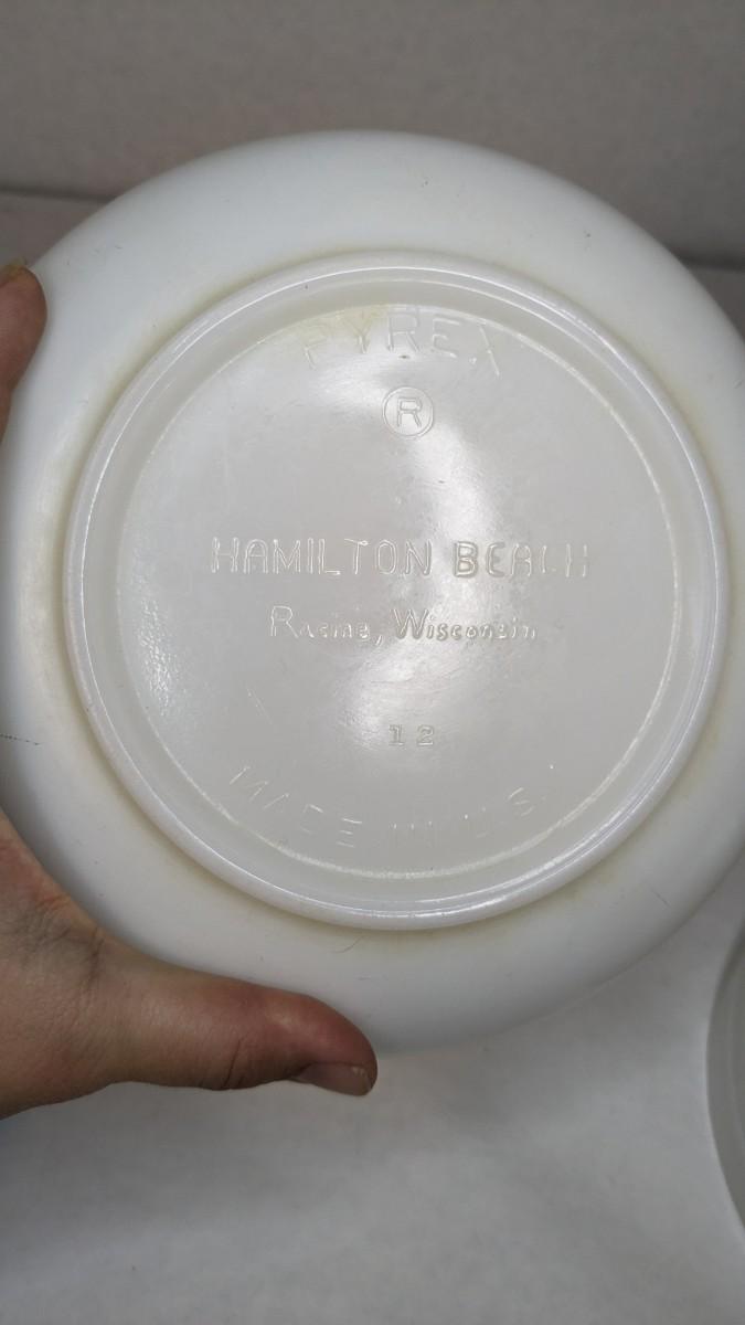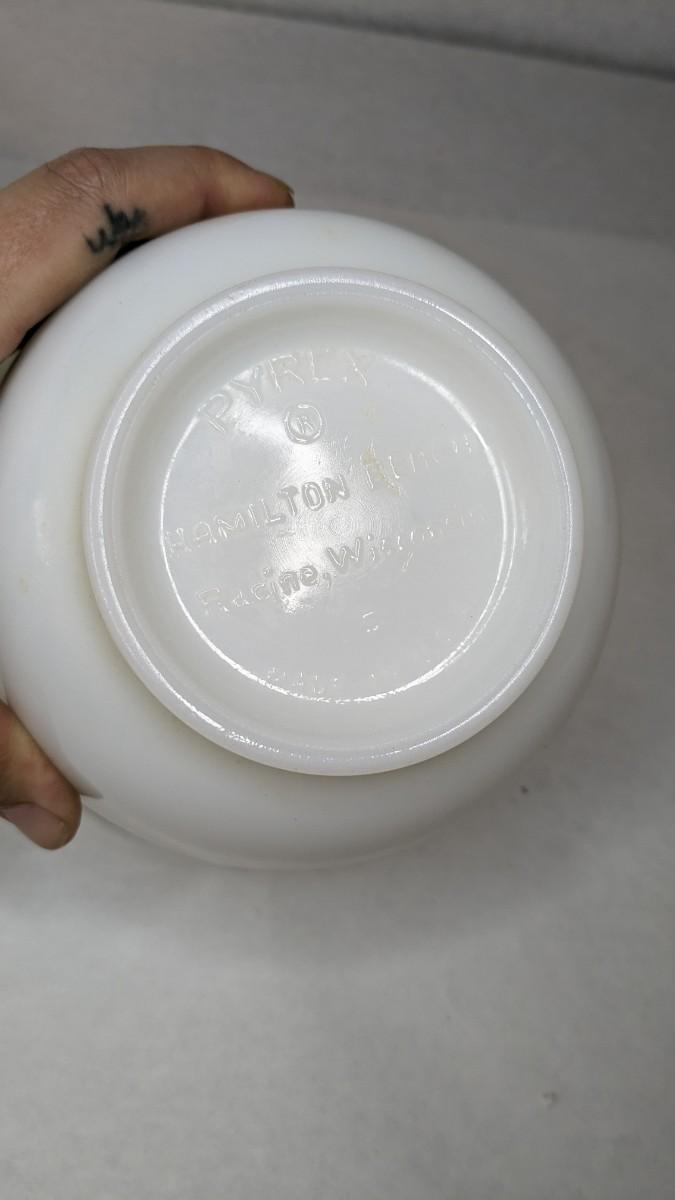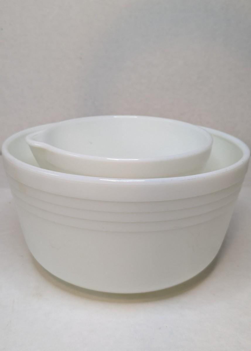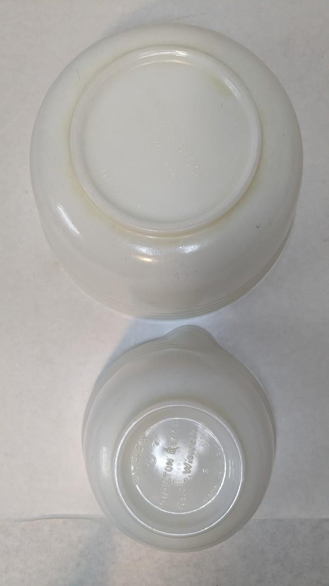 (2) 6.75" with pour spout no.5 milk glass mixing bowl and 8 5/8" no. 12 bowl both for use in countertop mixer by Hamilton Beach or perfect for everyday use. Both are in great condition with no chips or cracks noted, slight discoloration is present as noted in photos.