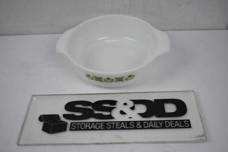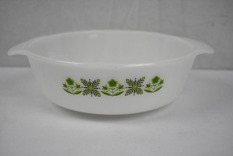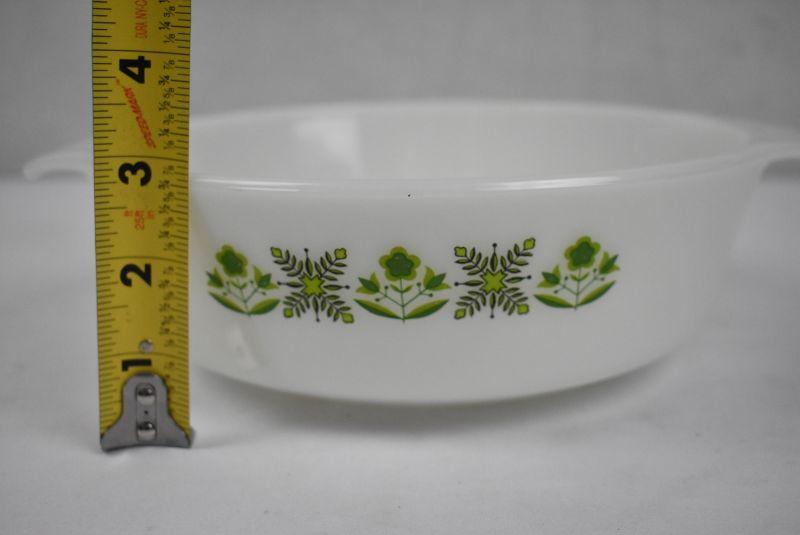Milk Glass Round Casserole Dish with Green Floral Design - Vintage