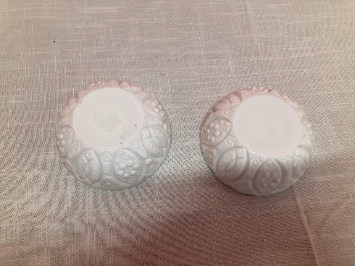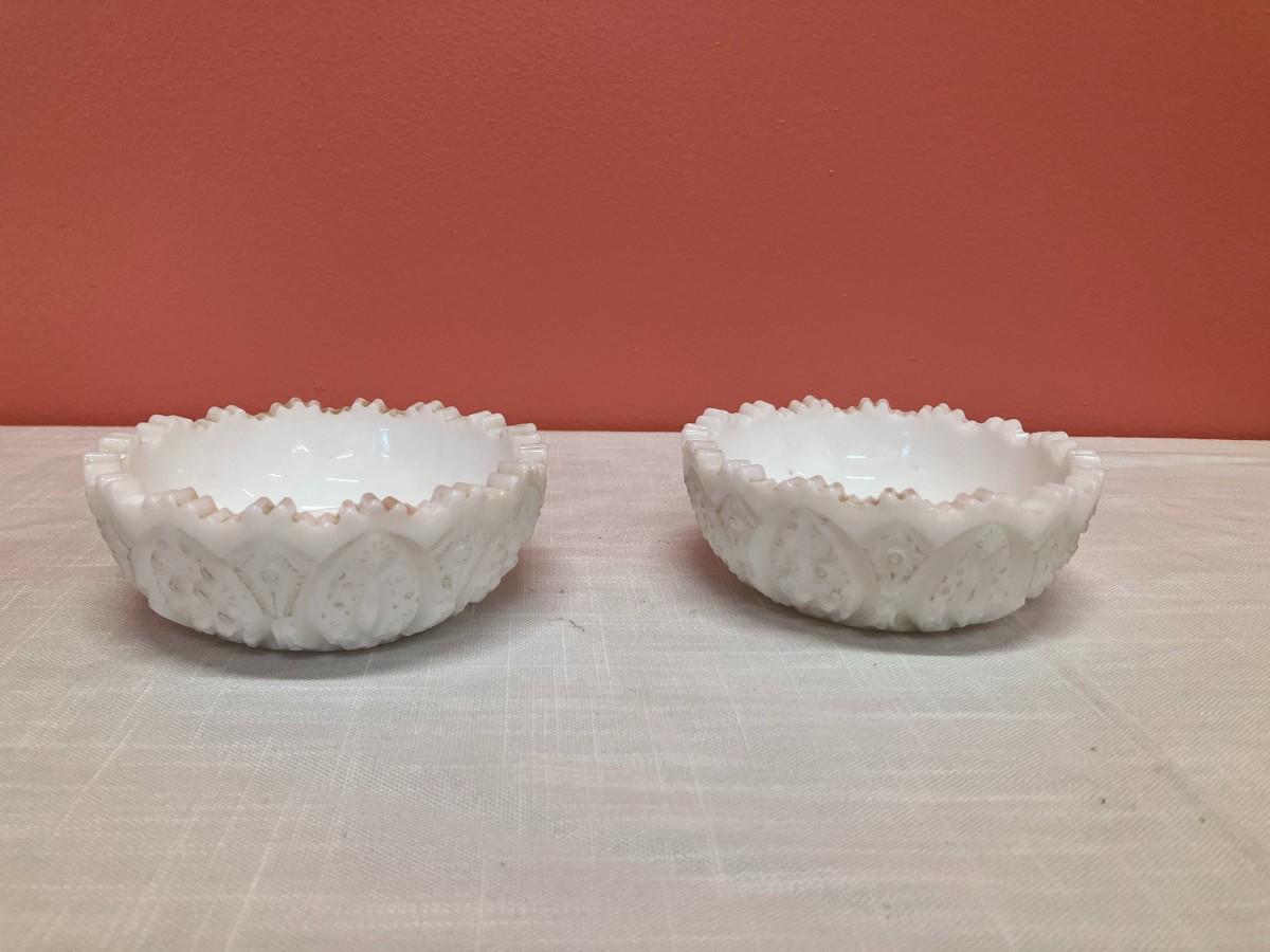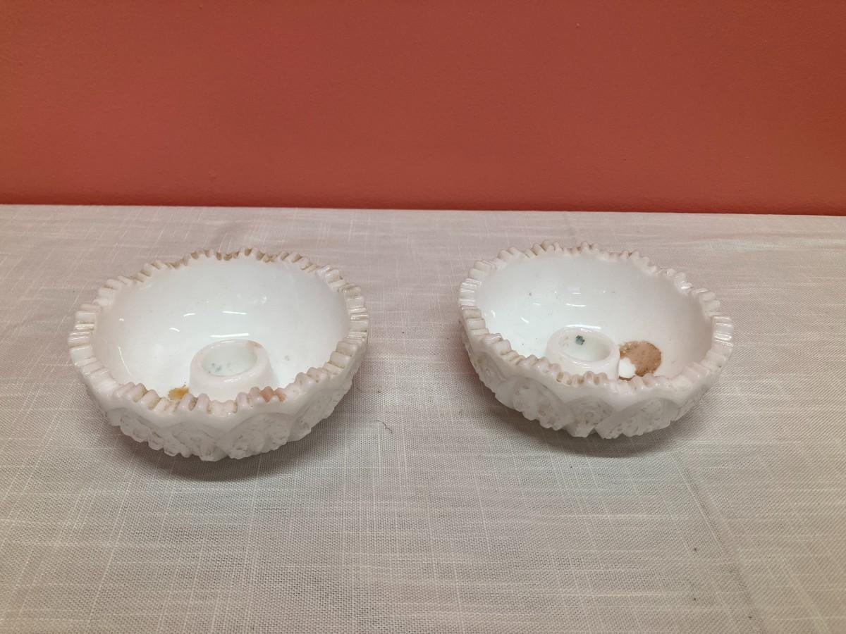 2 identical milk glass taper candle holders. 2" H x 4.5" W
