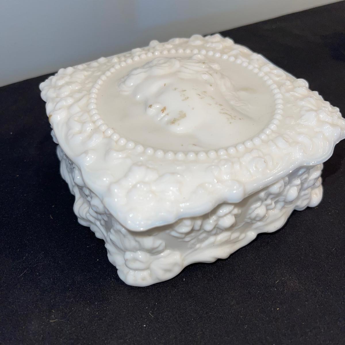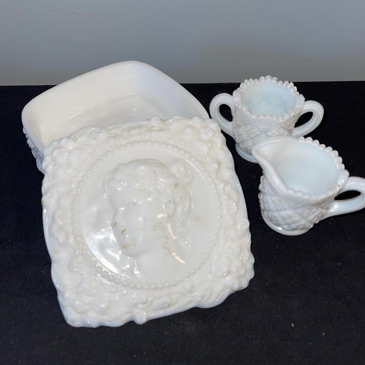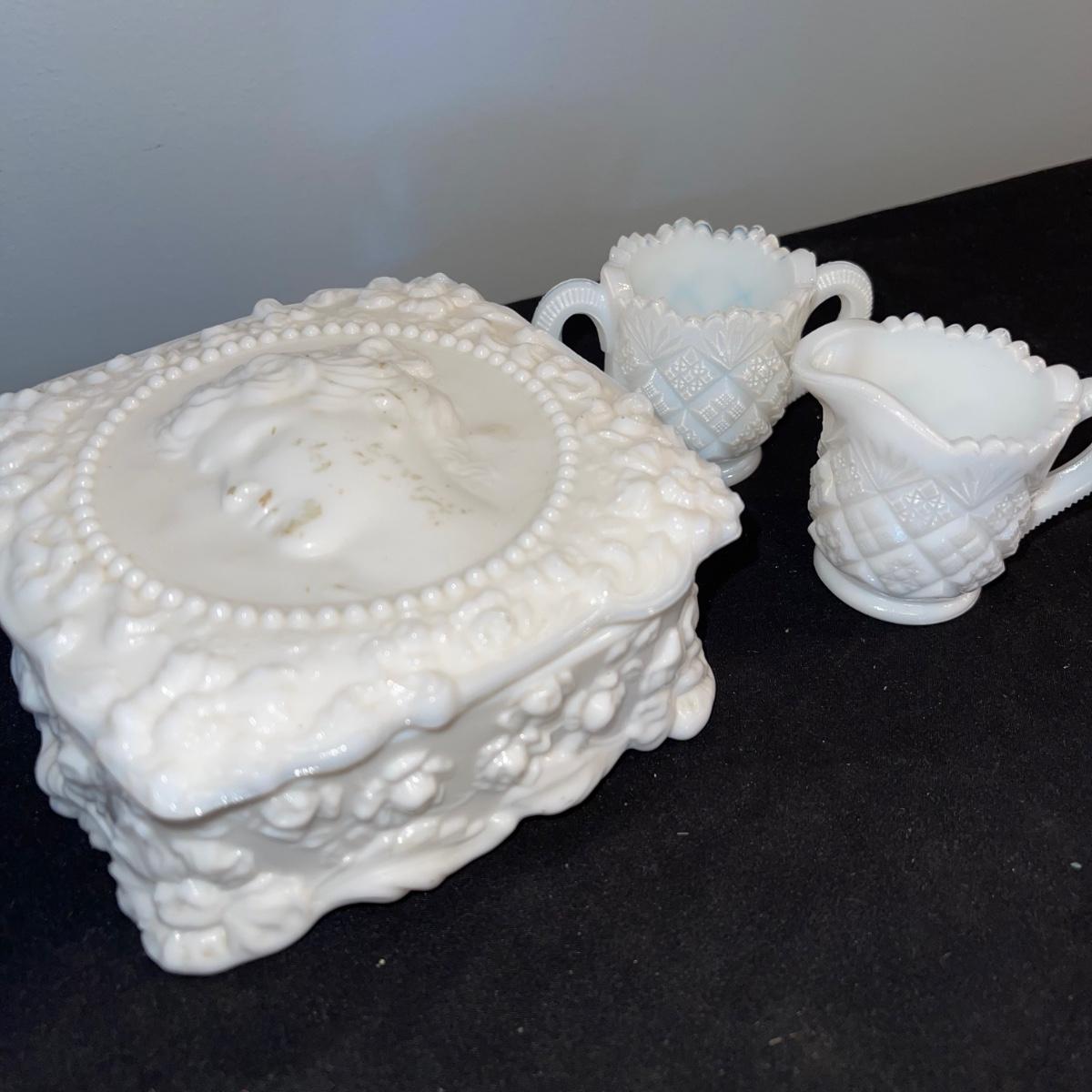 Three milk glass items include a box, a creamer pitcher, and a sugar dish. The box has textured floral details and a woman’s portrait. None of the items are taller than 2.5 inches and there are no signatures or brand names.