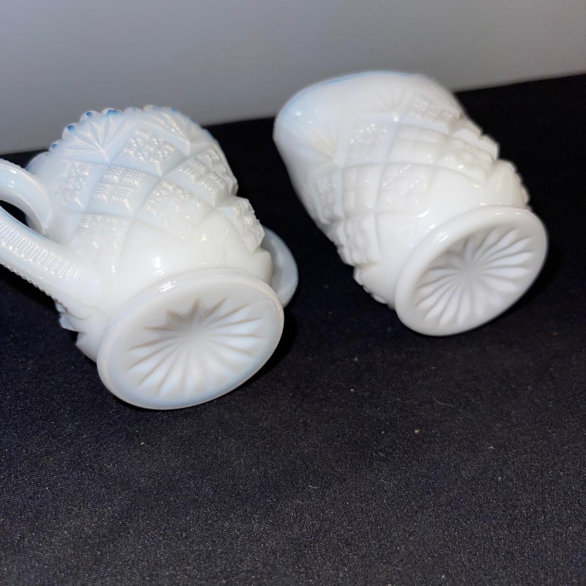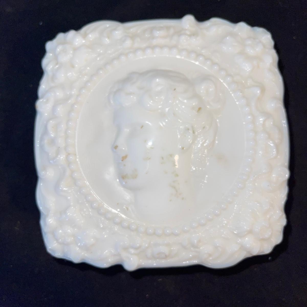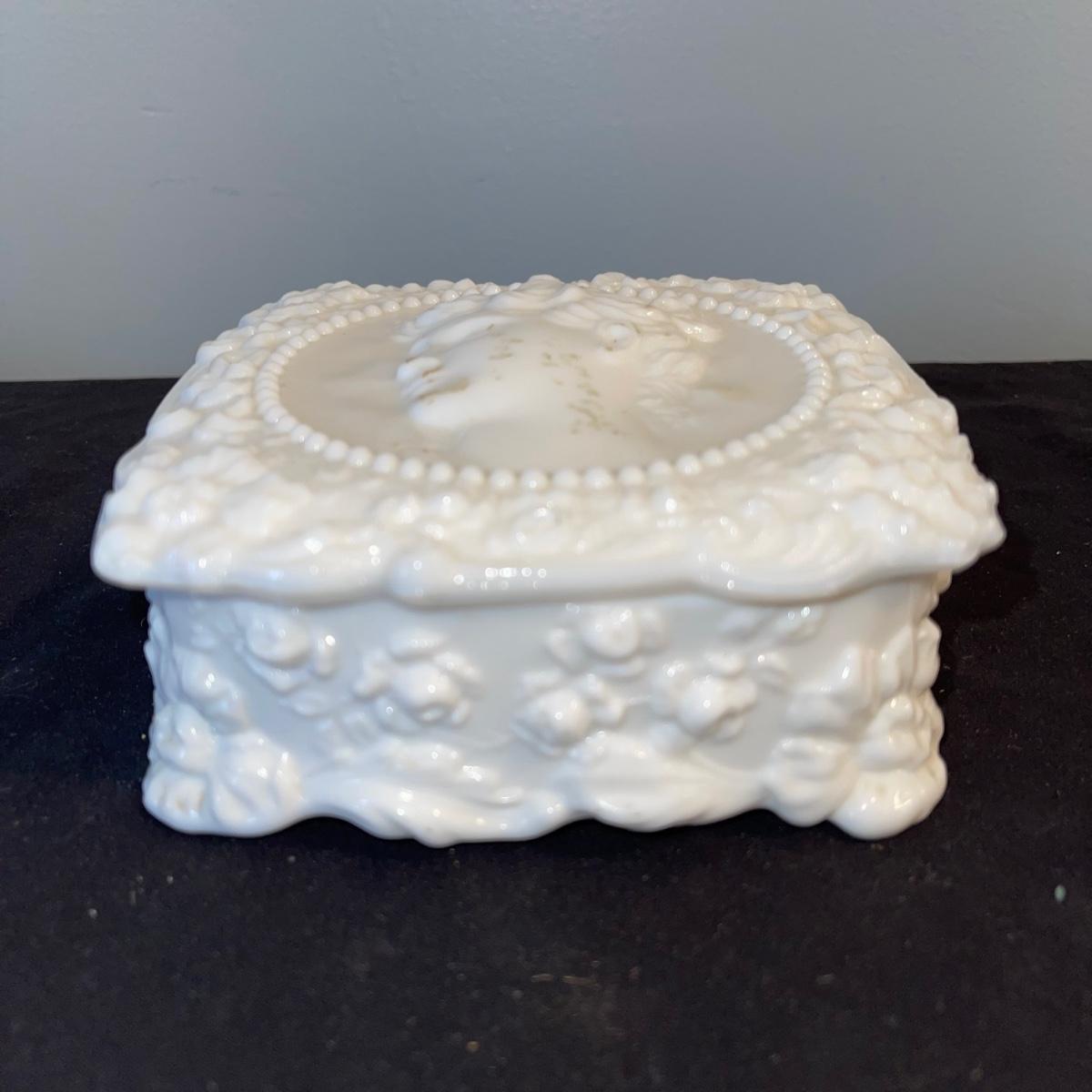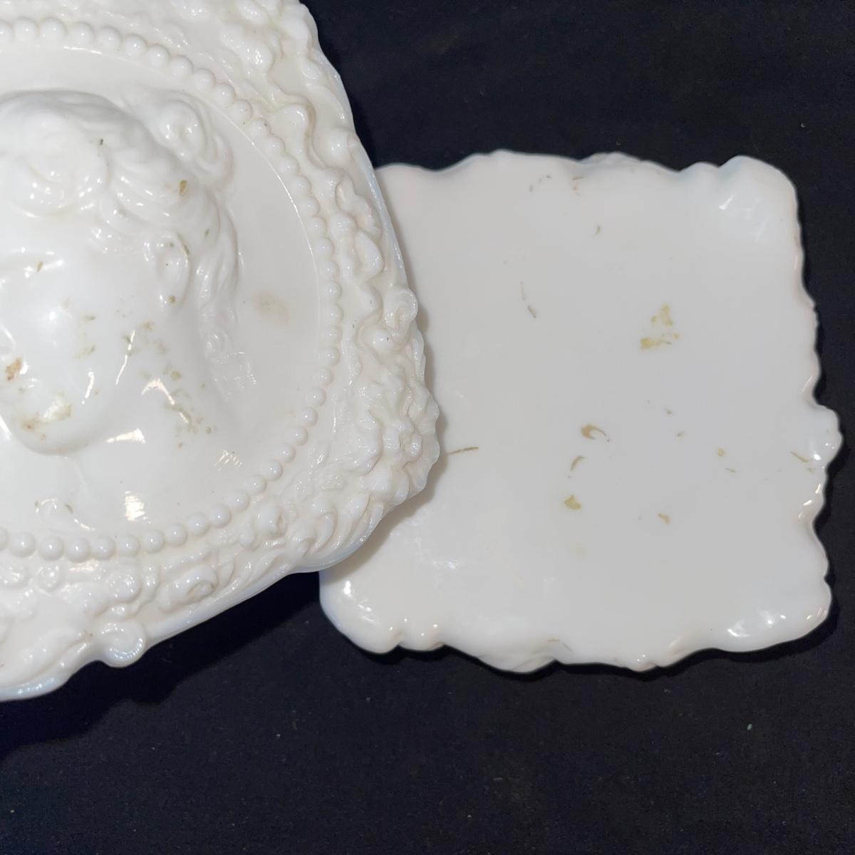 Three milk glass items include a box, a creamer pitcher, and a sugar dish. The box has textured floral details and a woman’s portrait. None of the items are taller than 2.5 inches and there are no signatures or brand names.