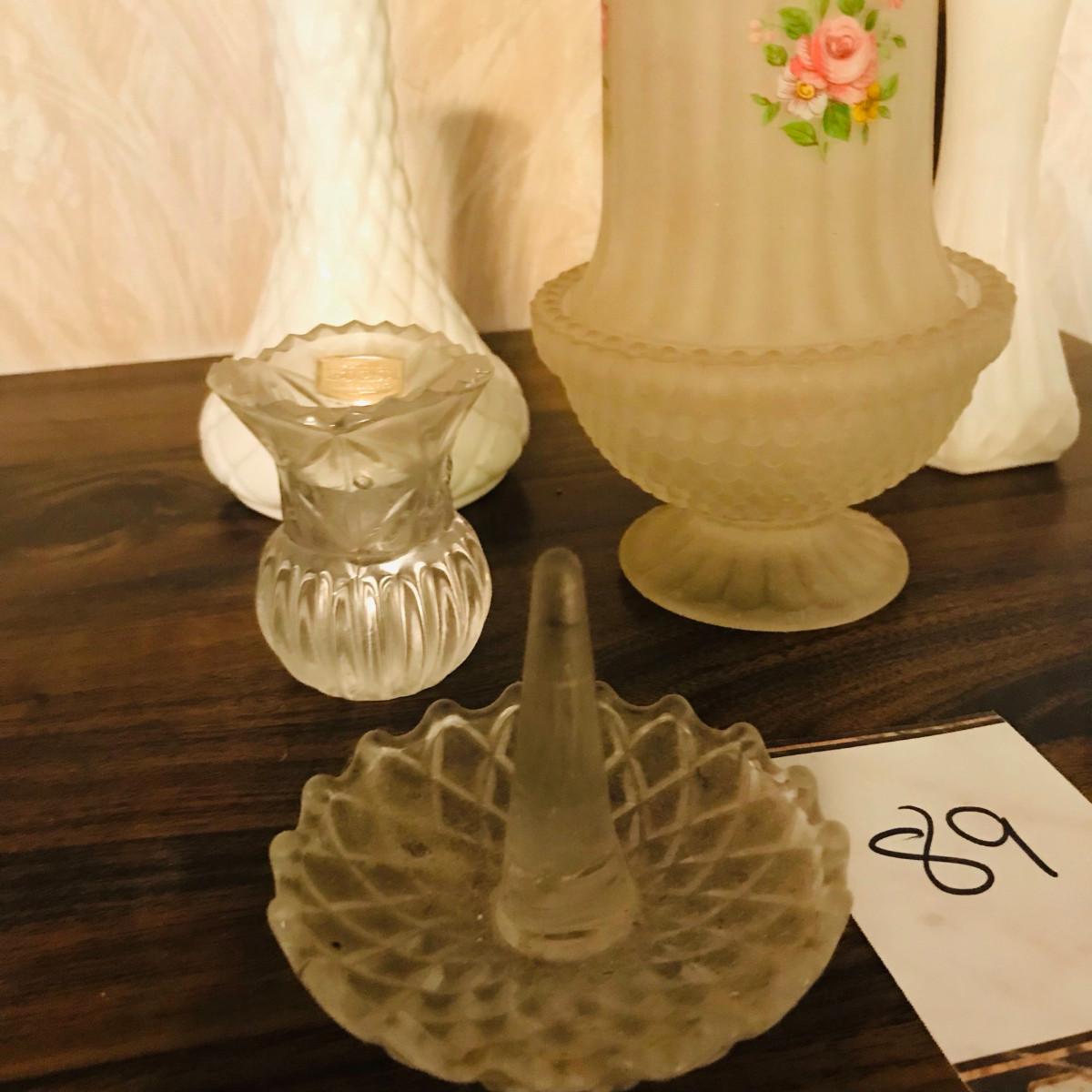 Nice lot of mini vases, fairy lamp, & milk glass vases + ring holder