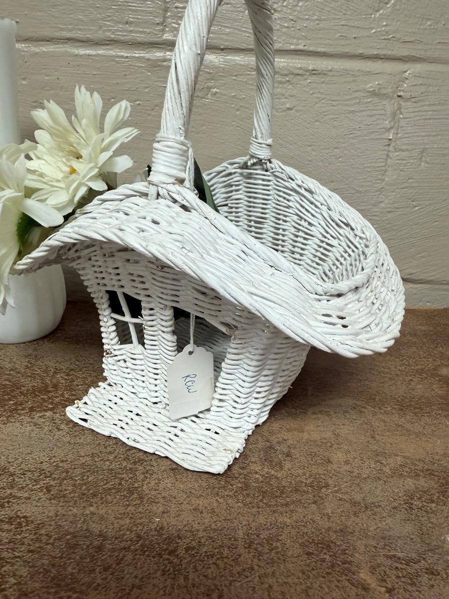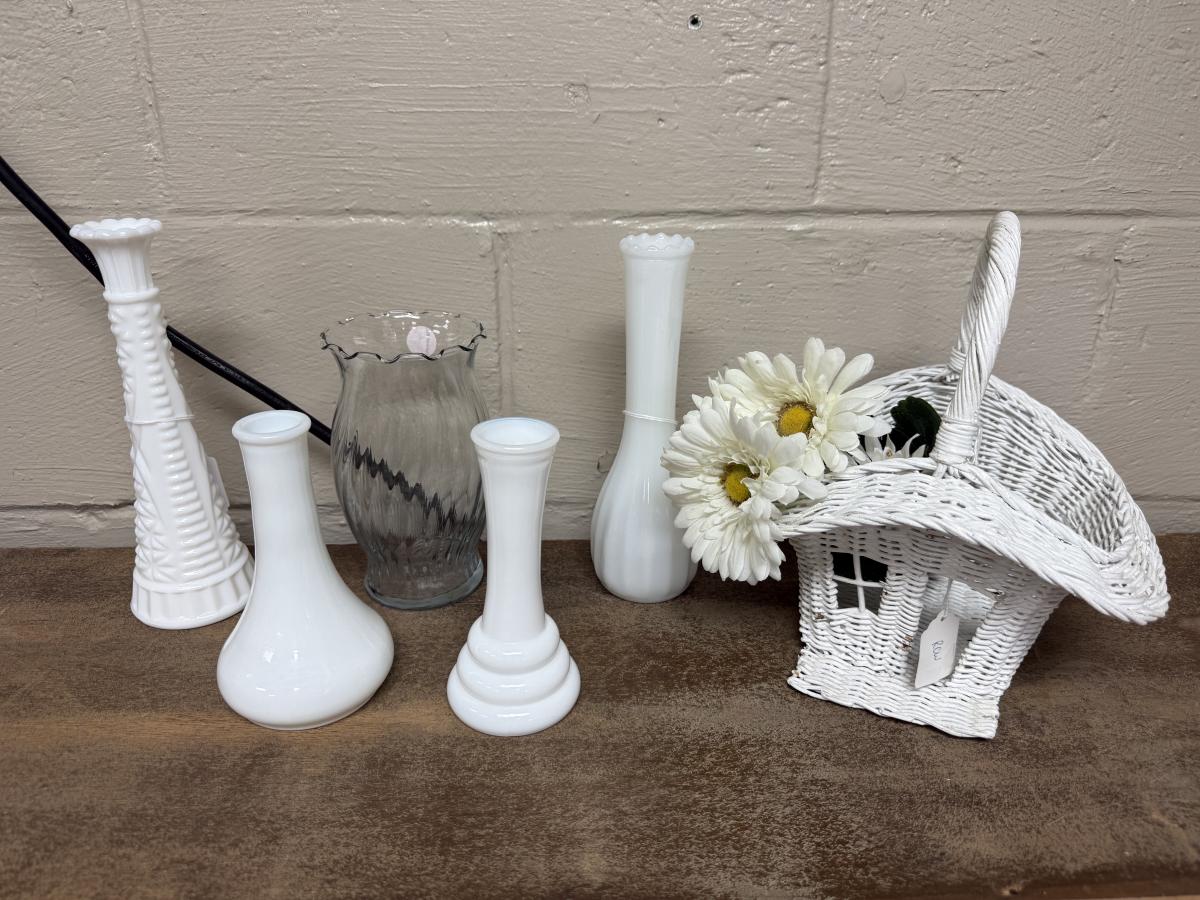 Milk glass vases, white & clear glass vases, wicker birdhouse basket (flowers not included)
