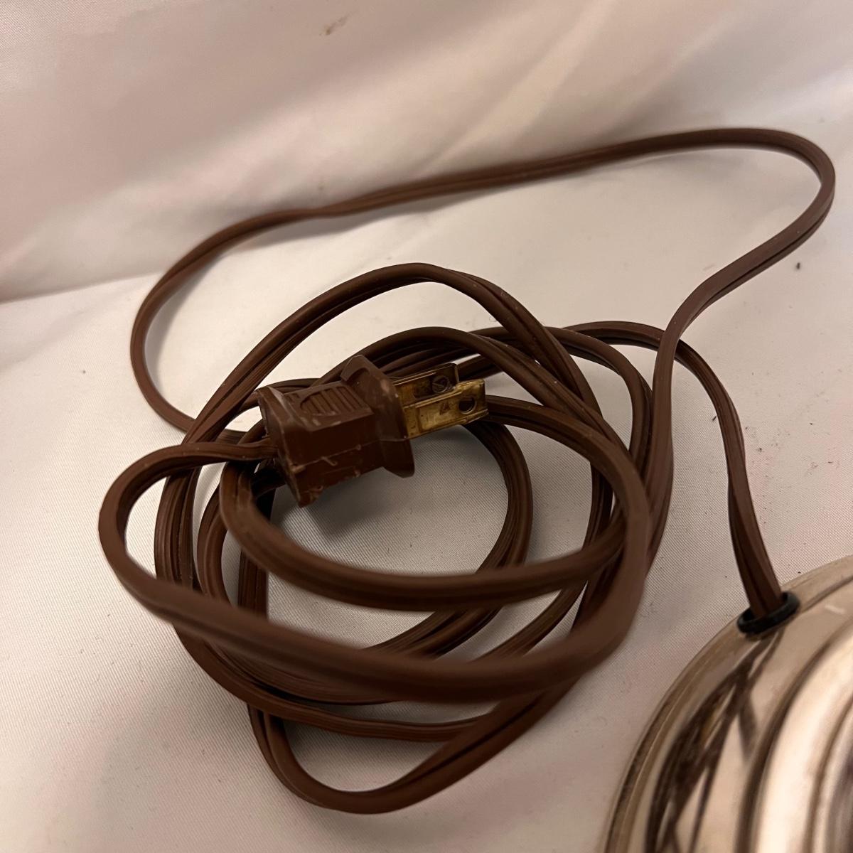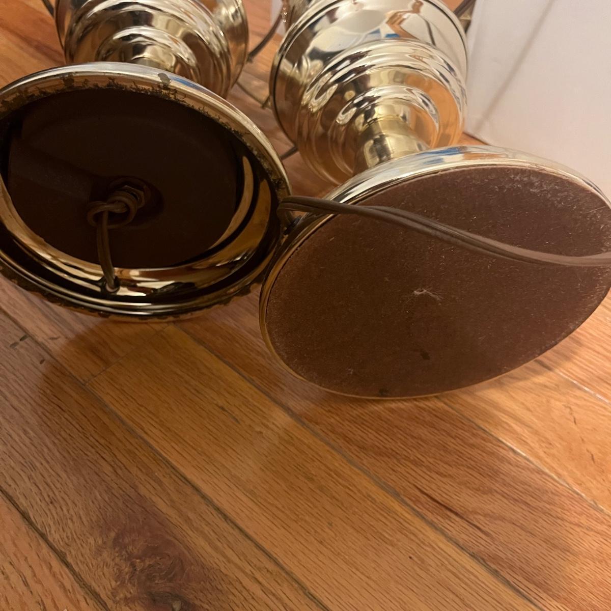 This lot includes two identical vintage lamps with milk glass lampshades and a brass plated base. You can use the lamp without the lampshades to reveal the champagne glass - see picture included. They both measure 8” x 20”H. Both powered on when plugged in and have on off switch.
