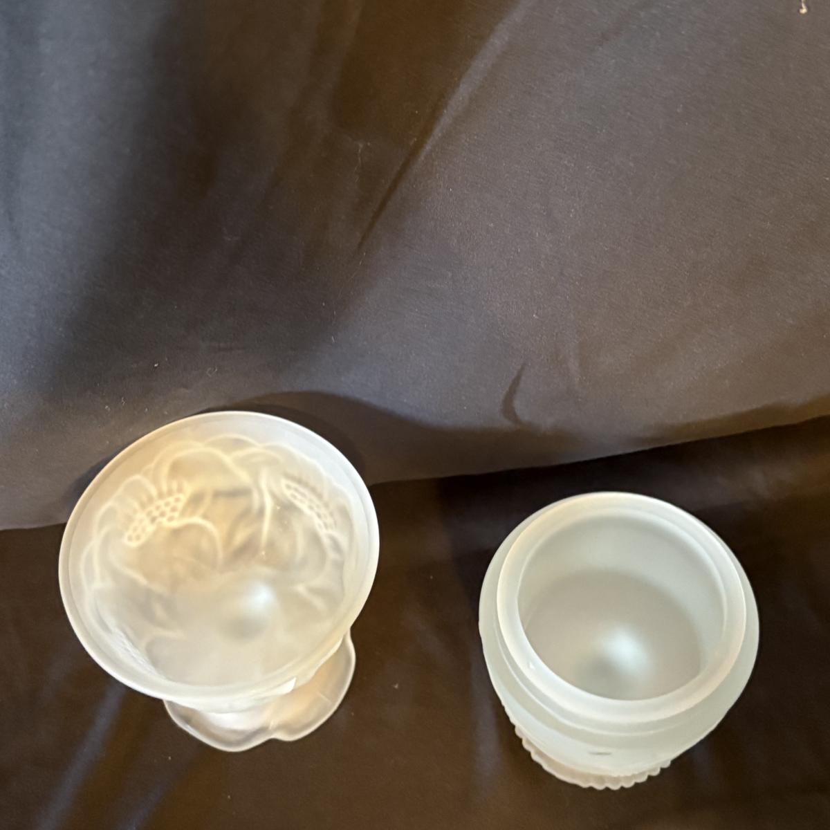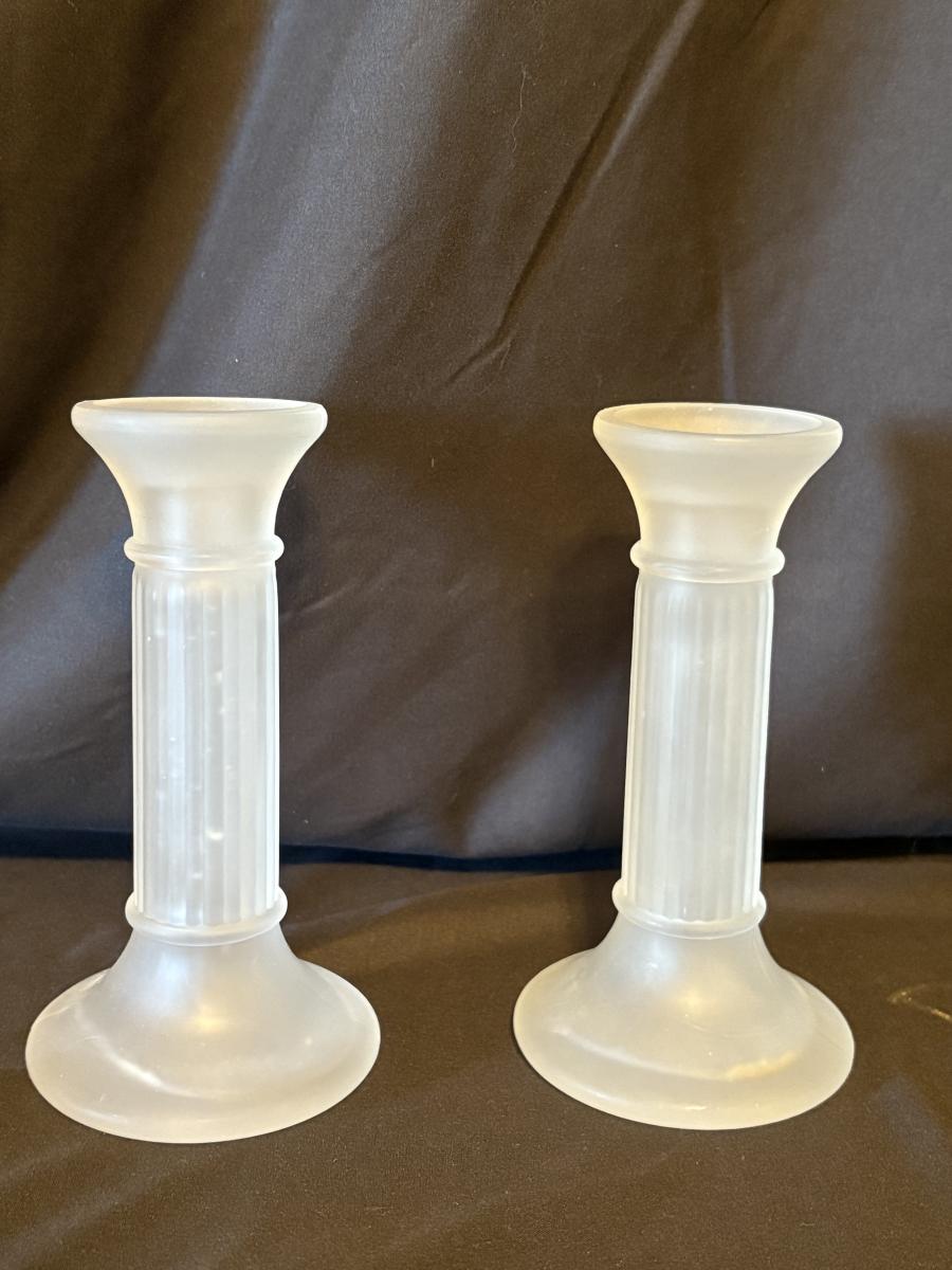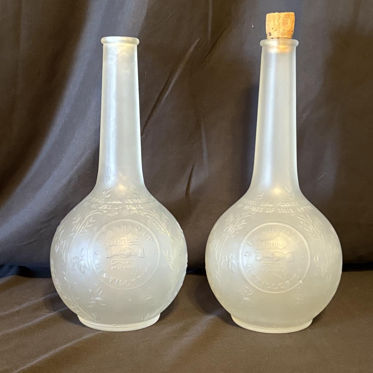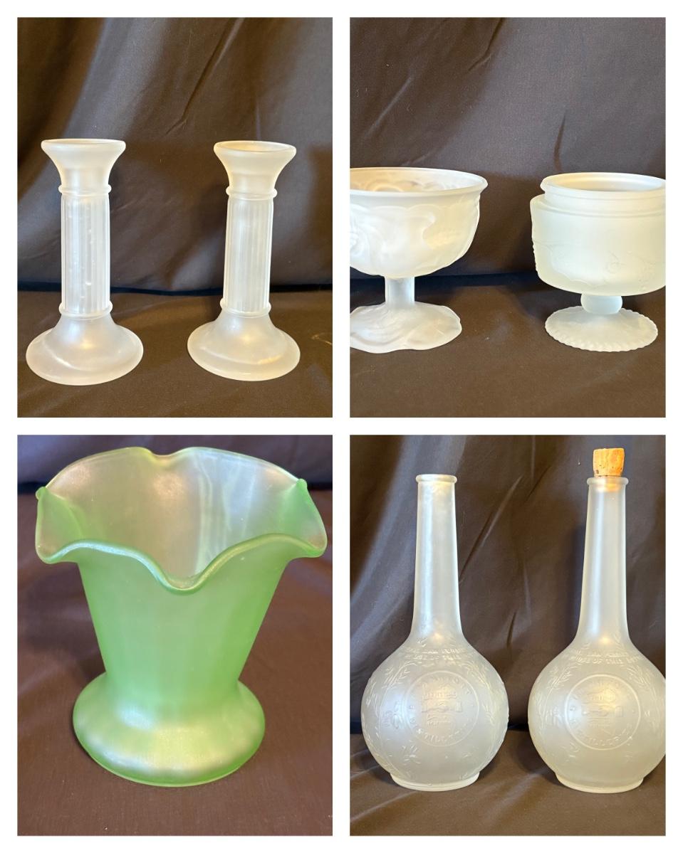 This 10 piece collection includes a green vase, a set of candlestick holders, two pedestal bowls, two cups, a bowl, and two Frankfort Distilleries bourbon whisky decanters. The bottles measure at approximately 3"D from the base and 11"H. Only one bottle has a cork intact. The green vase measures at 5"D x 5"H. Several pieces contain blemishes, see pictures for details.