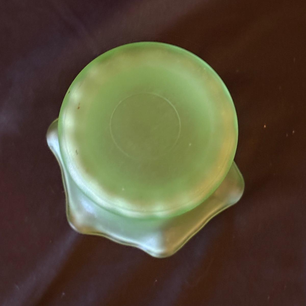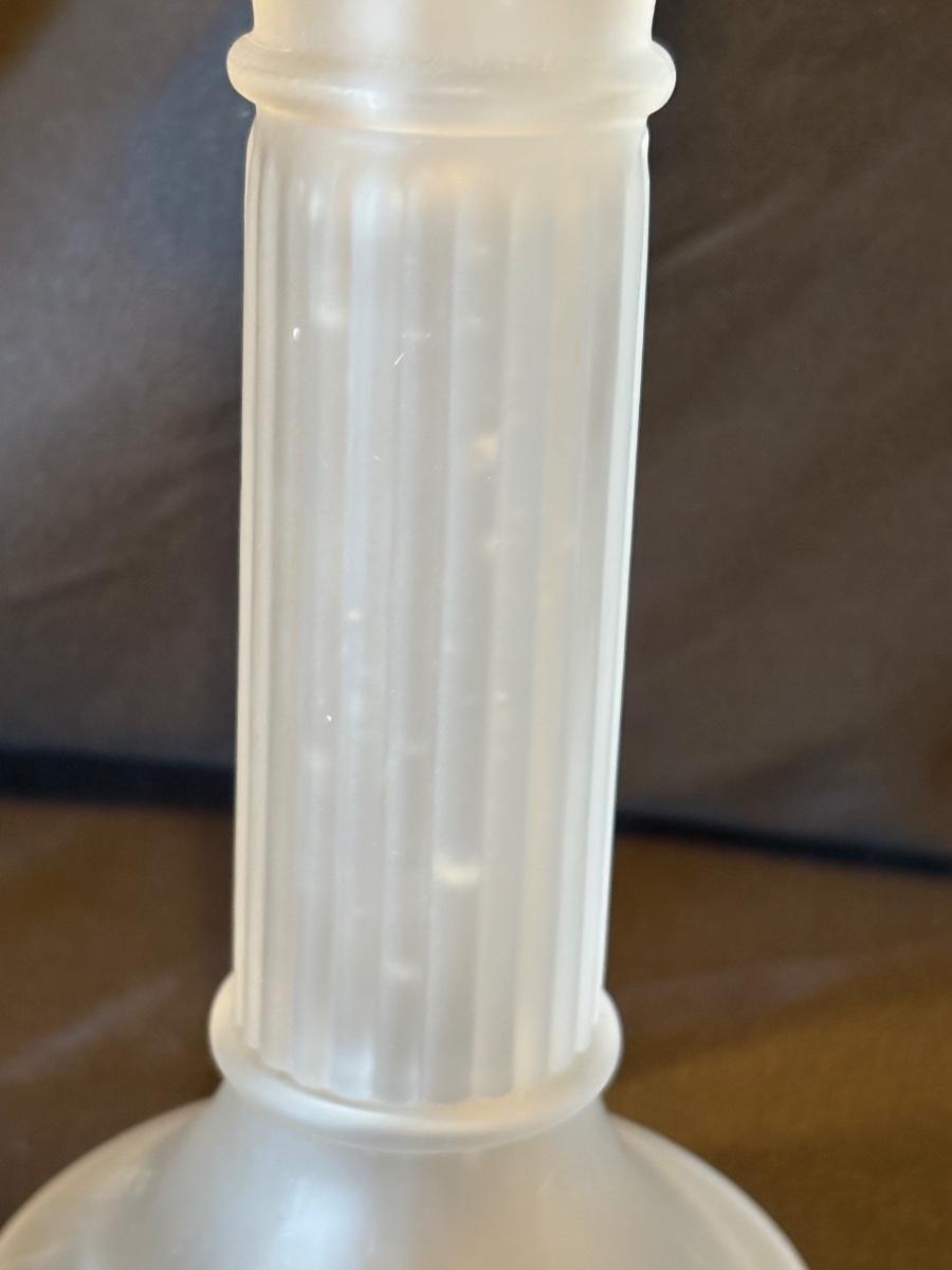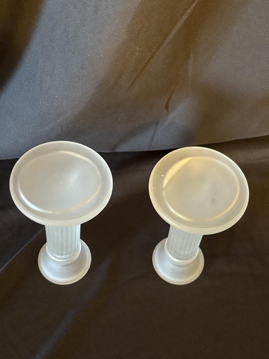 This 10 piece collection includes a green vase, a set of candlestick holders, two pedestal bowls, two cups, a bowl, and two Frankfort Distilleries bourbon whisky decanters. The bottles measure at approximately 3"D from the base and 11"H. Only one bottle has a cork intact. The green vase measures at 5"D x 5"H. Several pieces contain blemishes, see pictures for details.