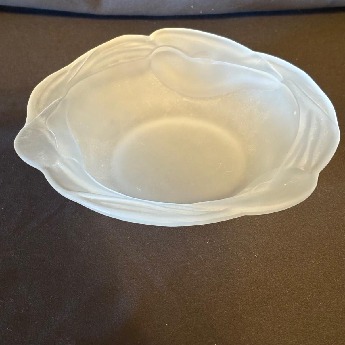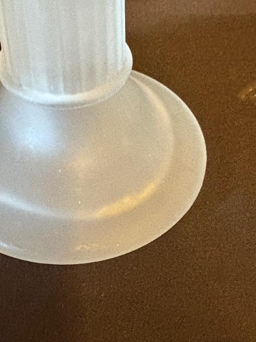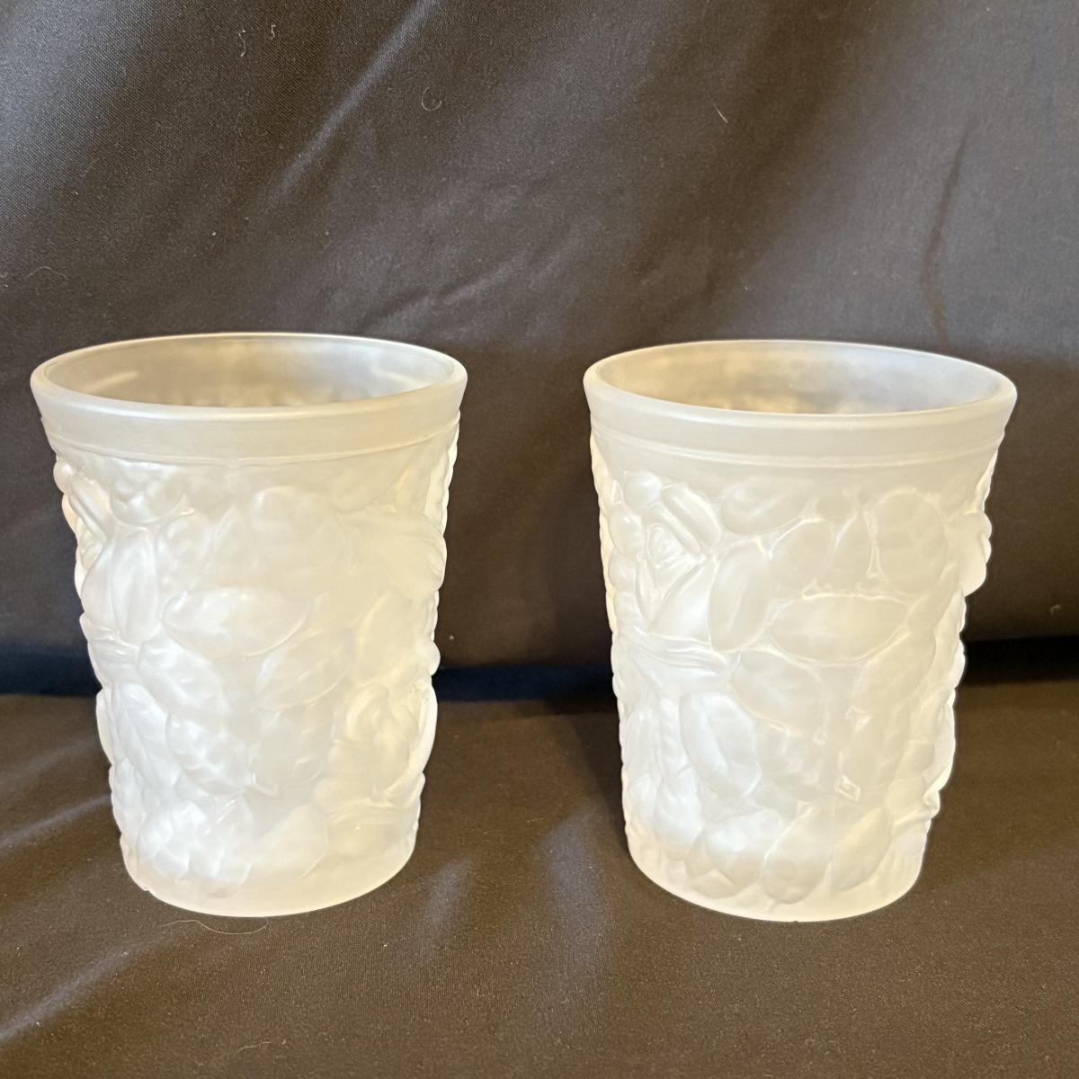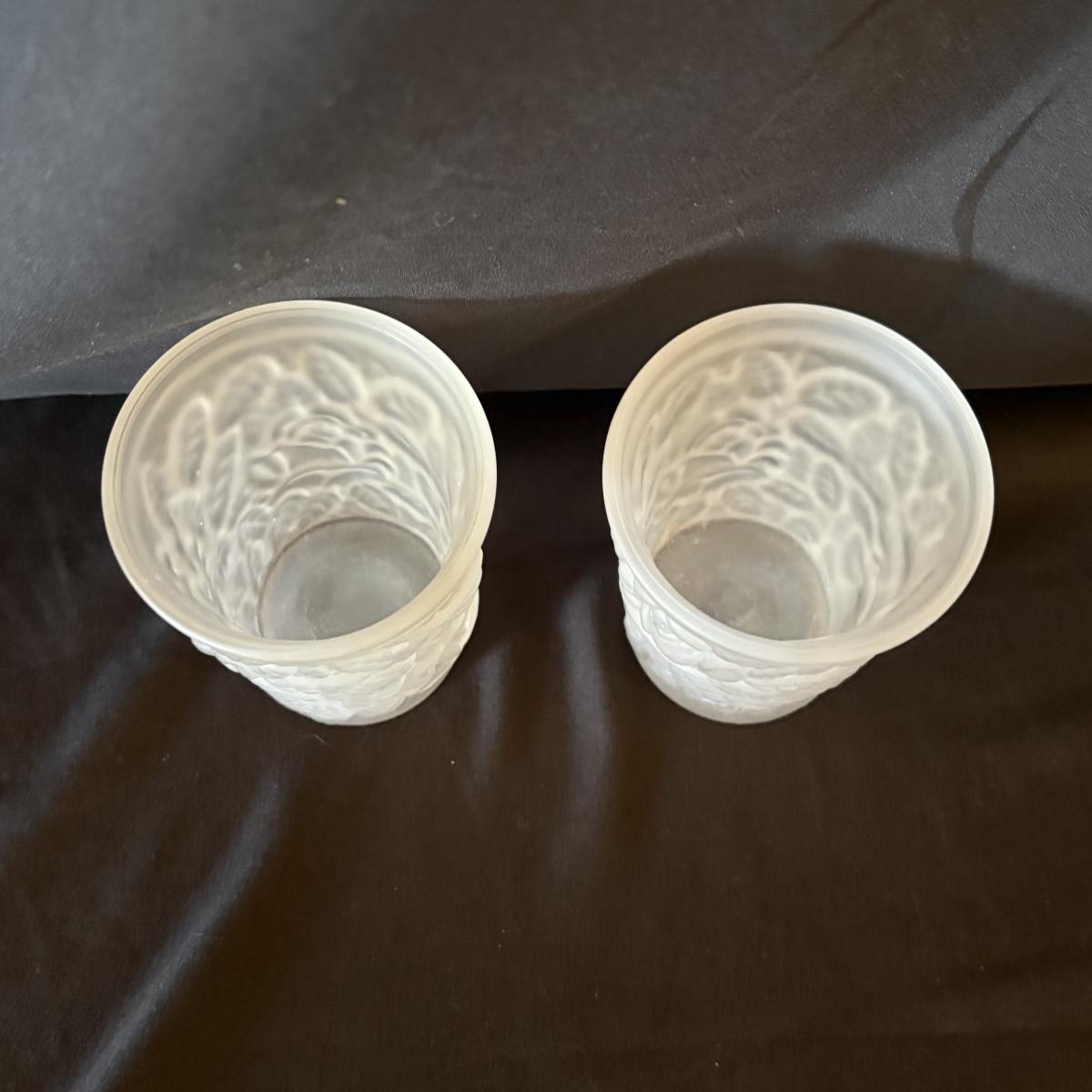 This 10 piece collection includes a green vase, a set of candlestick holders, two pedestal bowls, two cups, a bowl, and two Frankfort Distilleries bourbon whisky decanters. The bottles measure at approximately 3"D from the base and 11"H. Only one bottle has a cork intact. The green vase measures at 5"D x 5"H. Several pieces contain blemishes, see pictures for details.