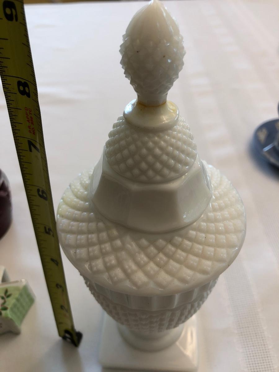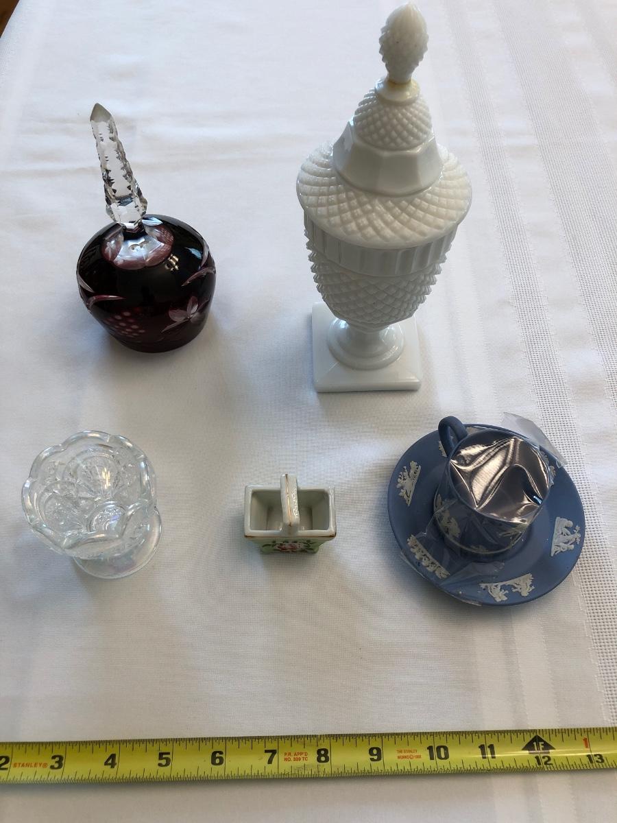 5 pieces: The colored glass is a bell. The milk glass lid has a "10-foot repair." It looks fine from ten feet away.