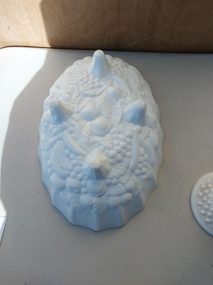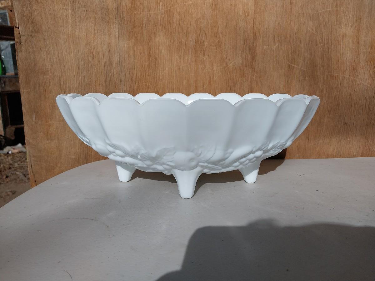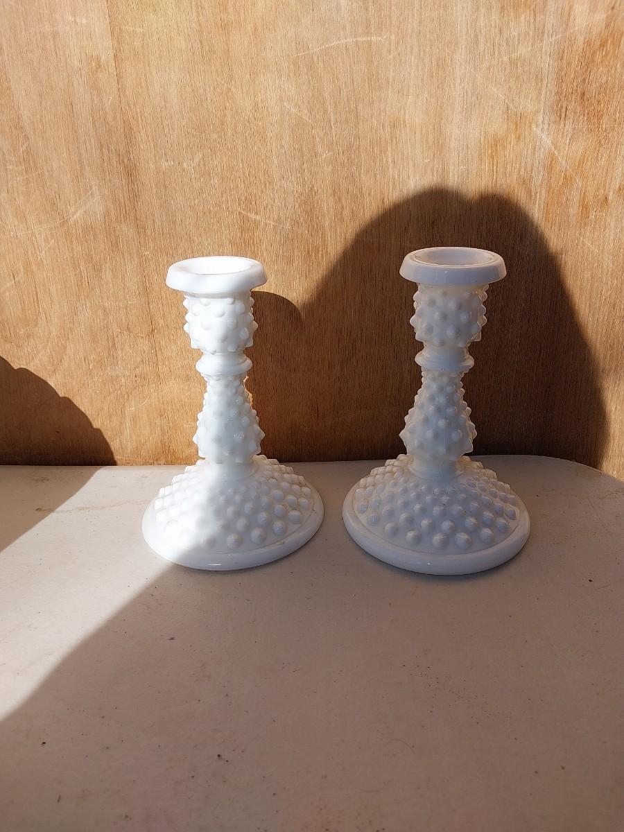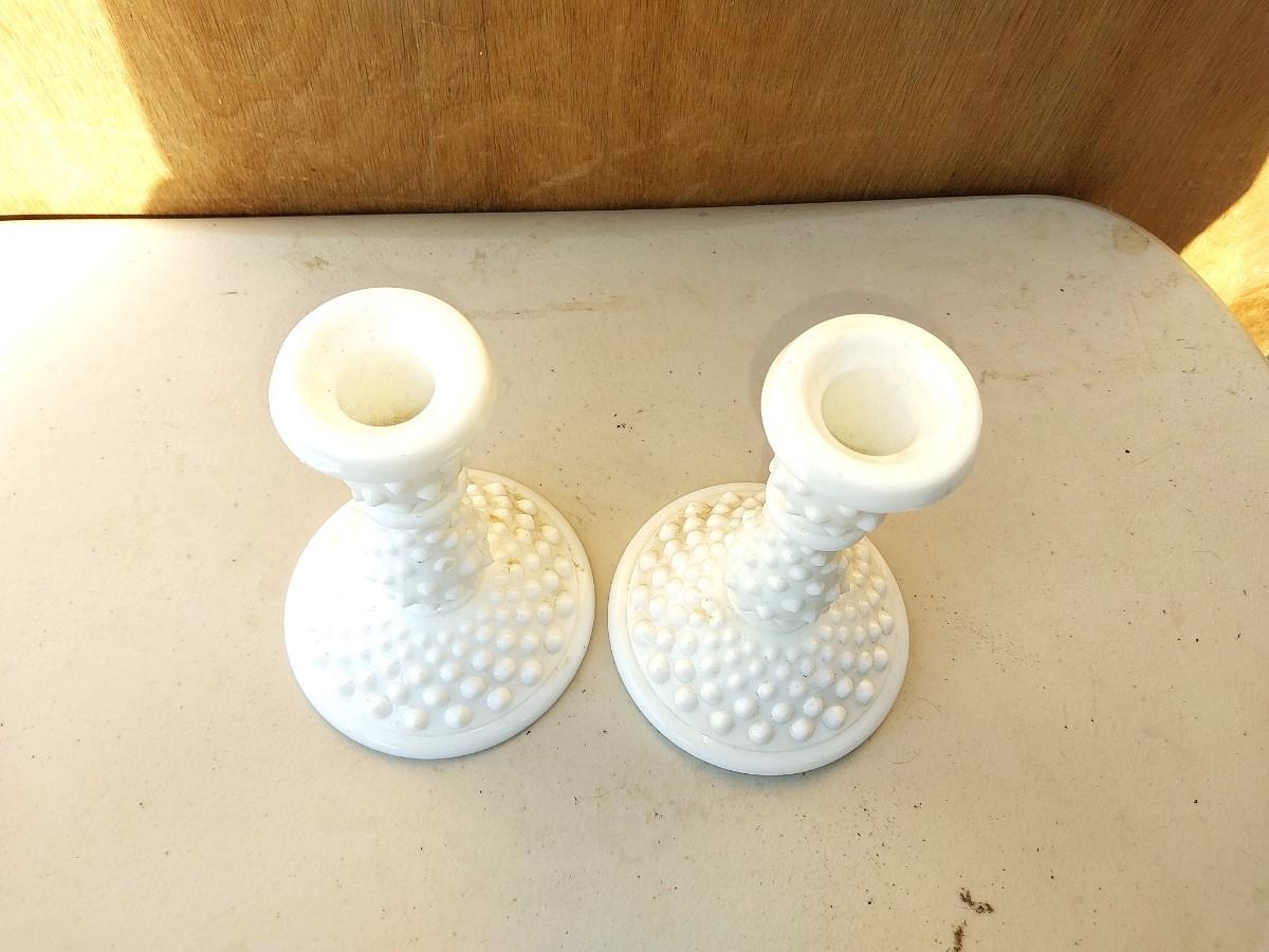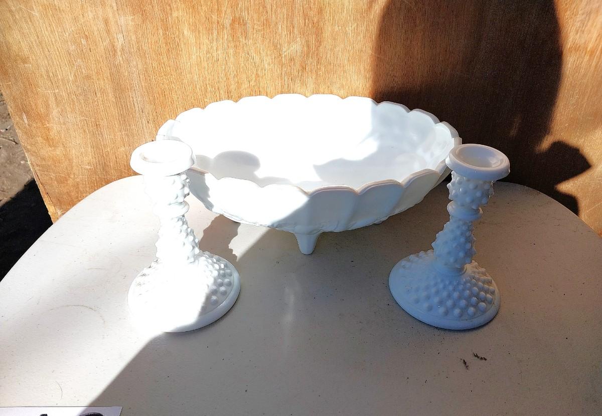 MILKGLASS BOWL AND PAIR CANDLE HOLDERS