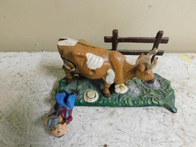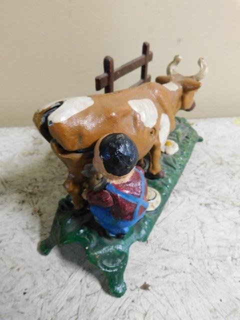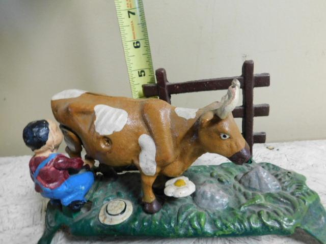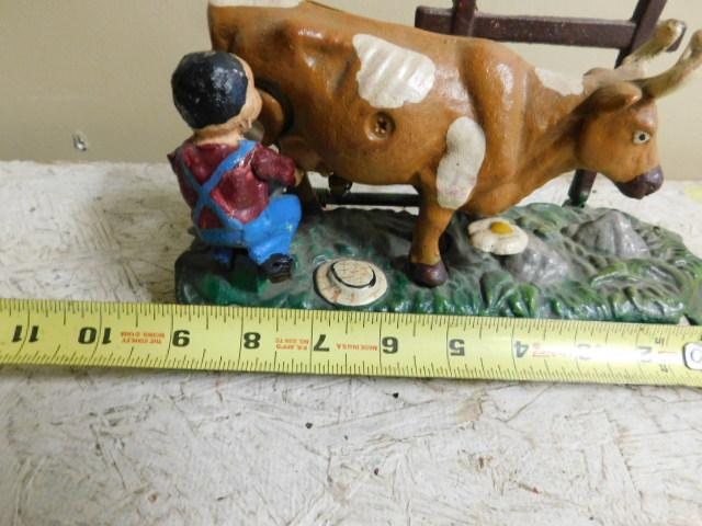 Milking Farmer Cast Iron Coin Bank from Book of Knowledge cow has tail missing