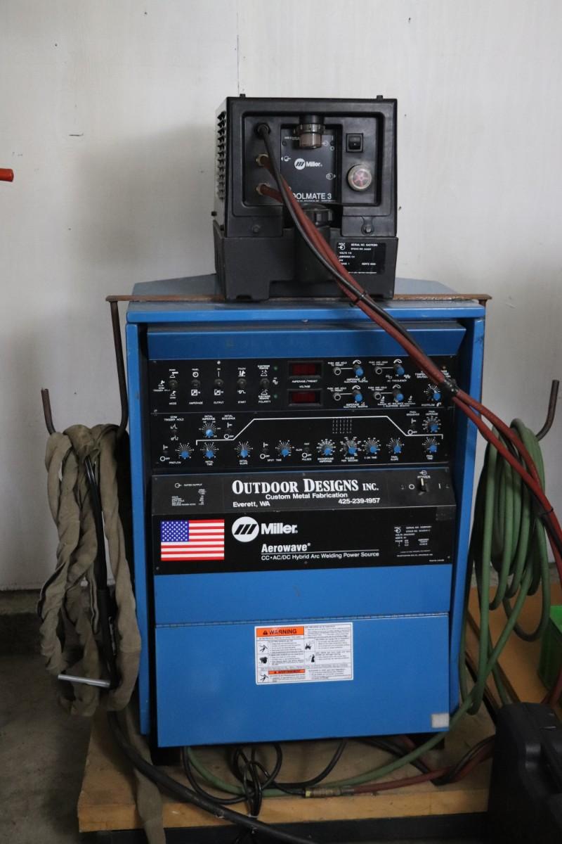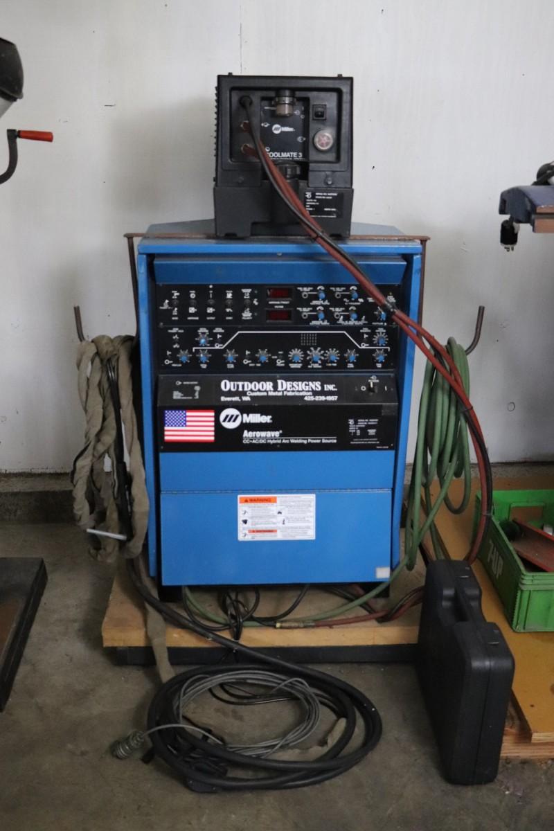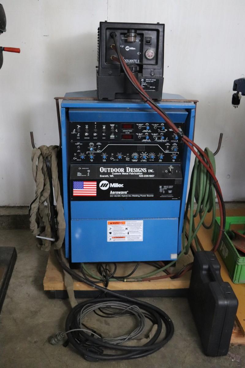 Miller Aerowave 300 AC/DC Hybrid Arc Welding Power Source with Miller Coolmate 3 coolant system. Includes all attached cables. Not tested, but believed to be in working condition.
