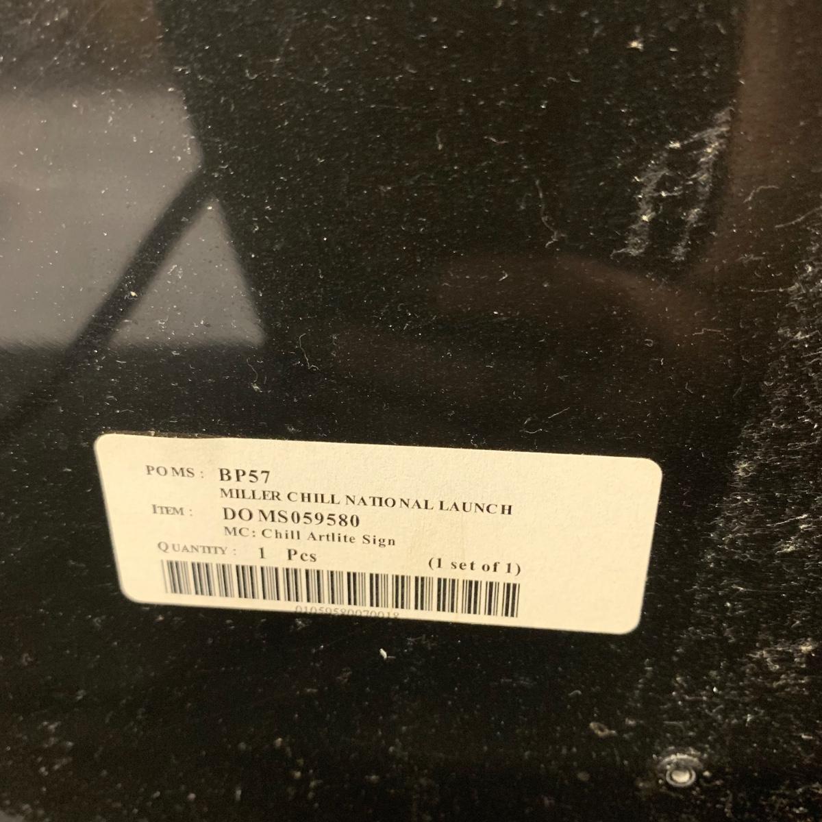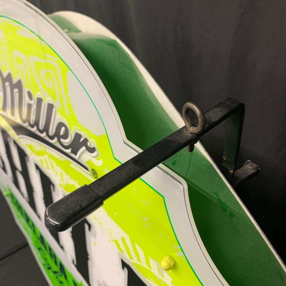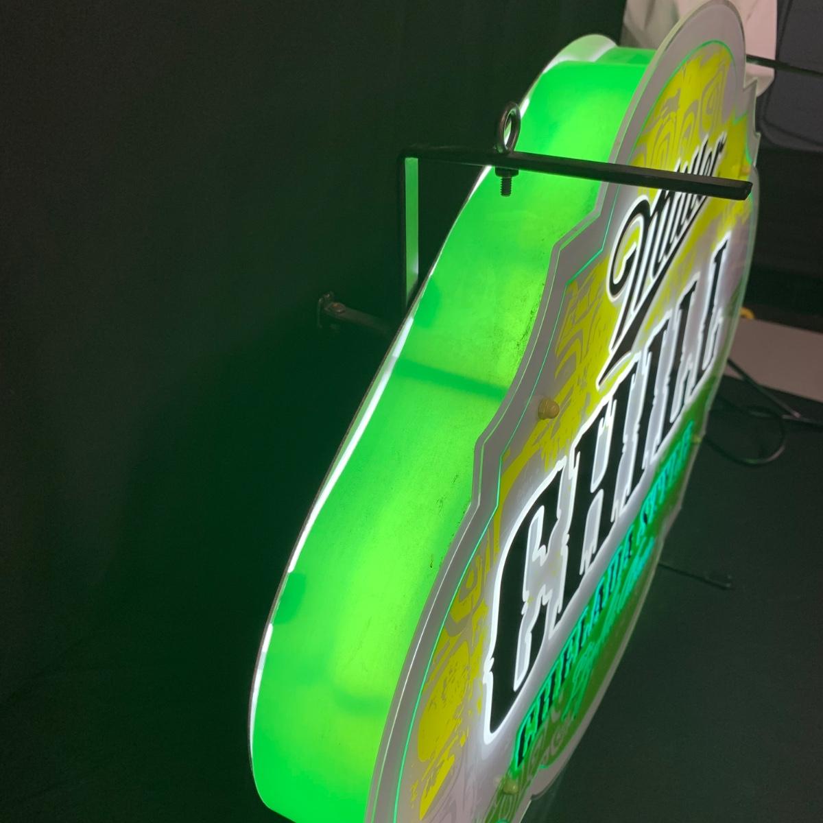 Miller Chill Chelada Style Light Beer Artlite sign. Measures 30.5” x 8” x 22.5”. Sign turned on when tested. It has a pull chain to turn the light on or off. It has a three-prong electric plug. The sign is a bit dusty. There are hooks attached to the top bars for hanging from the ceiling and to the back for hanging on the wall. Shipping available. Shipping can be costly, we suggest calling our local UPS with dimensions and getting an estimate before bidding (828) 252-6930.