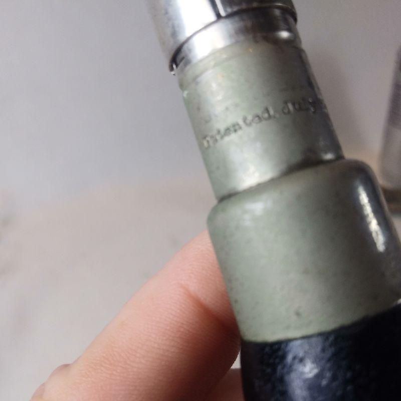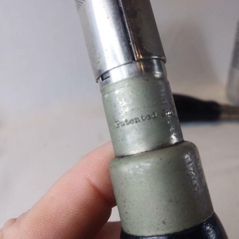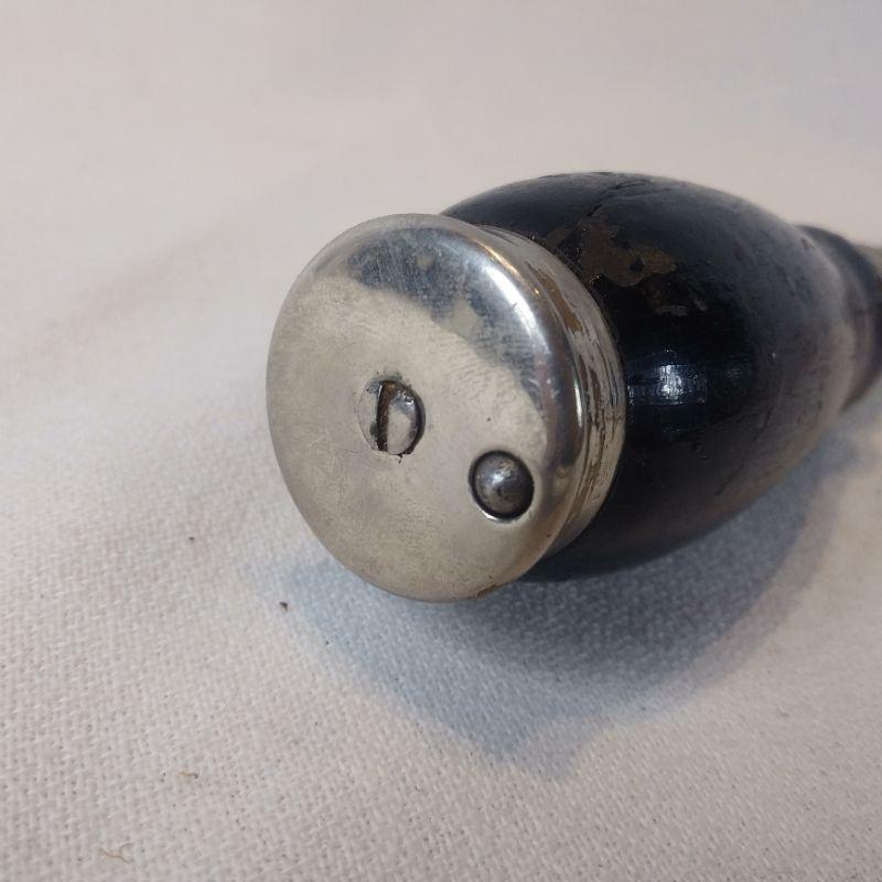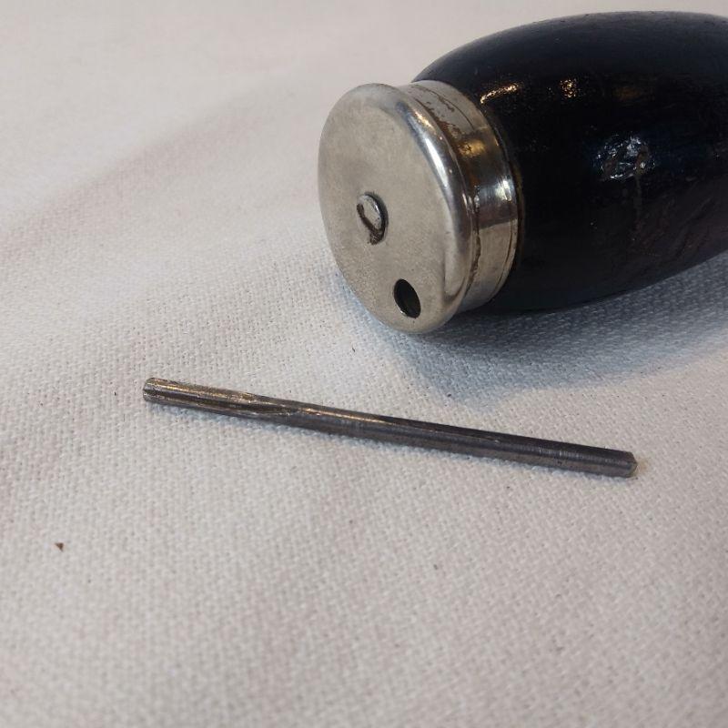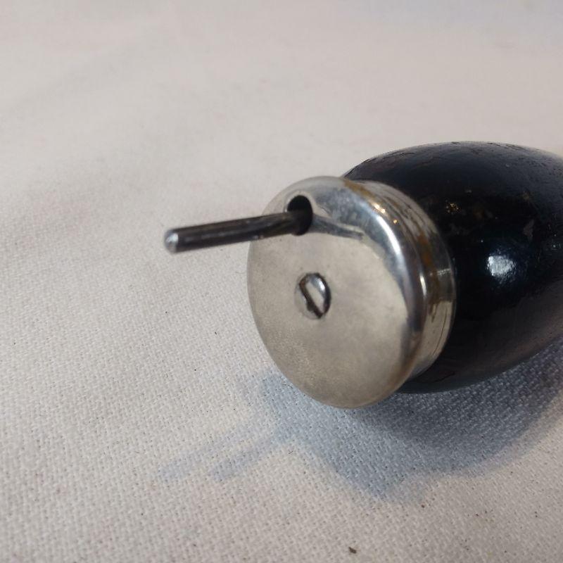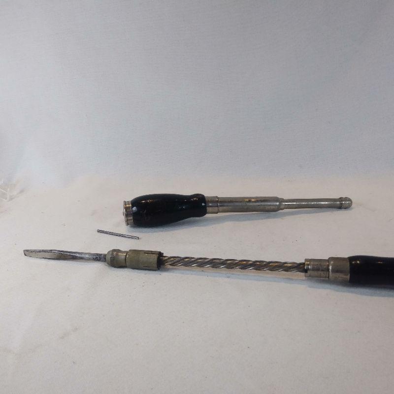 This offering is for two black wooden-handle ratchet tools. The ratchet with the screw driver is marked Miller Falls Co - Greenfield, Mass. Patented July 22, 1890 - Nov 17. 1891. The other is not marked but believed to be same maker. It has a metal screw on top to hold bits (has one). The handle is missing a screw or nail to sit properly on shaft - easily replaced. The ratchet mechanism works good on both of them.