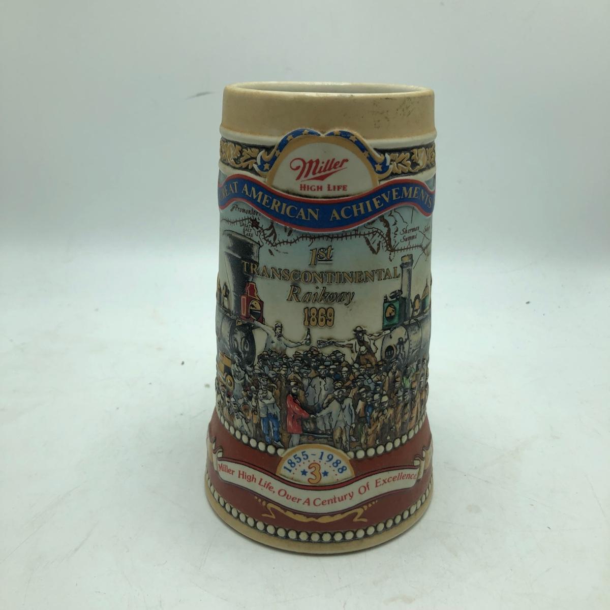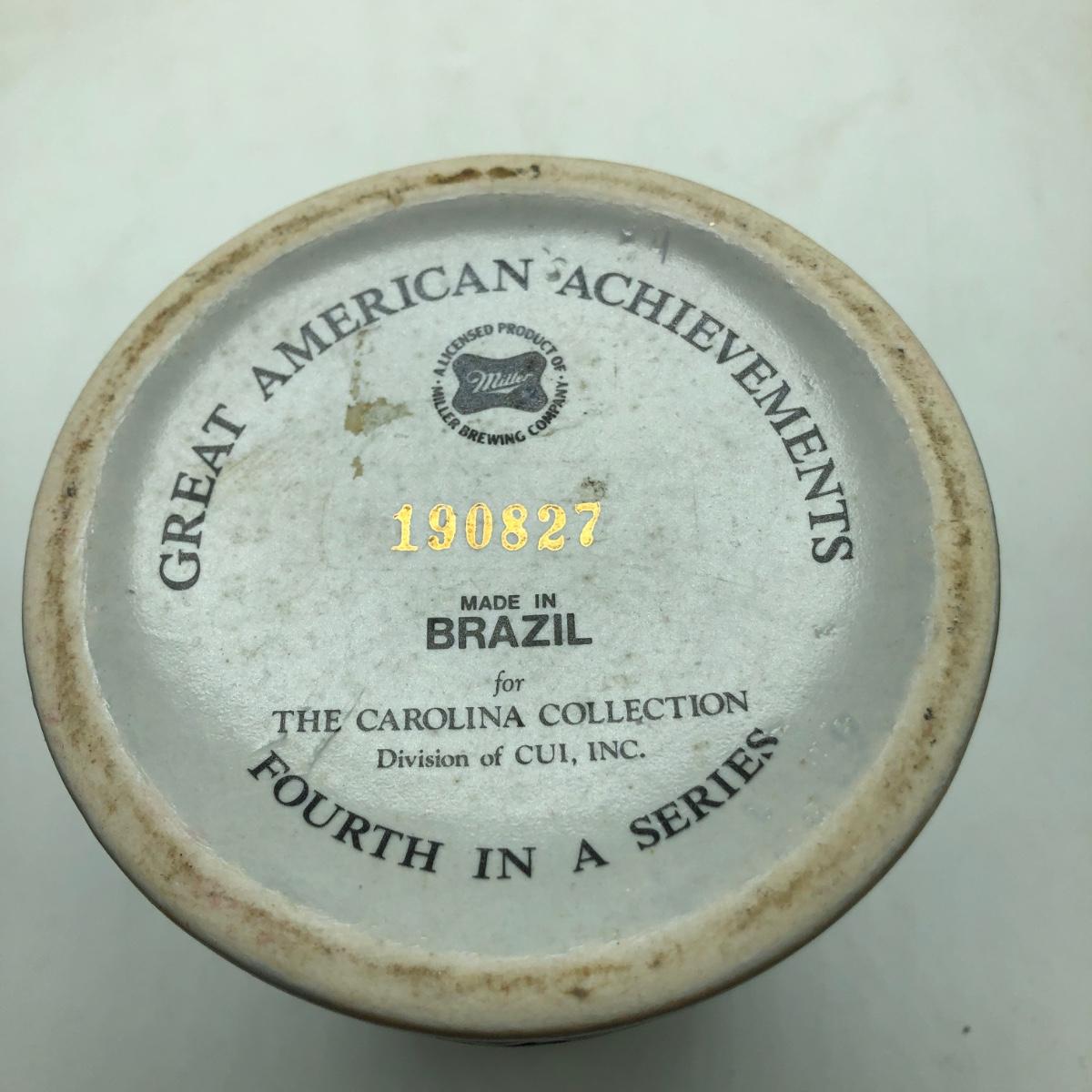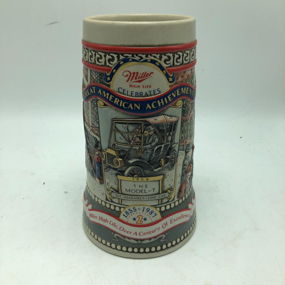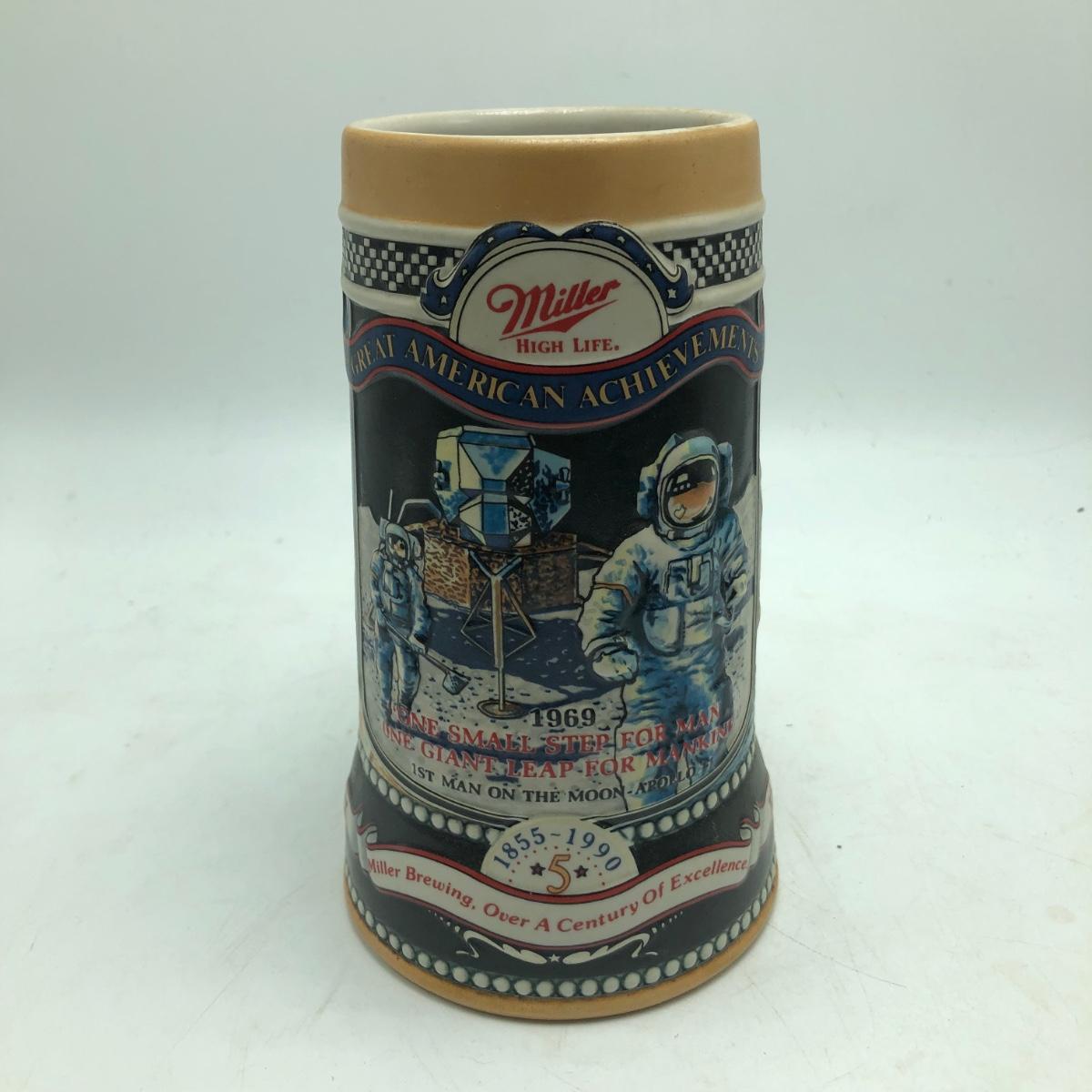 Lot includes five Miller Great American Achievements tankards celebrating five great accomplishments. Tankards measure 4” x 5.5” x 7”.