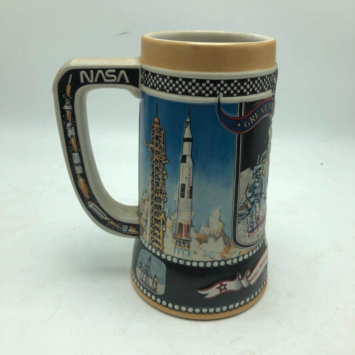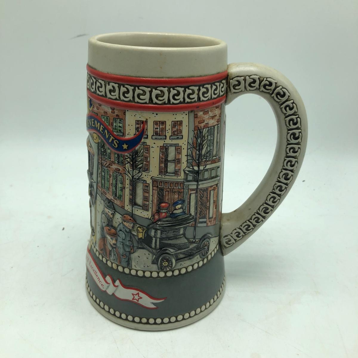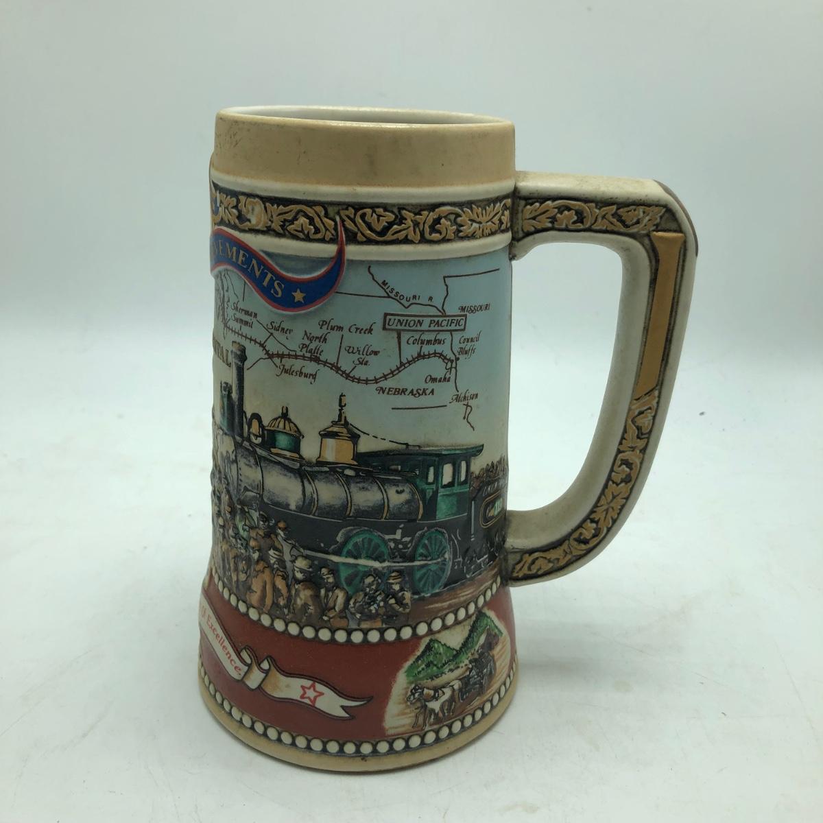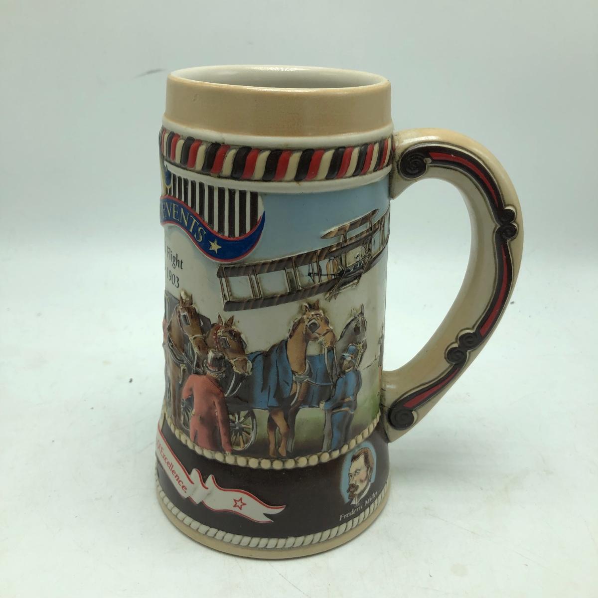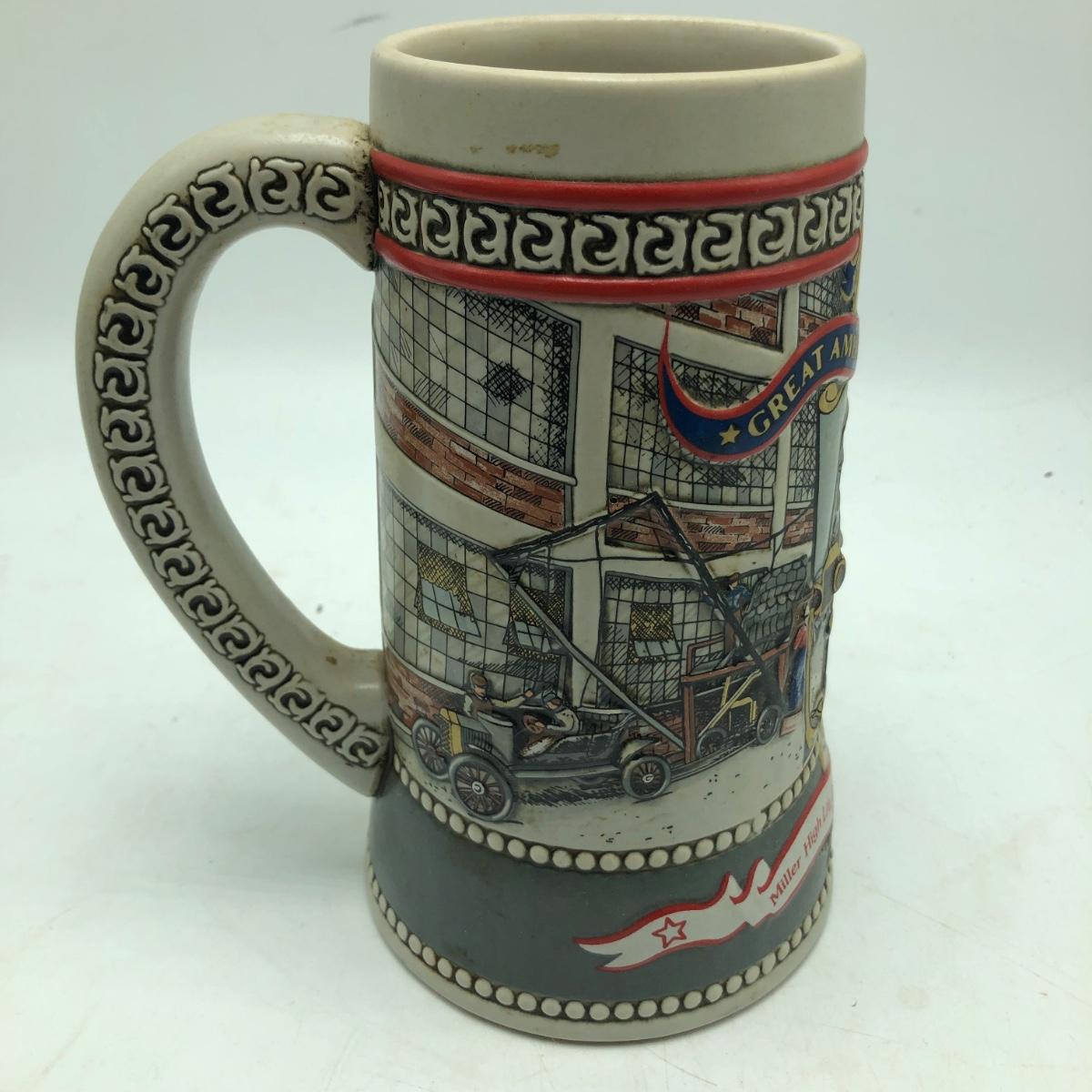 Lot includes five Miller Great American Achievements tankards celebrating five great accomplishments. Tankards measure 4” x 5.5” x 7”.