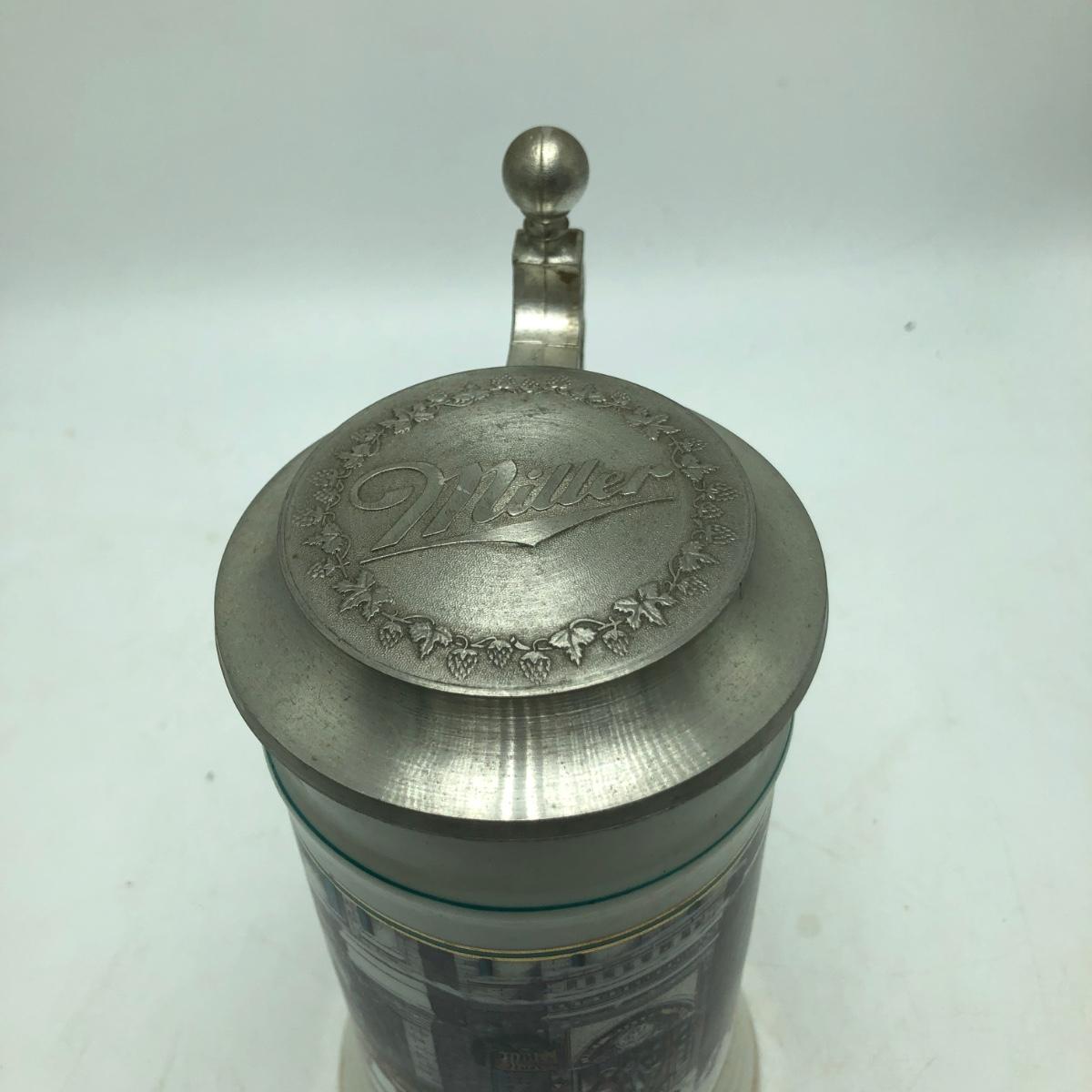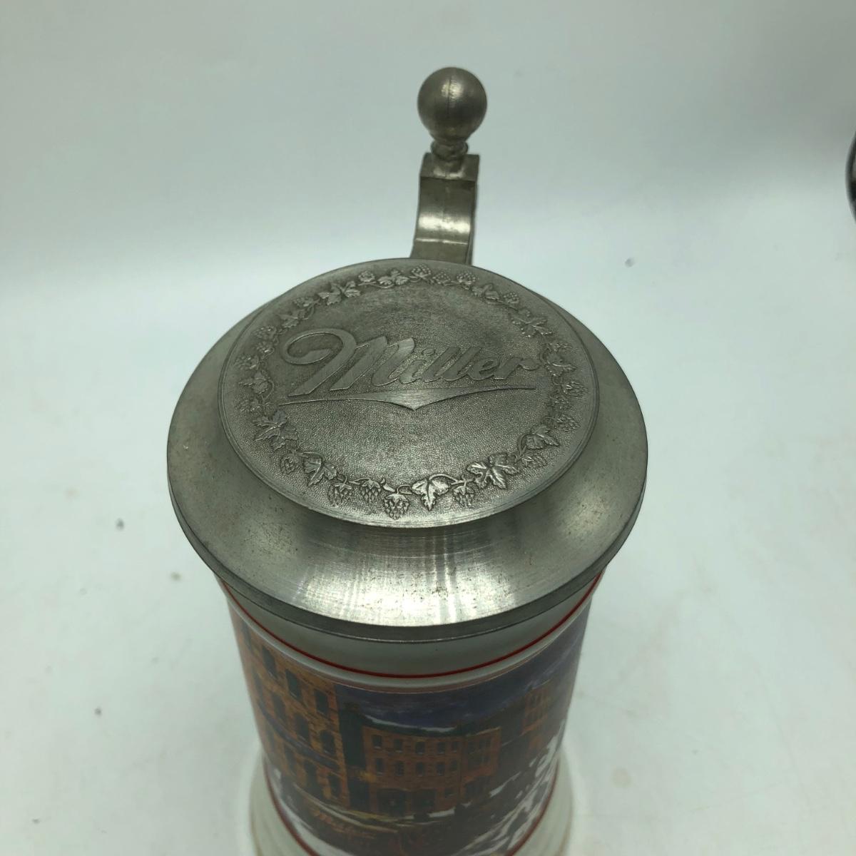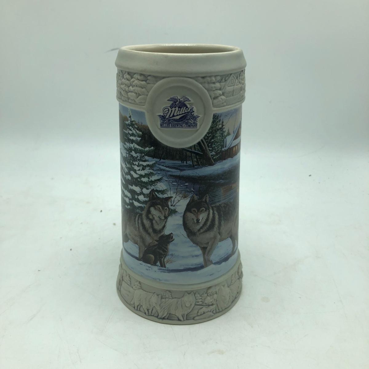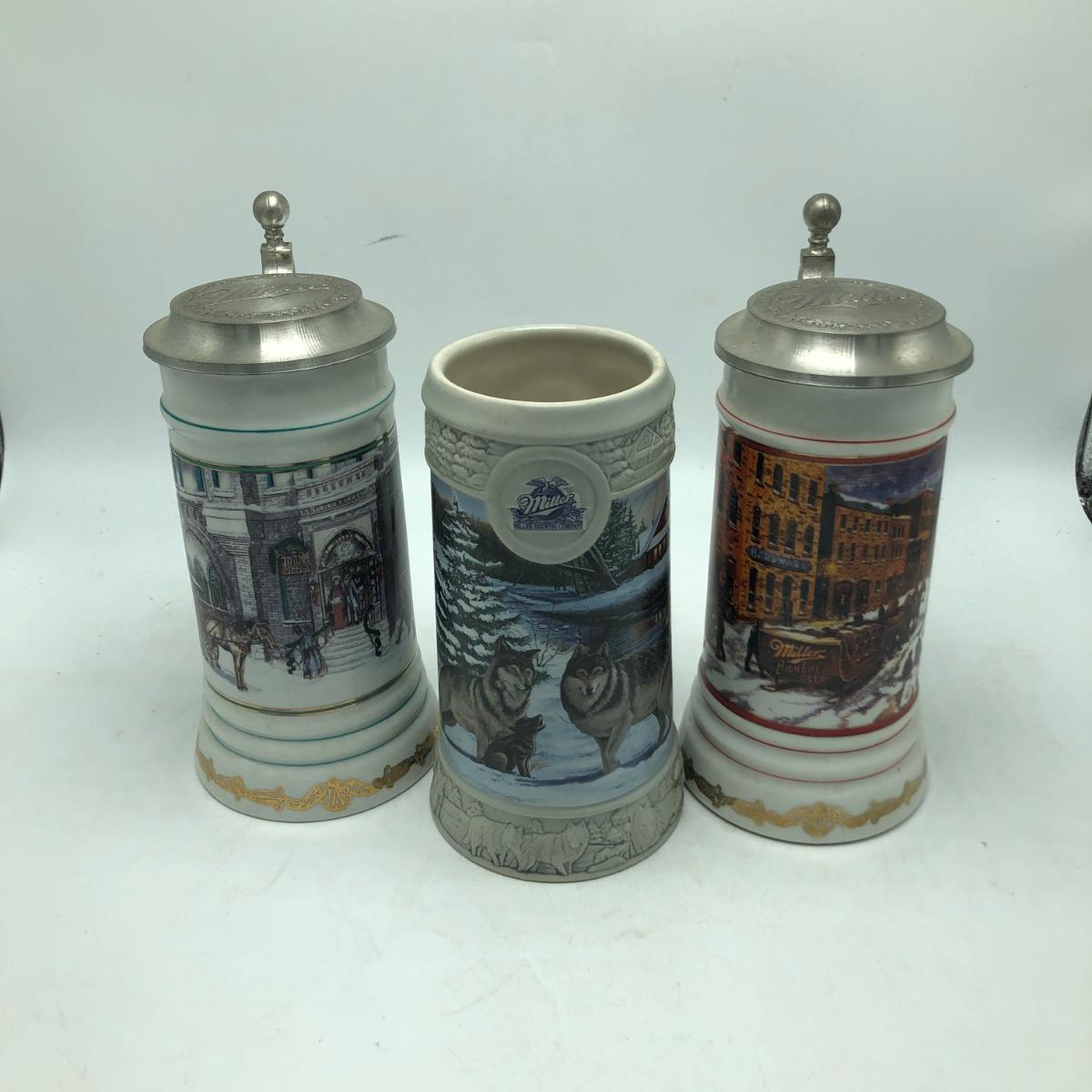 Lot includes two Miller Holiday Collection steins and a Miller Holiday tankard. Steins measure 4” x 5” x 8.5”.