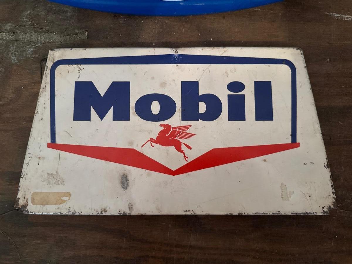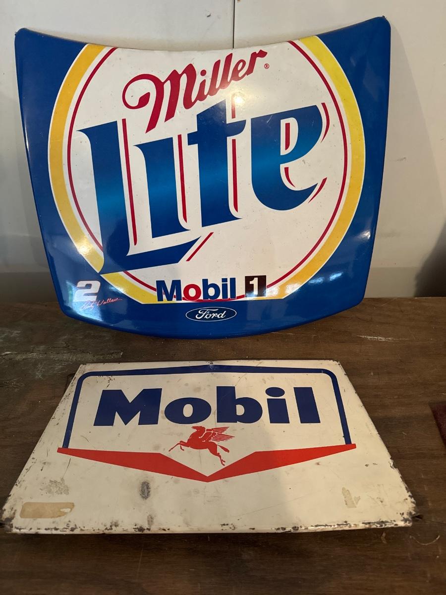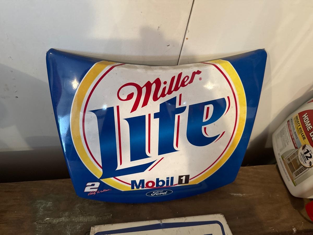 Miller light miniature hood and mobile gas station metal sign. The hood measures 15” w x 13” tall