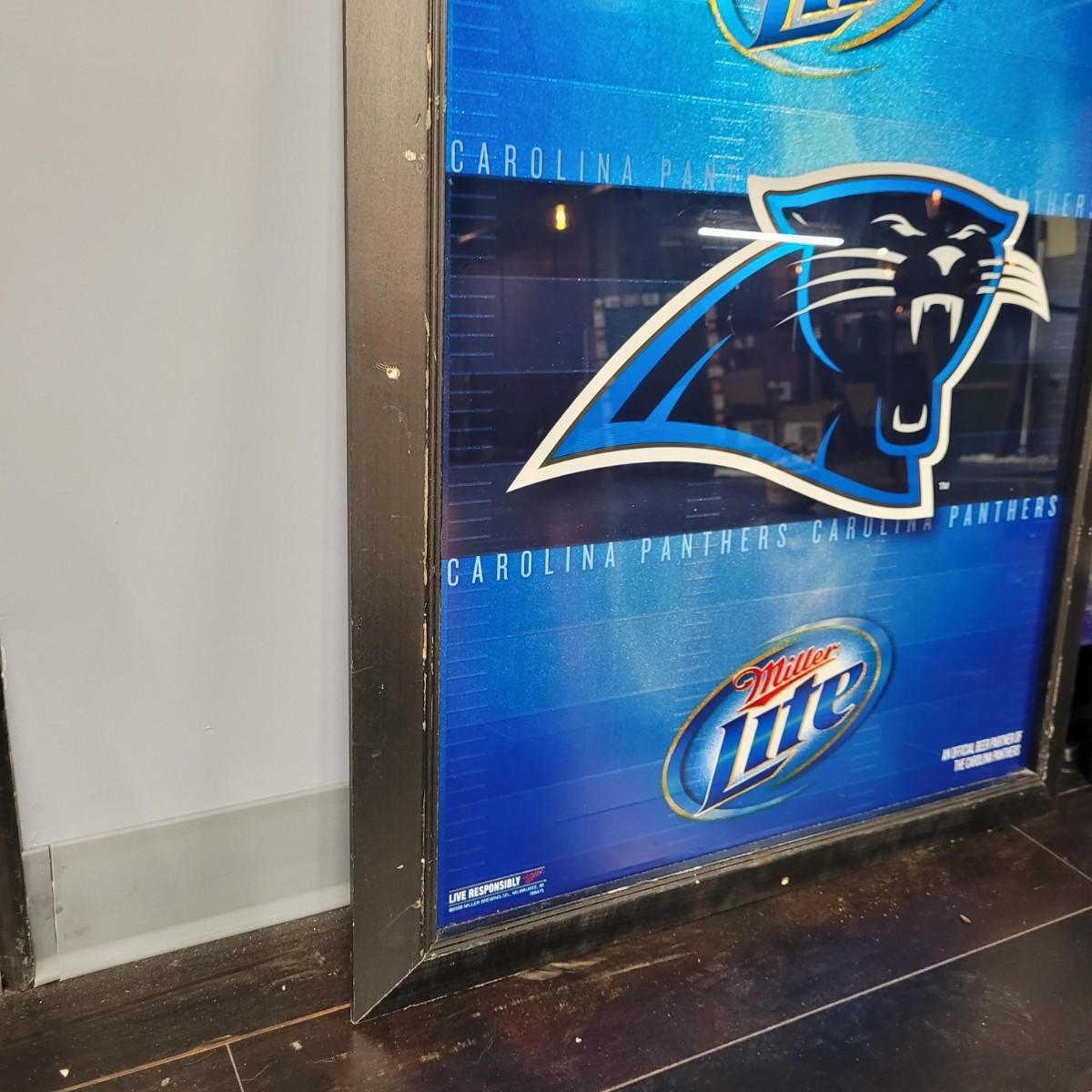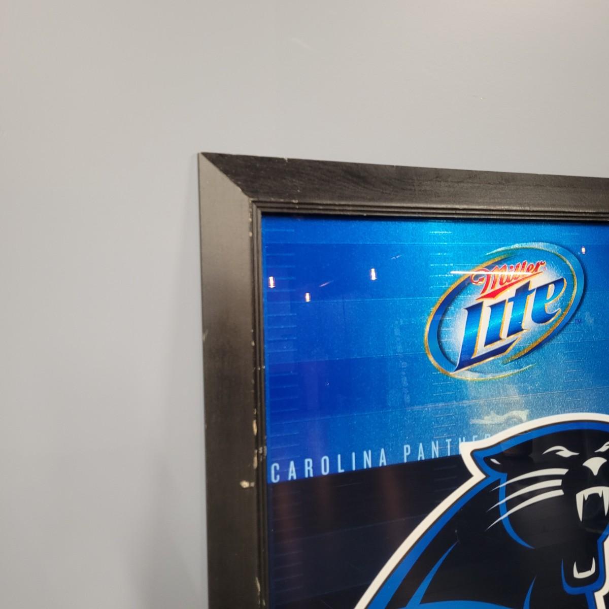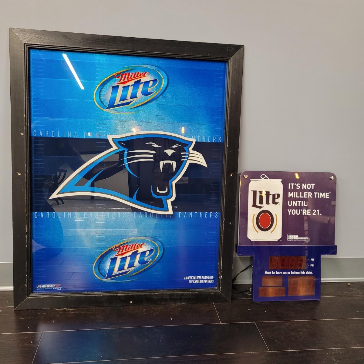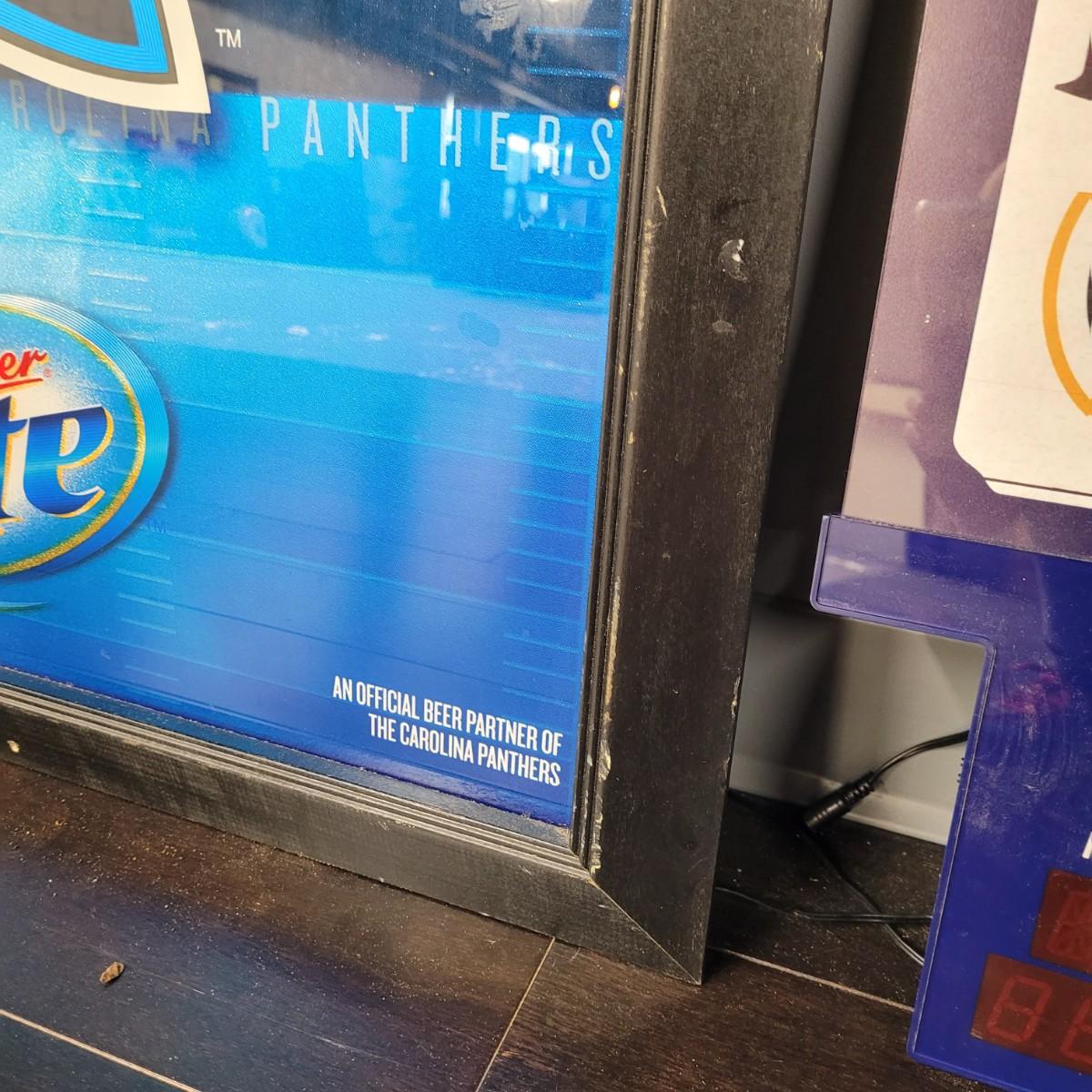 Miller Lite framed Carolina Panthers print. Normal wear and tear throughout frame (see pictures). Hanging wire attached. Measures approximately 28" x34". Digital legal age calendar is missing cord, can not confirm if it works. Measures approximately 14" x18.5". Shipping available. Shipping Art can be costly please call UPS store at 828-252-6930 for quote.