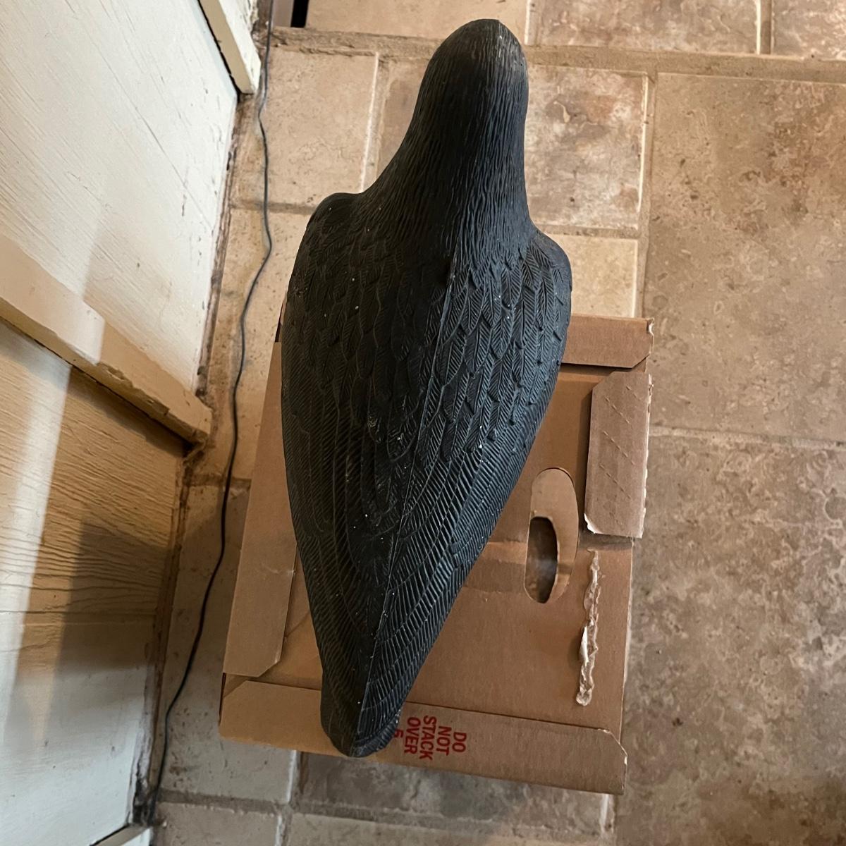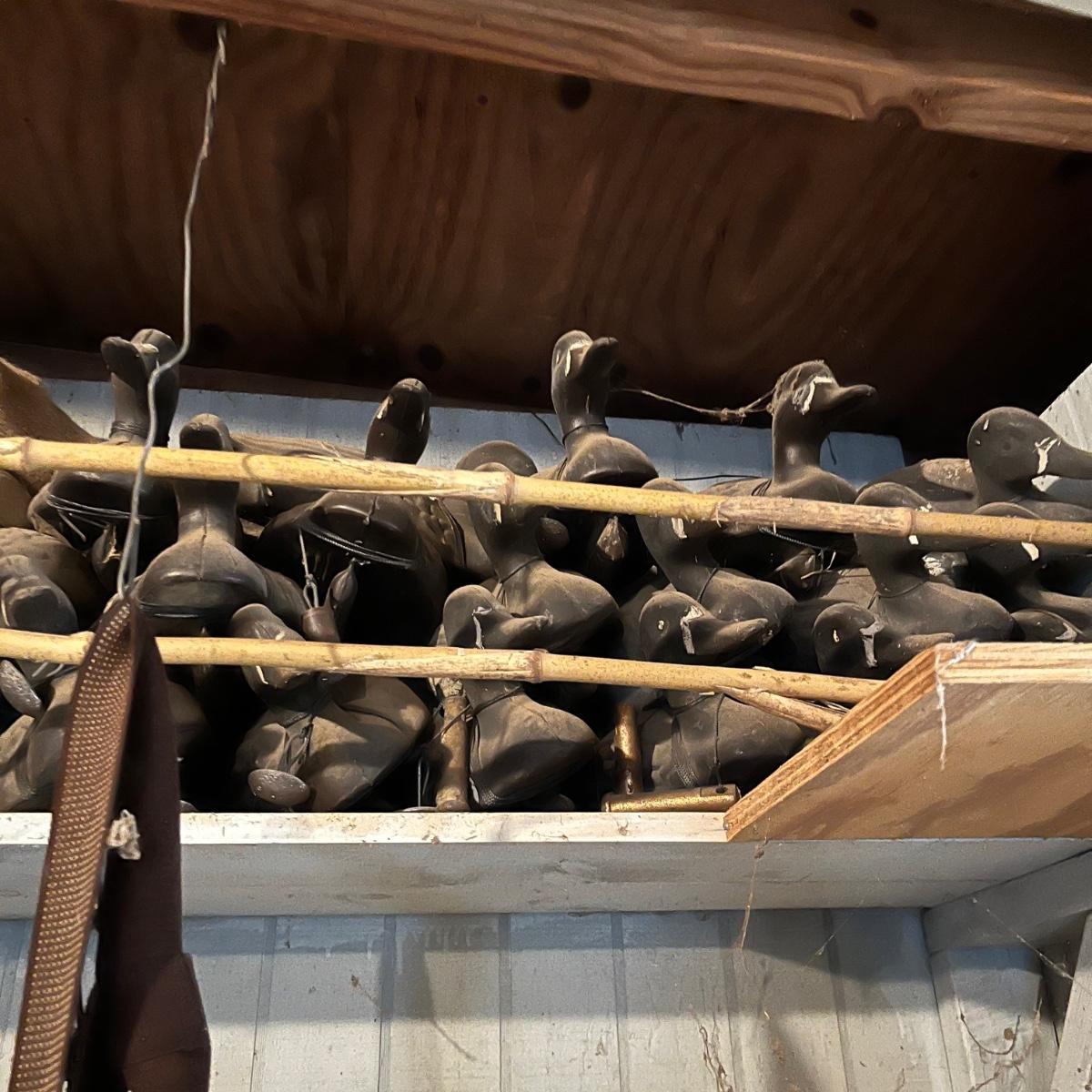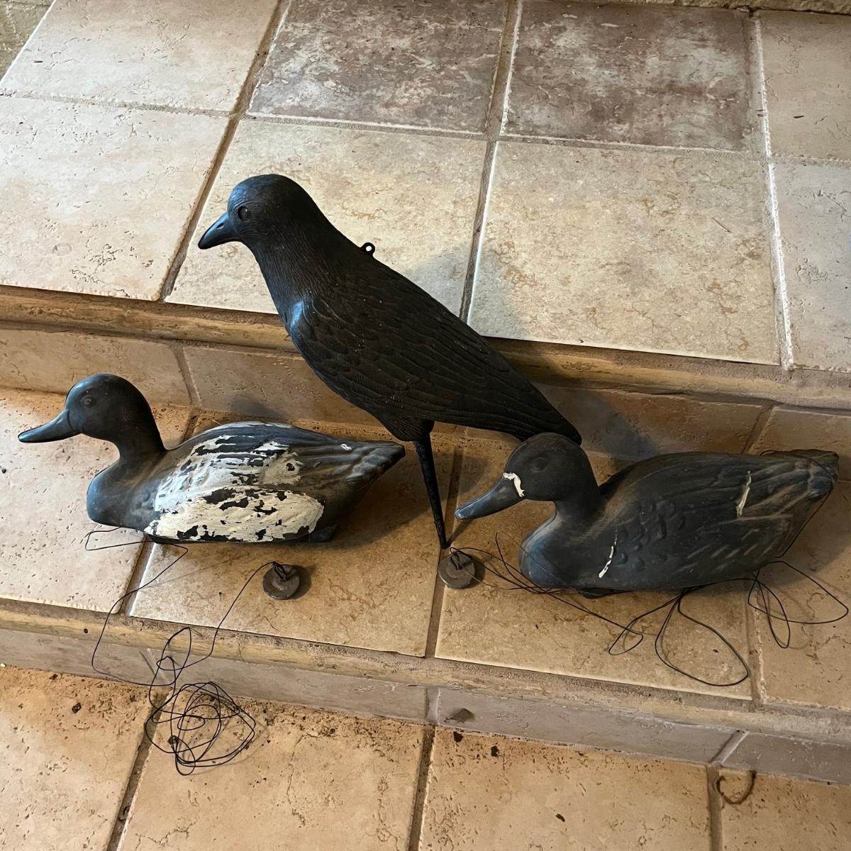 Lot includes over forty Miller manufacturing plastic duck decoys with weights and three plastic crows. Ducks measure 7” x 15” x 7.5”.