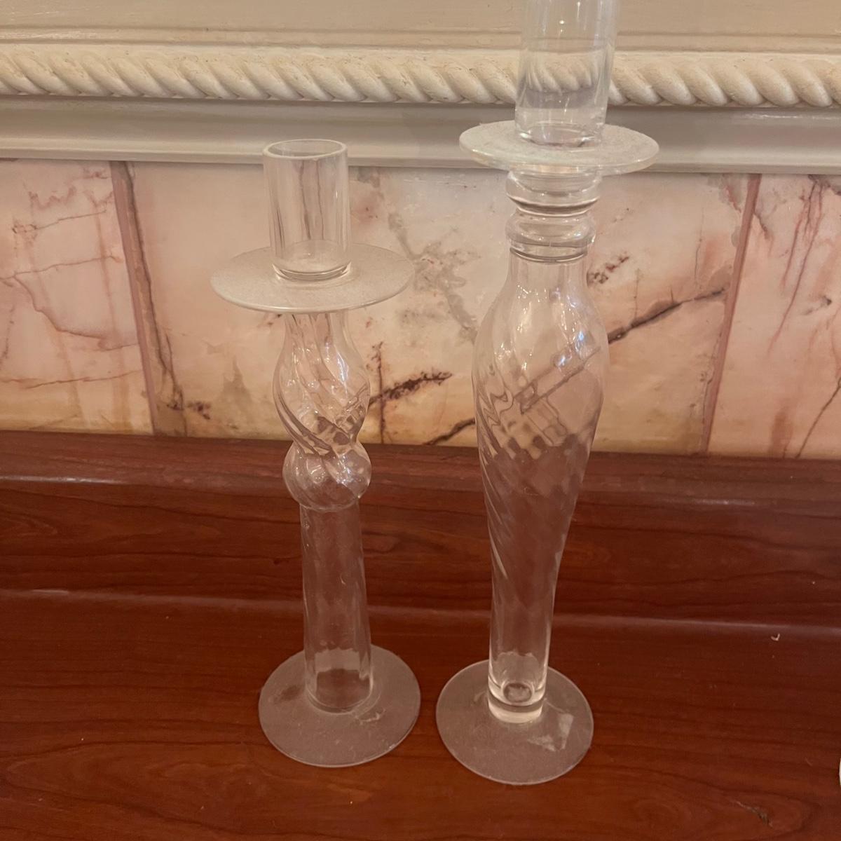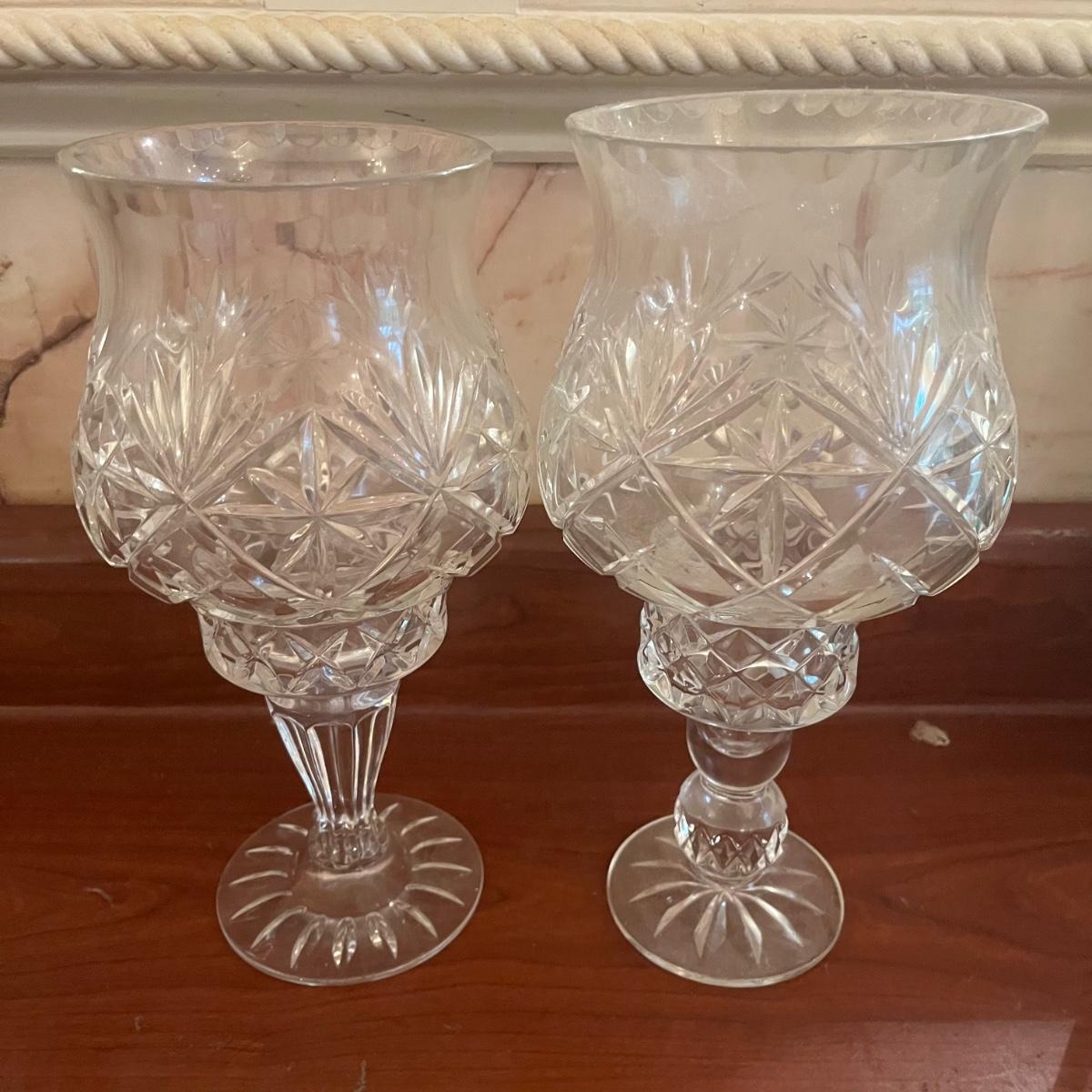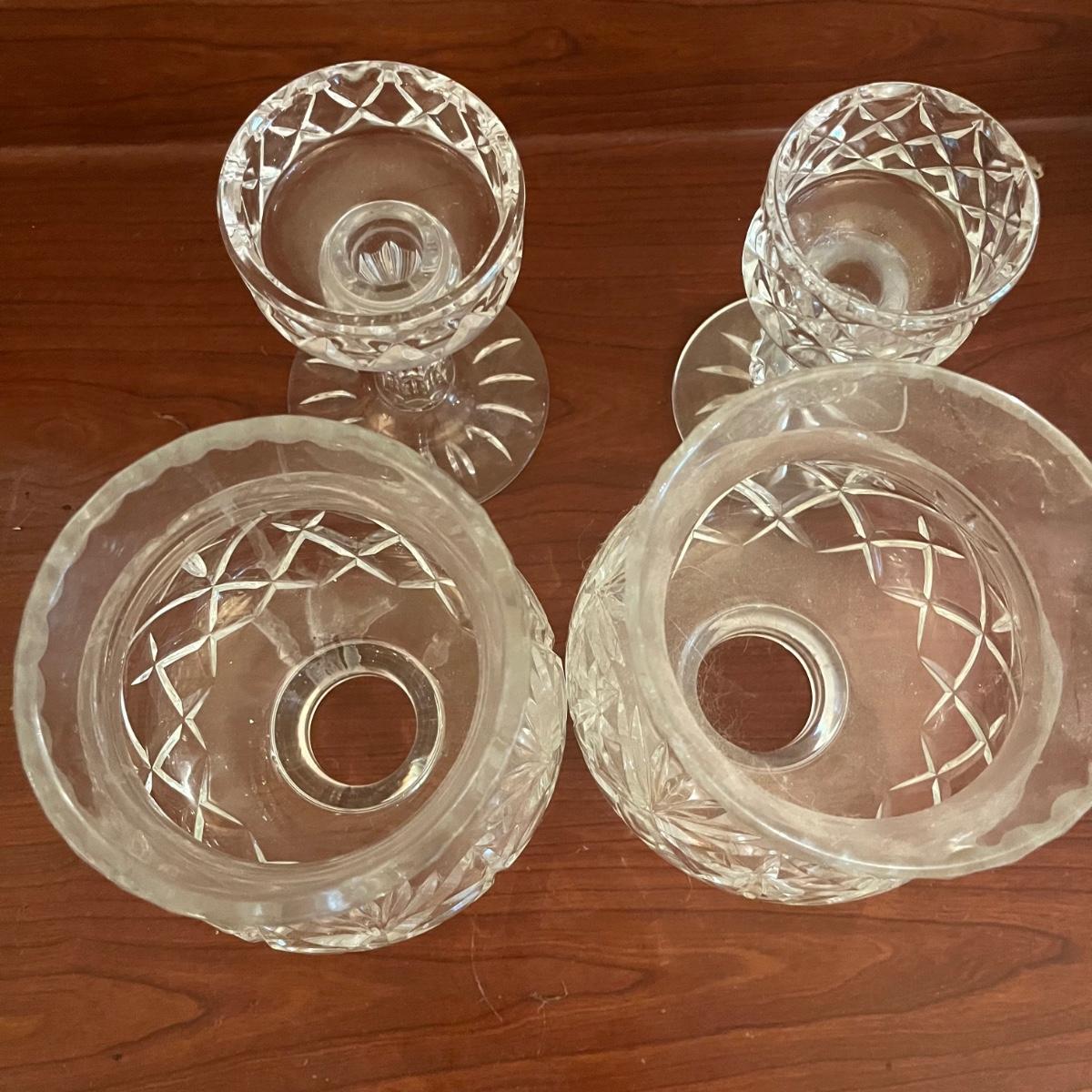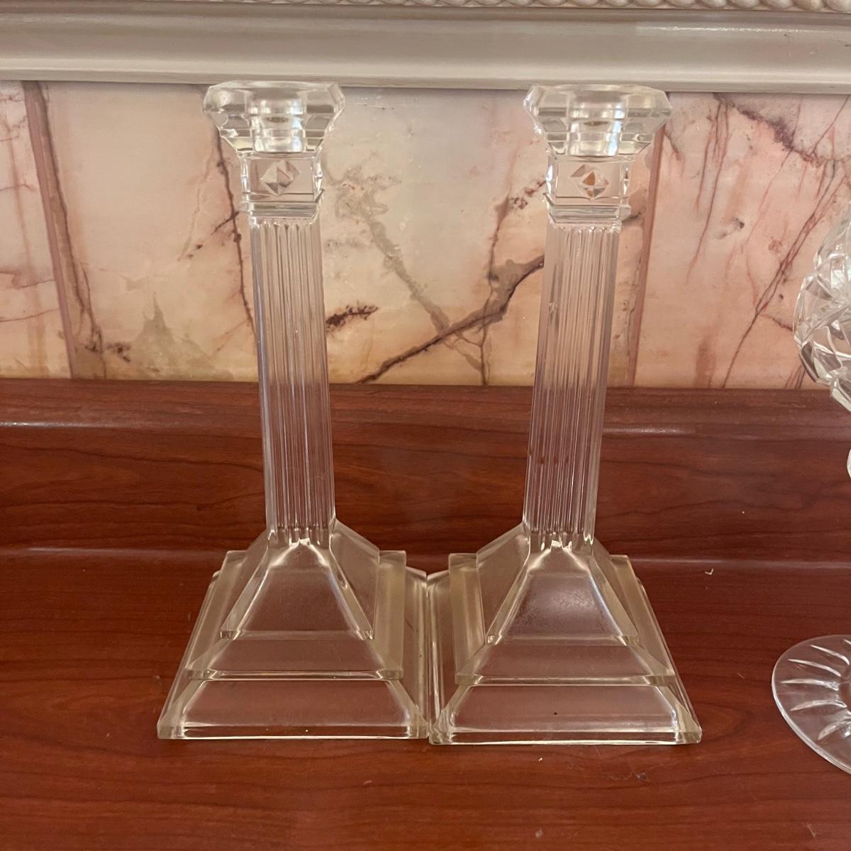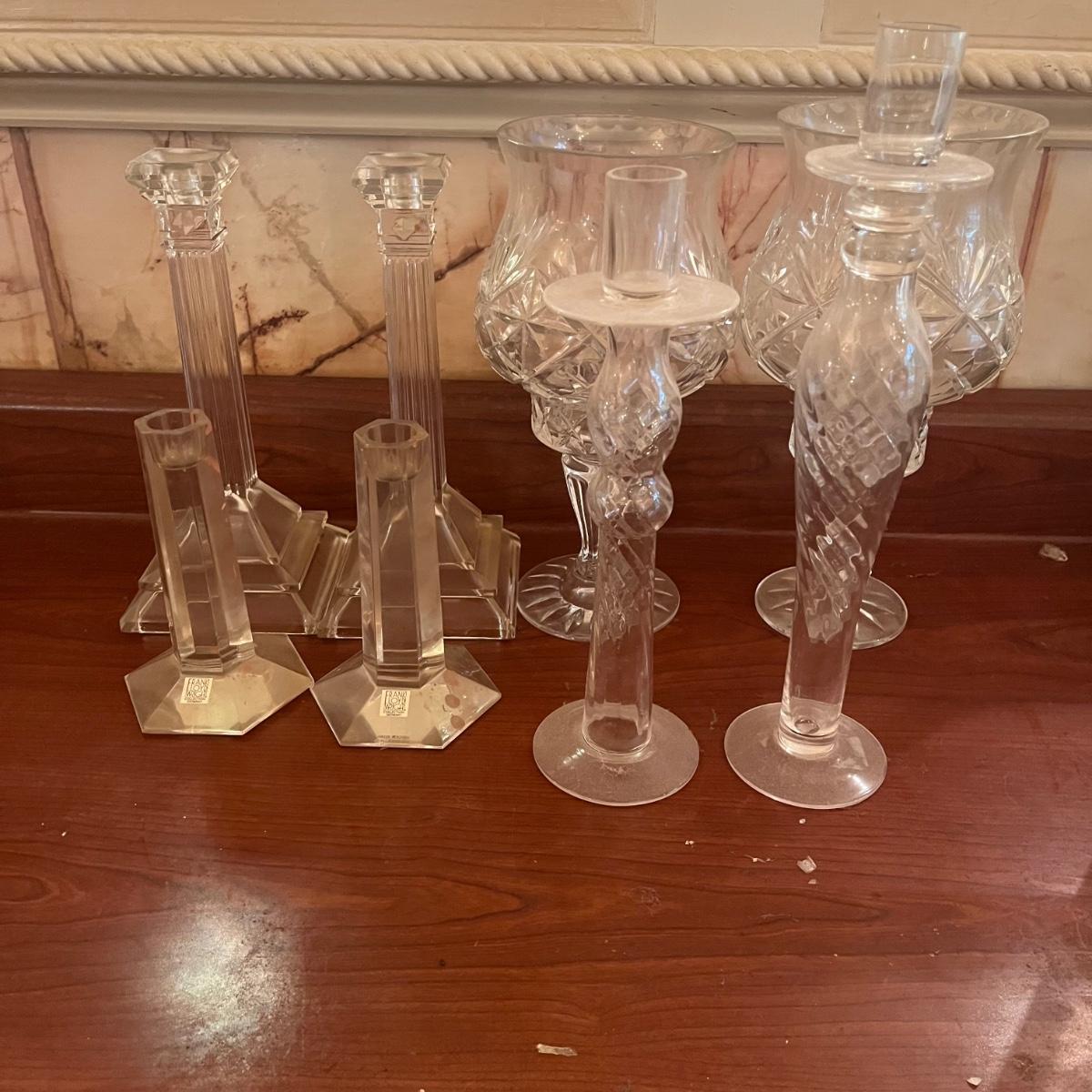 Lot includes a pair of Miller Rogaska candlesticks, one pair of two piece candleholders, pair of square candlesticks and two single candleholders. Two piece candlesticks measure 5.5”D x 11” tall. Also includes one two piece candlestick added later.