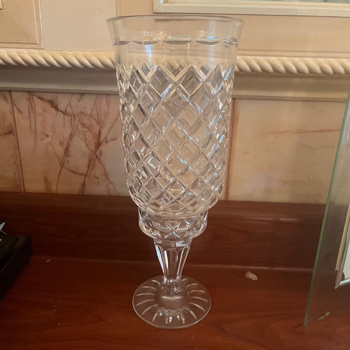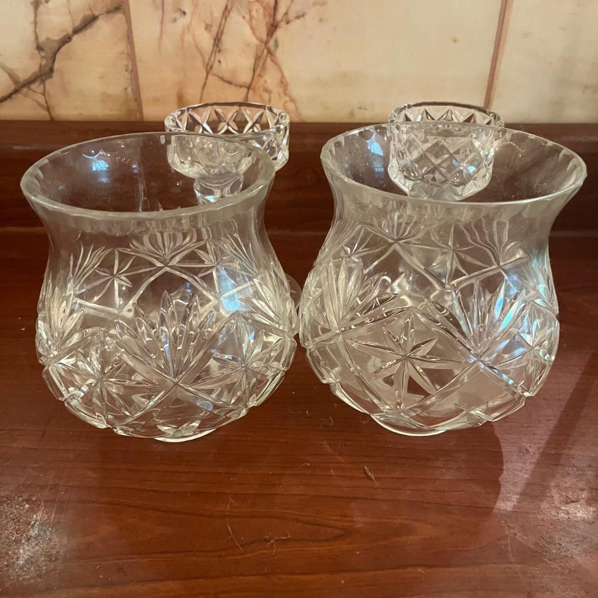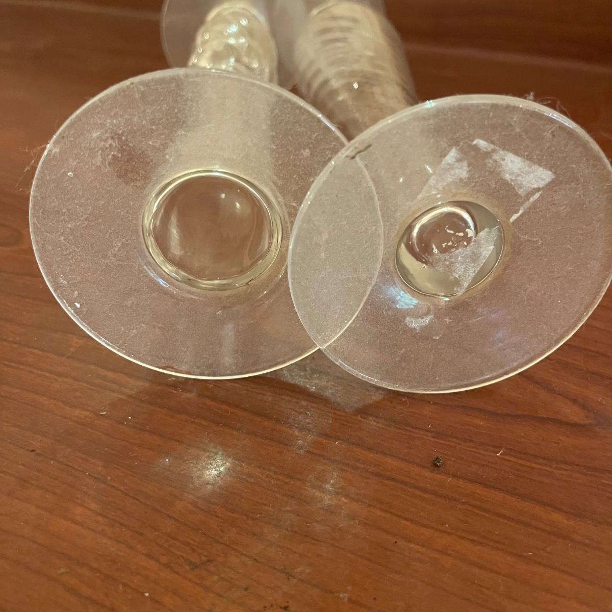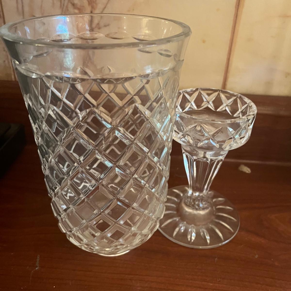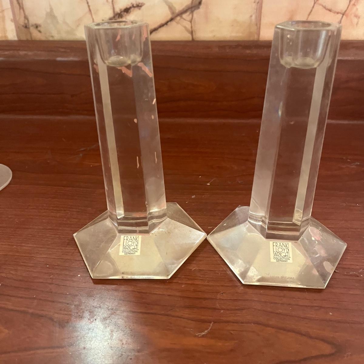 Lot includes a pair of Miller Rogaska candlesticks, one pair of two piece candleholders, pair of square candlesticks and two single candleholders. Two piece candlesticks measure 5.5”D x 11” tall. Also includes one two piece candlestick added later.