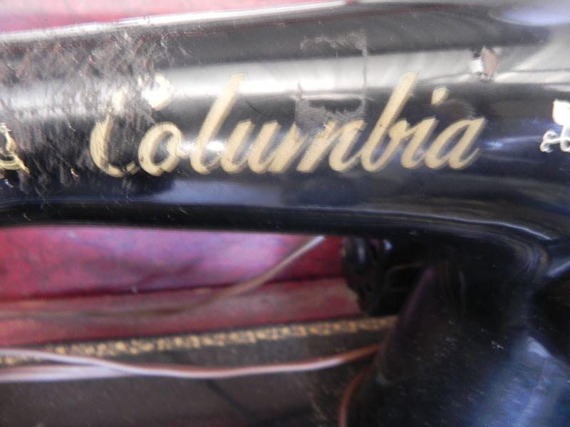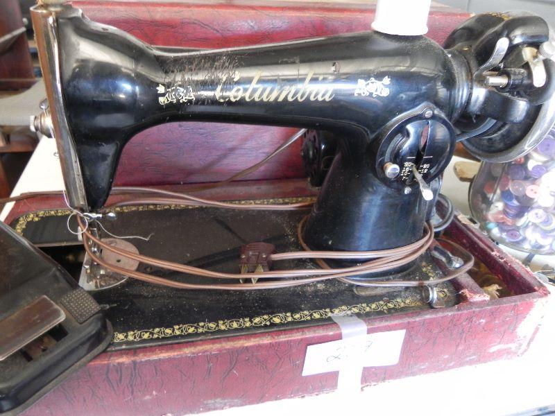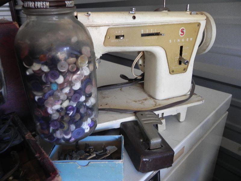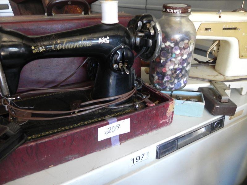 2 Vintage Sewing Machines w/attachments and pedals, 1 w/carry case and Jar of Buttons #209