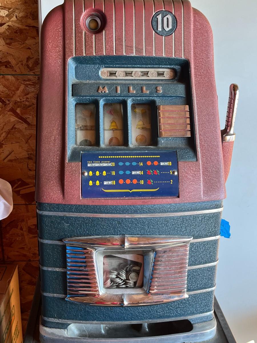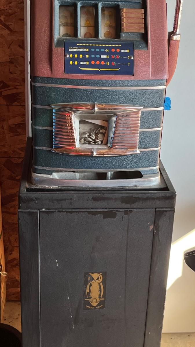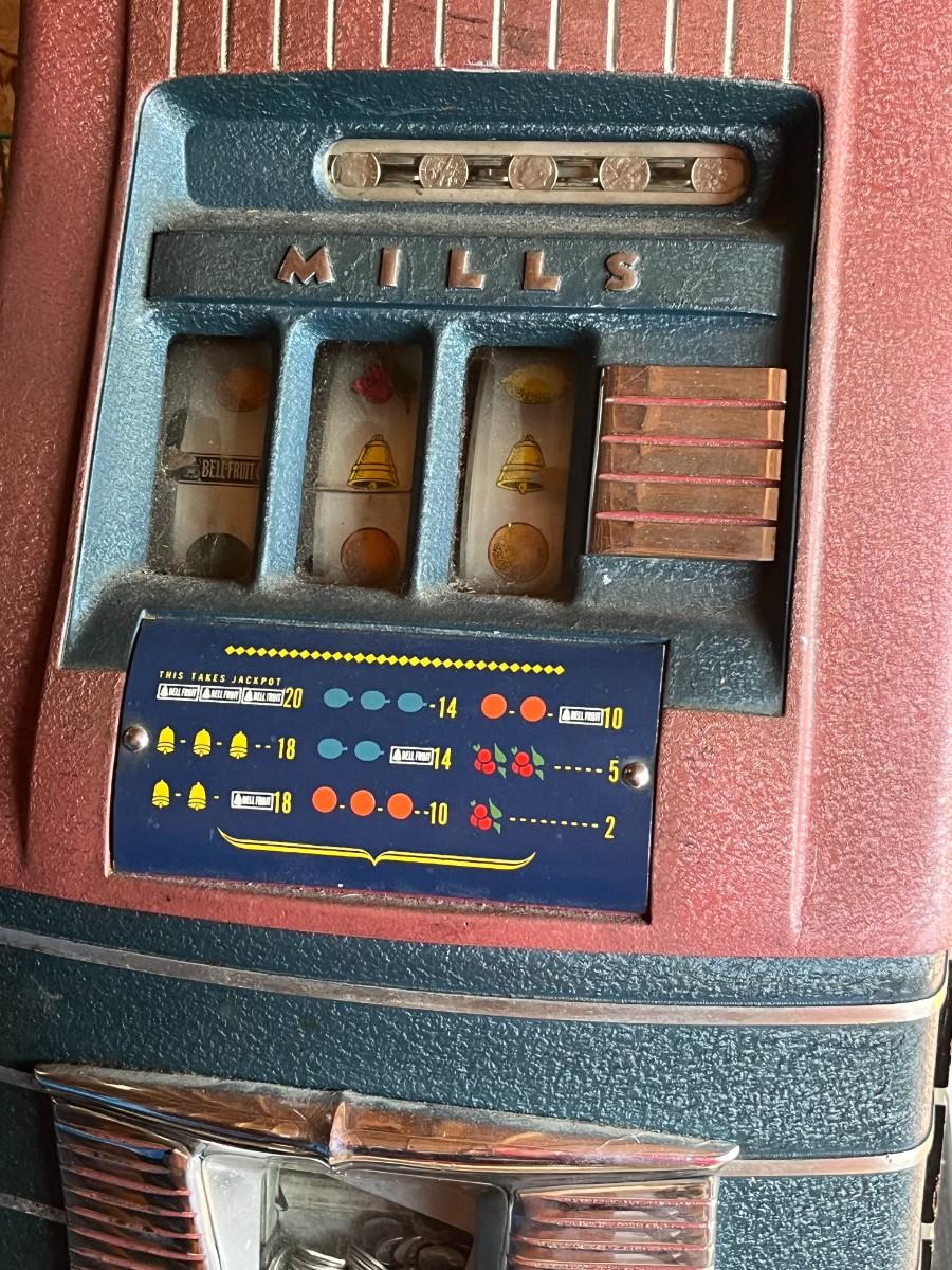 MILLS  HIGH TOP 1947 SLOT MACHINE. WITH METAL STAND. WORKING.