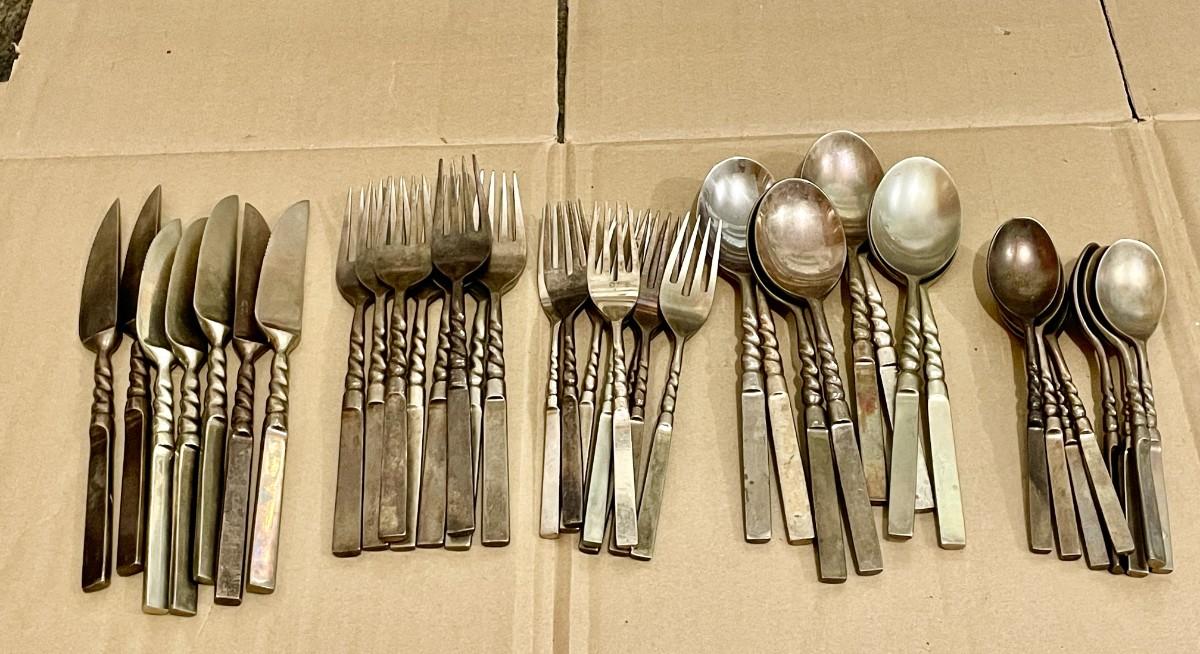 Includes 7 dinner knives, 8 dinner forks, 8 salad forks, 8 soup spoons & 8 teaspoons.