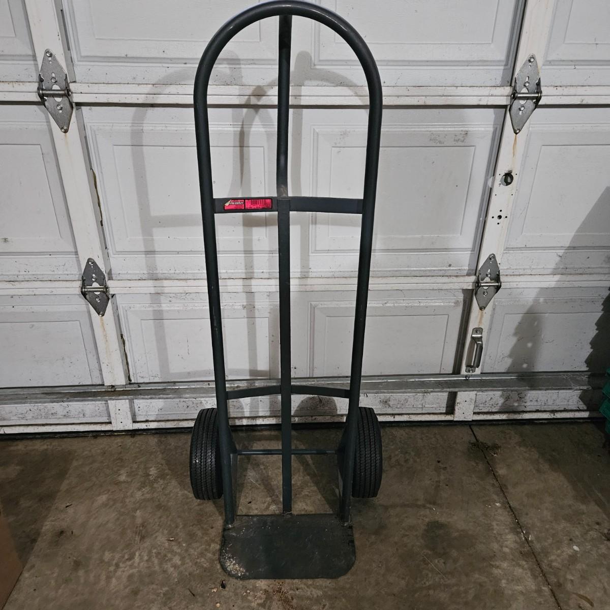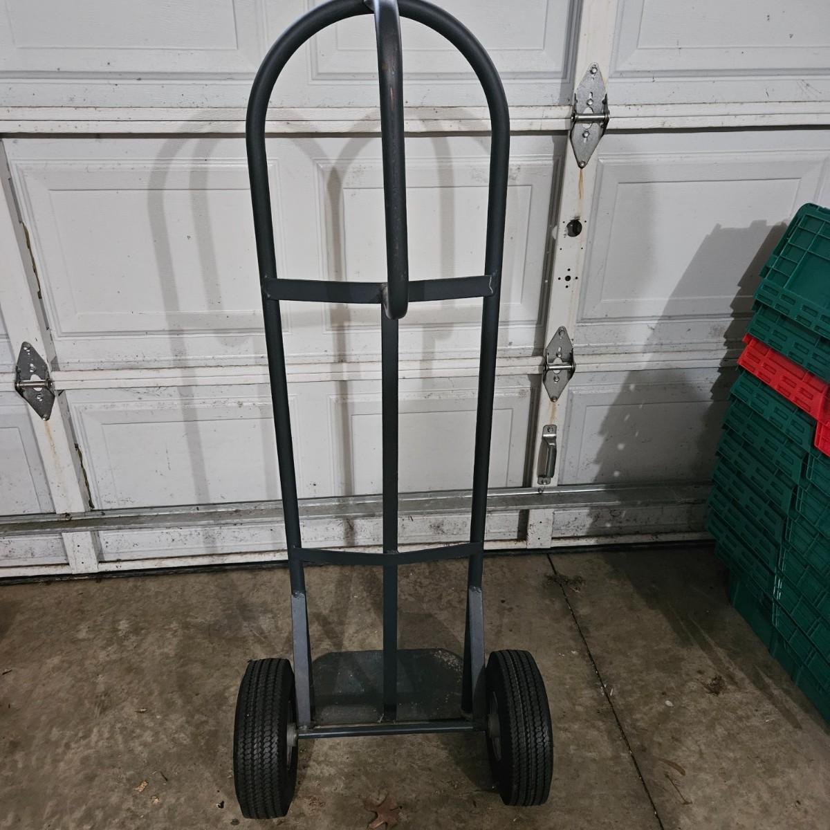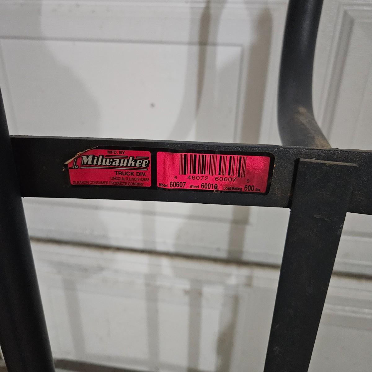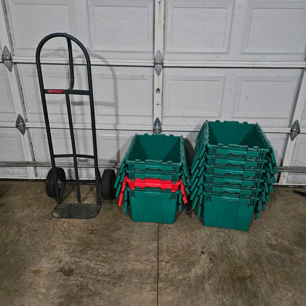 A Milwaukee hand truck with rubber tires that measures approximately 20" x 17.5" x 52". The tires are currently flat. Also included is 10 ULine plastic storage containers with hinged lids. They measure approximately 21.5" x 15" x 13"H. Local pickup only