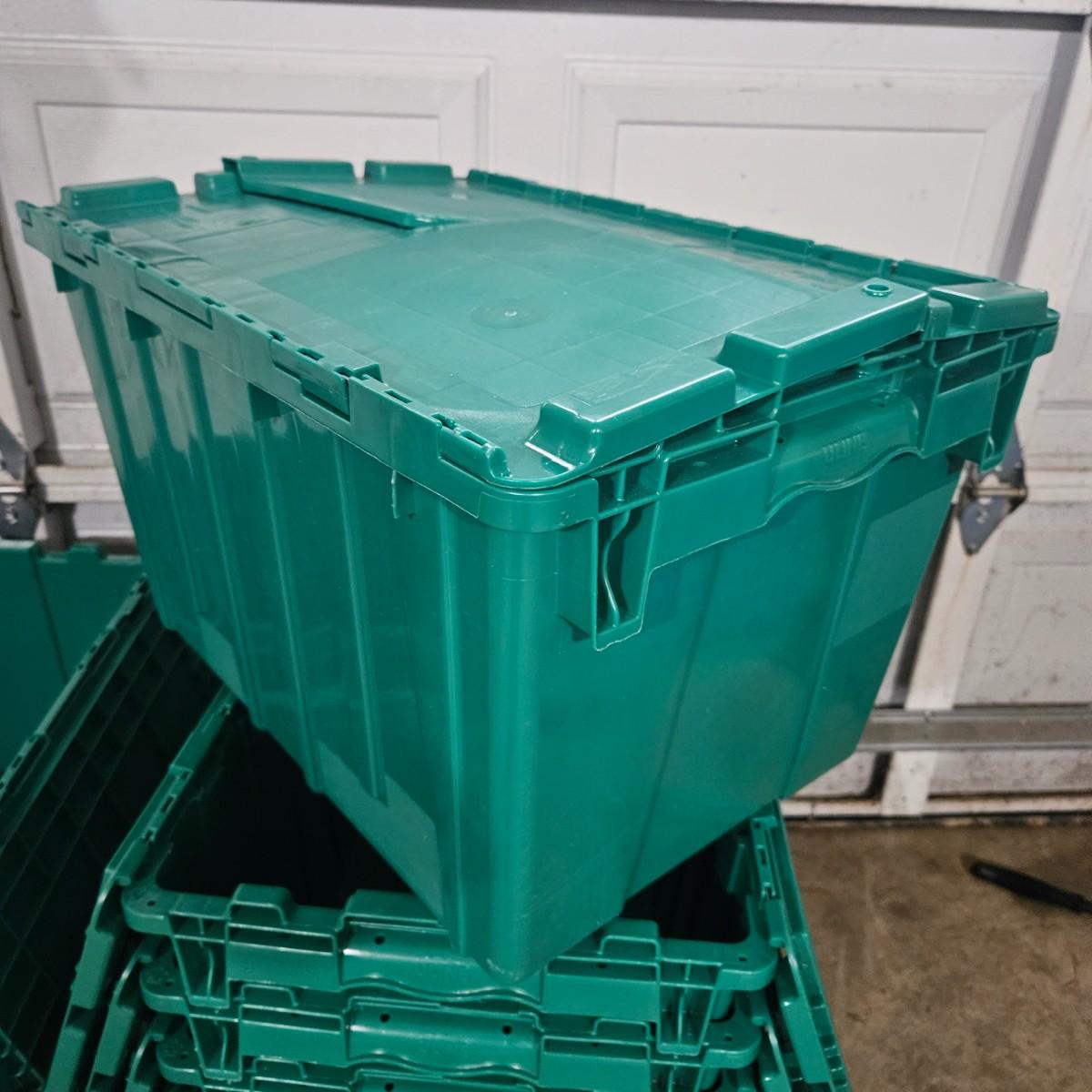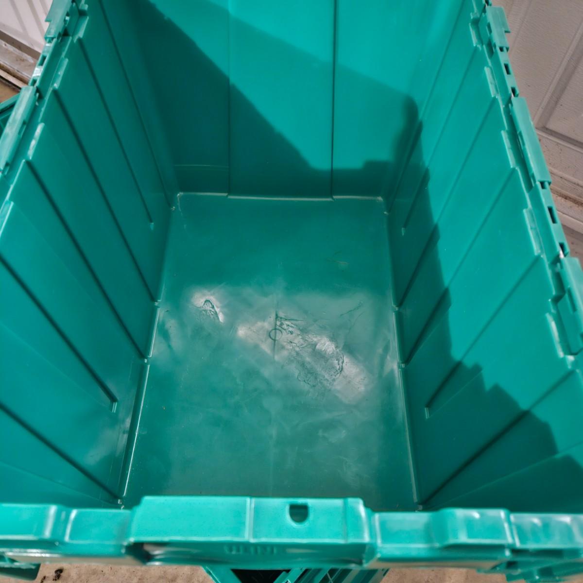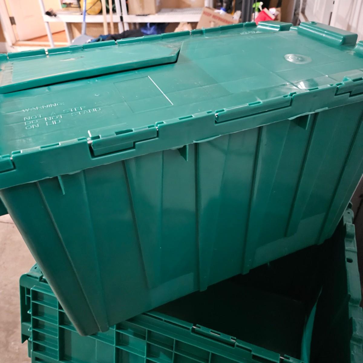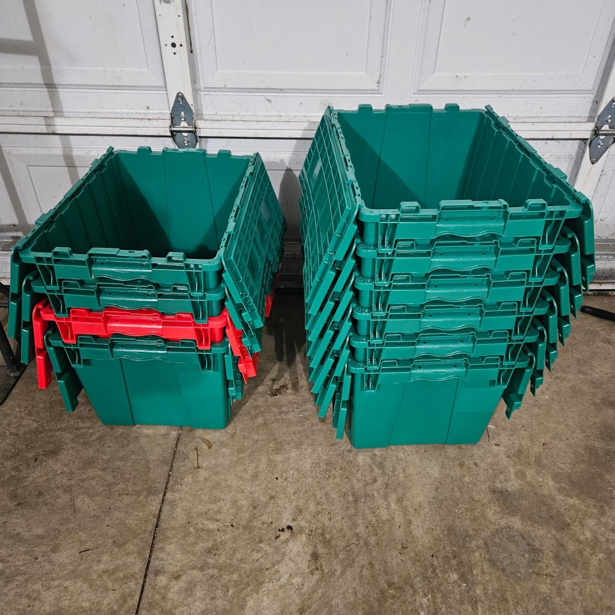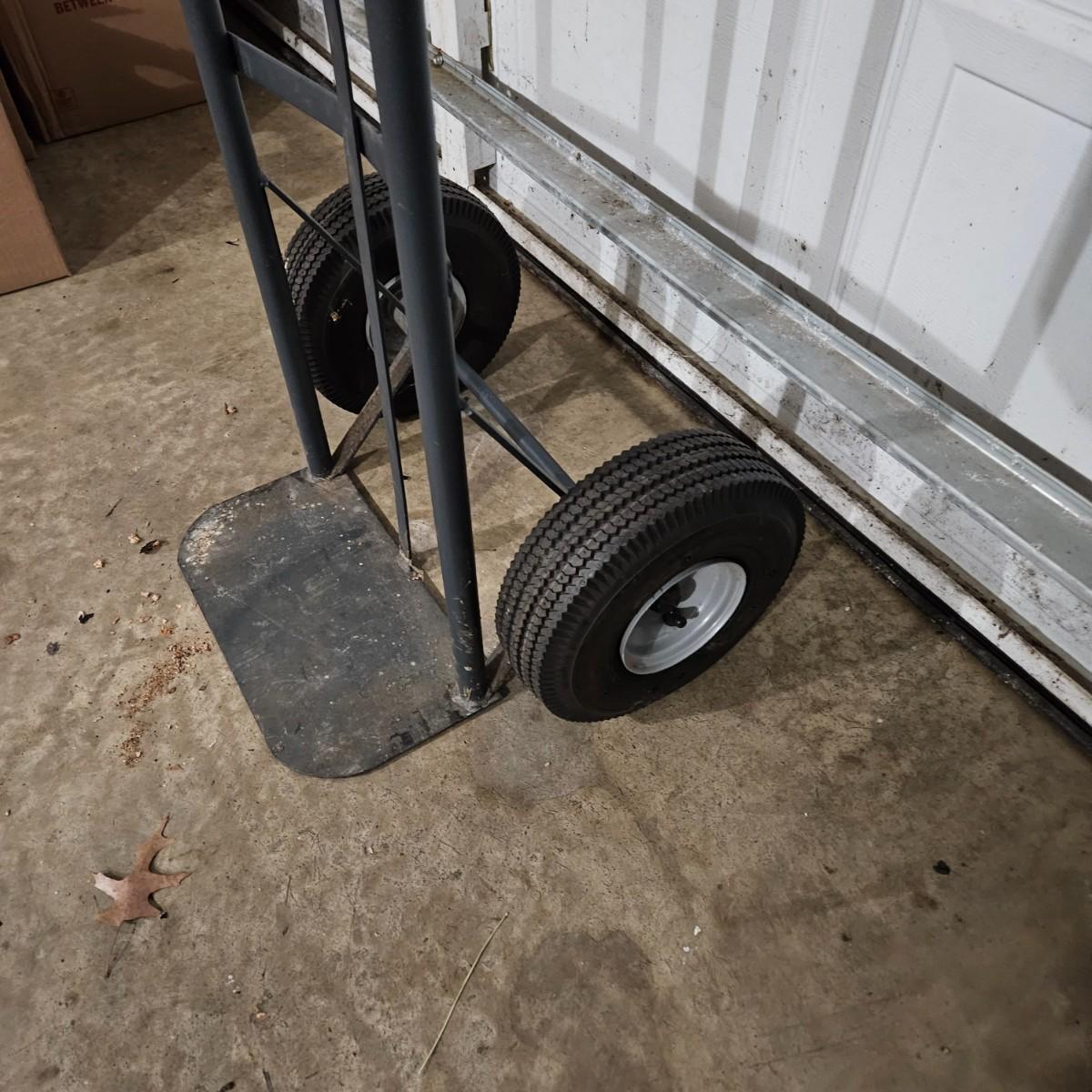 A Milwaukee hand truck with rubber tires that measures approximately 20" x 17.5" x 52". The tires are currently flat. Also included is 10 ULine plastic storage containers with hinged lids. They measure approximately 21.5" x 15" x 13"H. Local pickup only