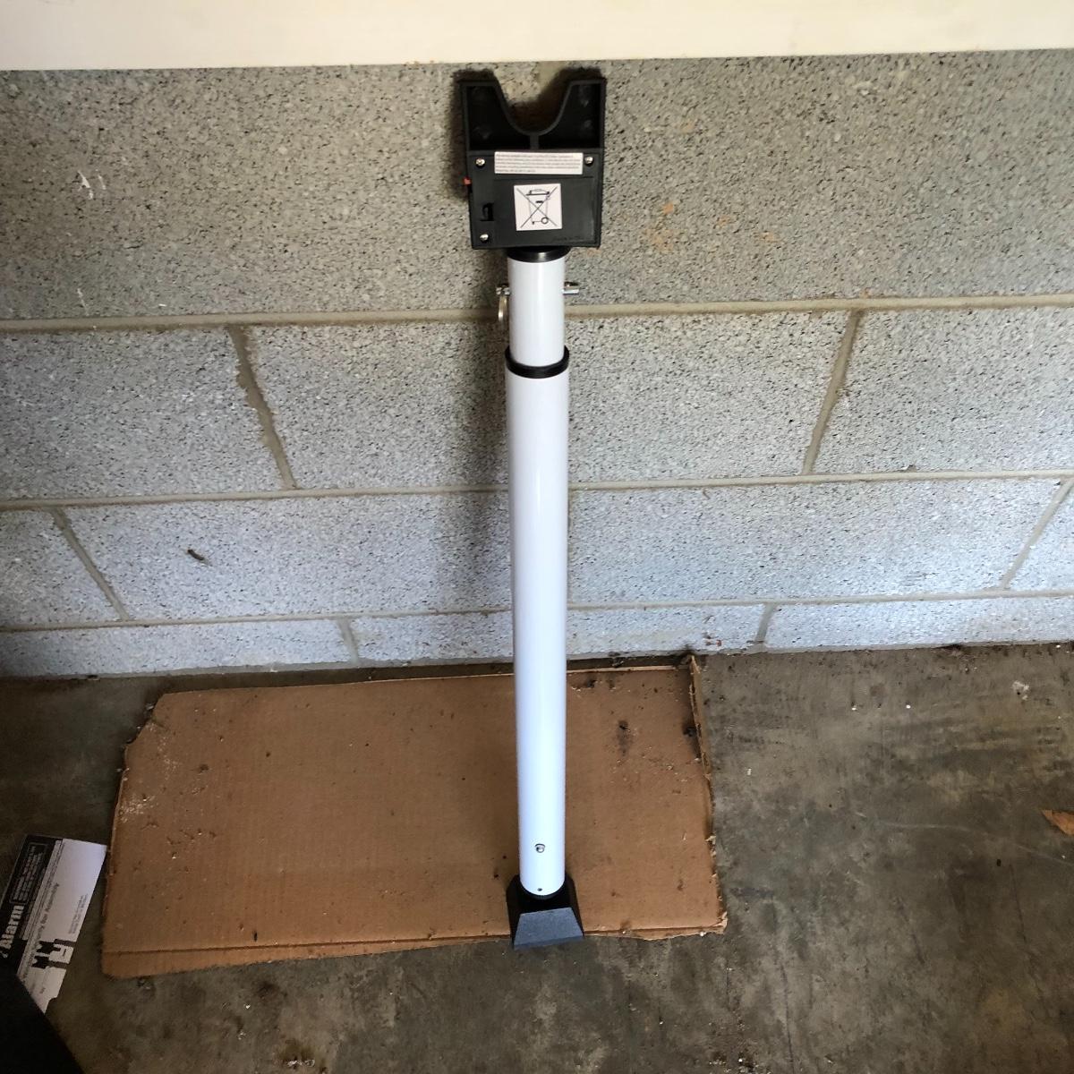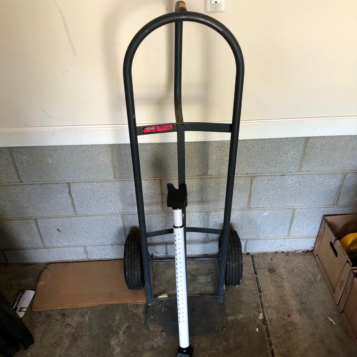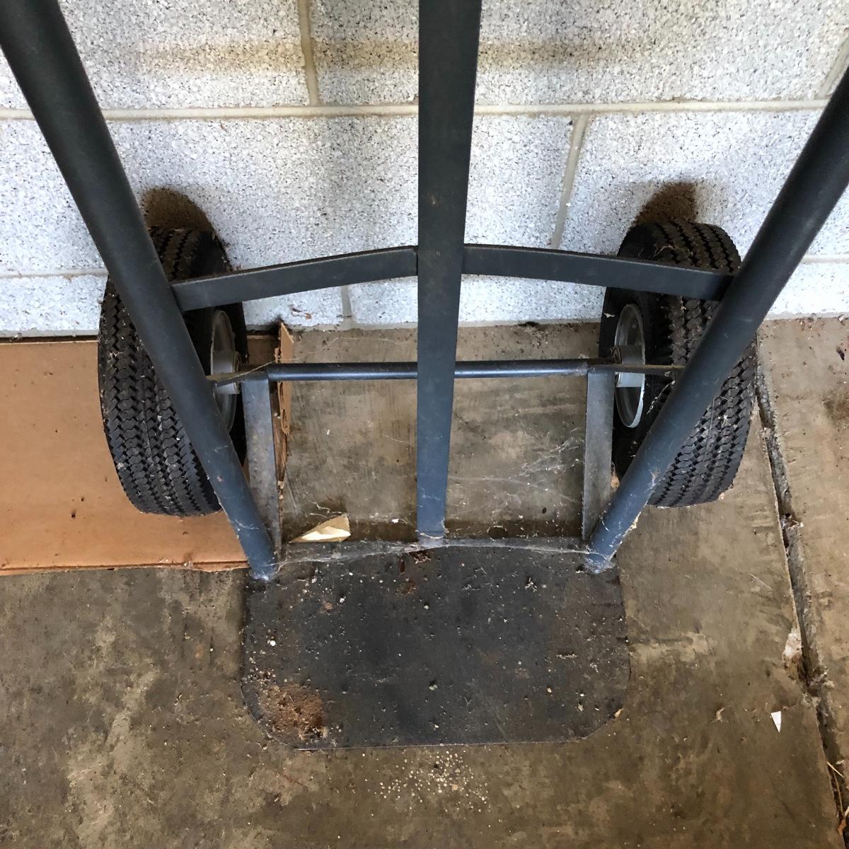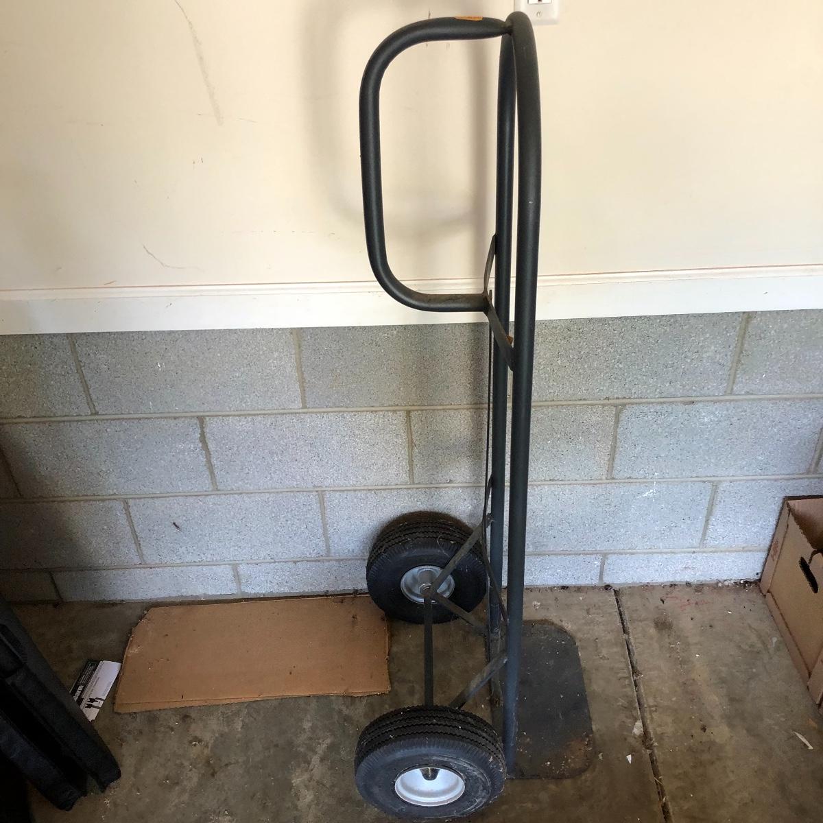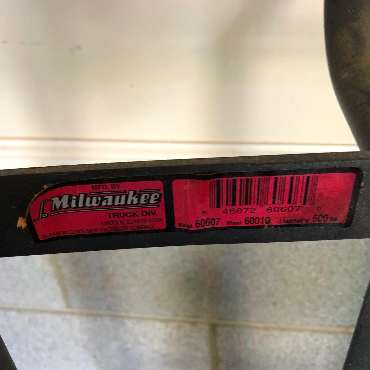 Milwaukee steel hand truck has pneumatic tires that need air. Also includes adjustable door brace.