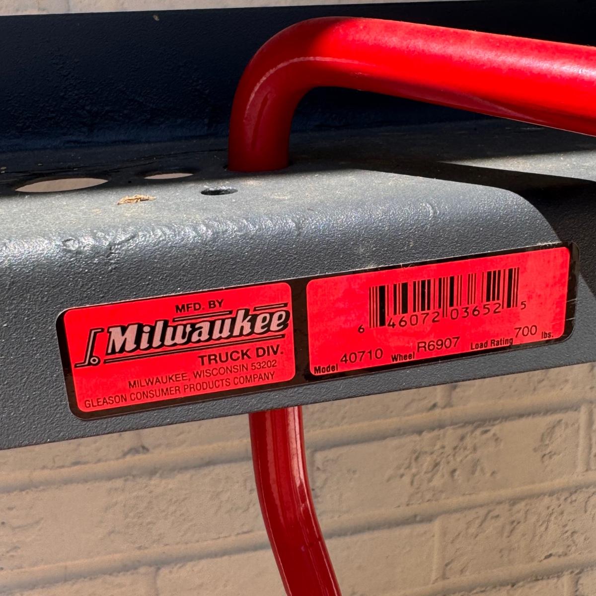 This lot includes one Milwaukee hand truck that measures 12” x 17” x 60”H. Condition appears to be great. Both wheels work. Local pickup only.