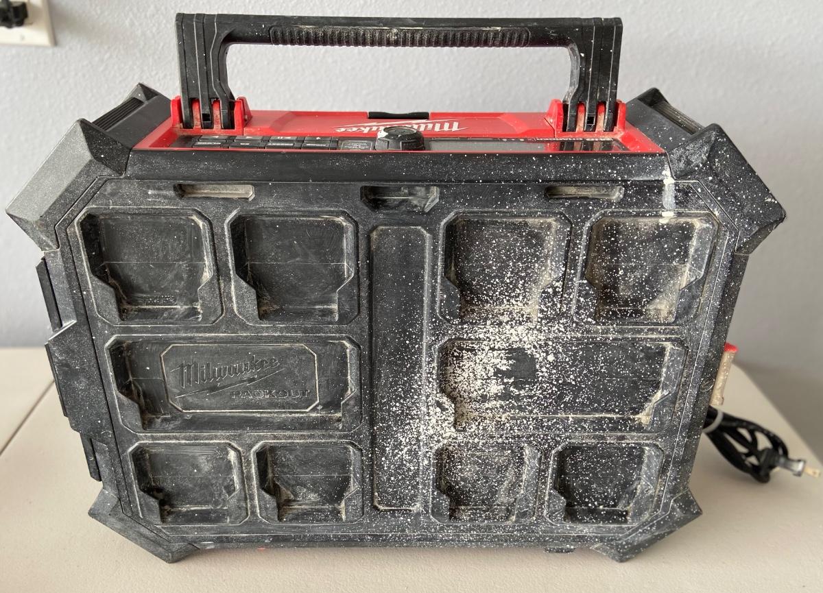 Radio is used and fully functional. Paint splatter present and no battery included. Power provided thru power cord. Pictures are part of item description and should be reviewed prior to bidding.