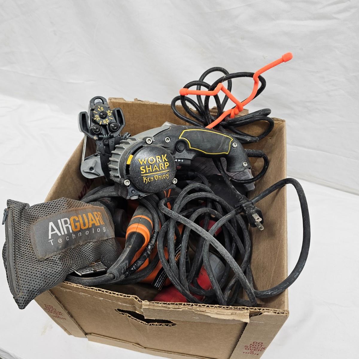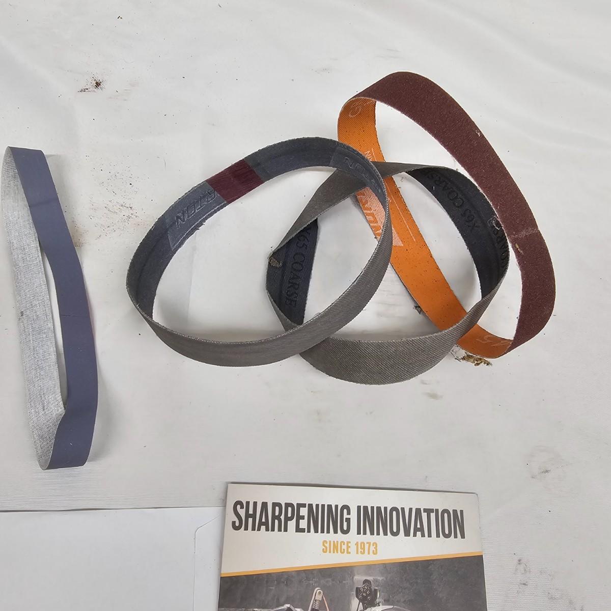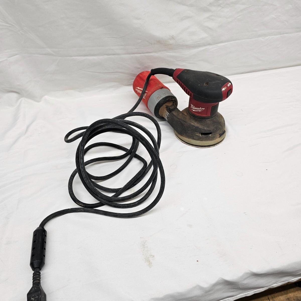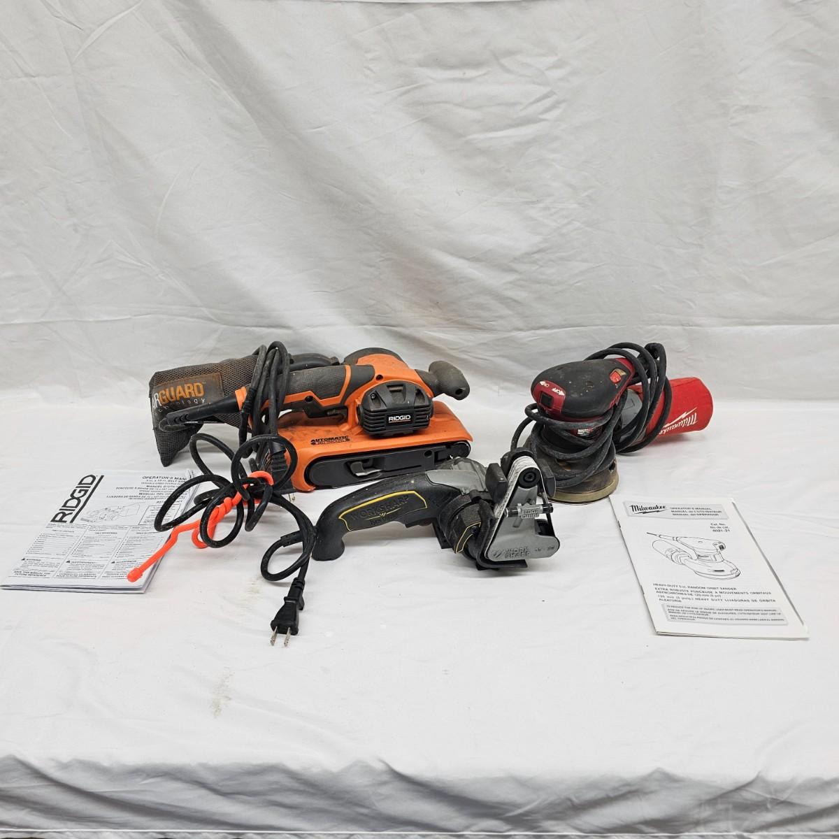 Three hand style sanders for craft or construction work. Milwaukee 5" orbital sander with dust bag, measures 11" x 5" x 6"H. Ridgid 3" x 18" belt sander with dust bag and variable speed knob. 16" x 7" x 6"H. Unique Worksharp belt sander with 3/4" wide belt and tension adjuster. 11" x 6" x 5"H. All items powered on when plugged in. Sanding discs and belts available in separate listing in this auction. See photos for details. Local pickup only.