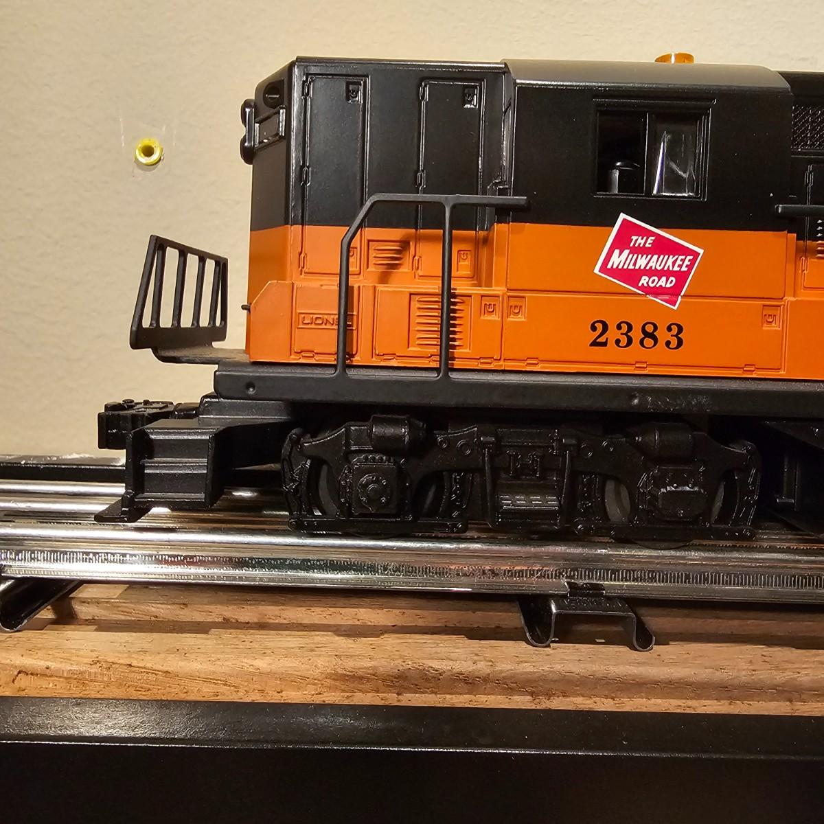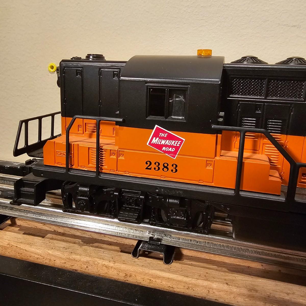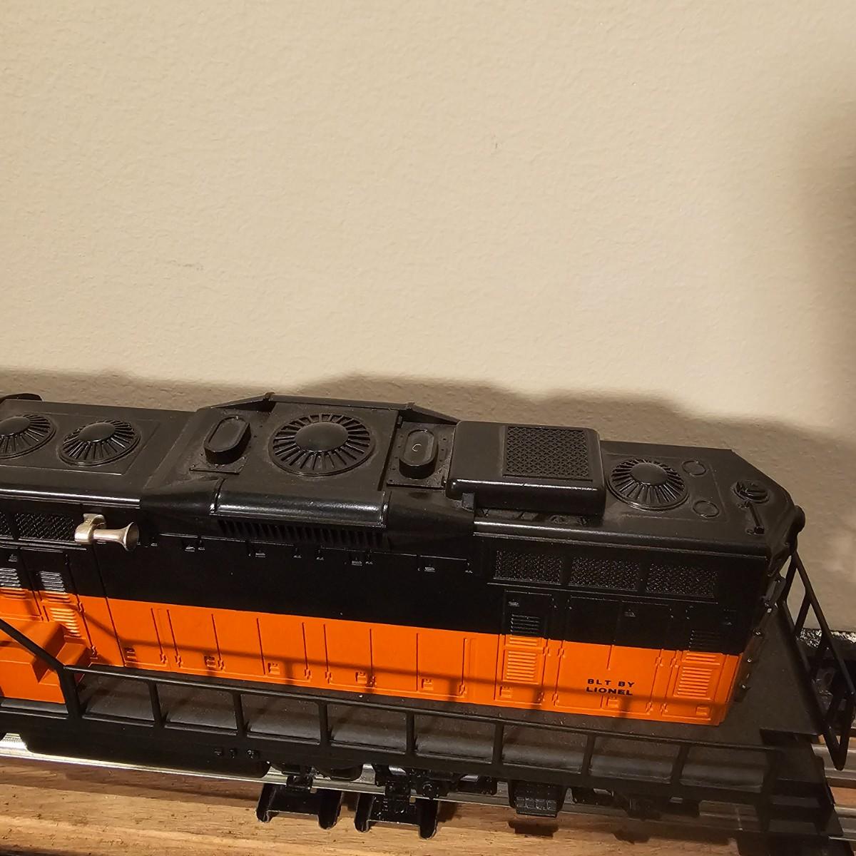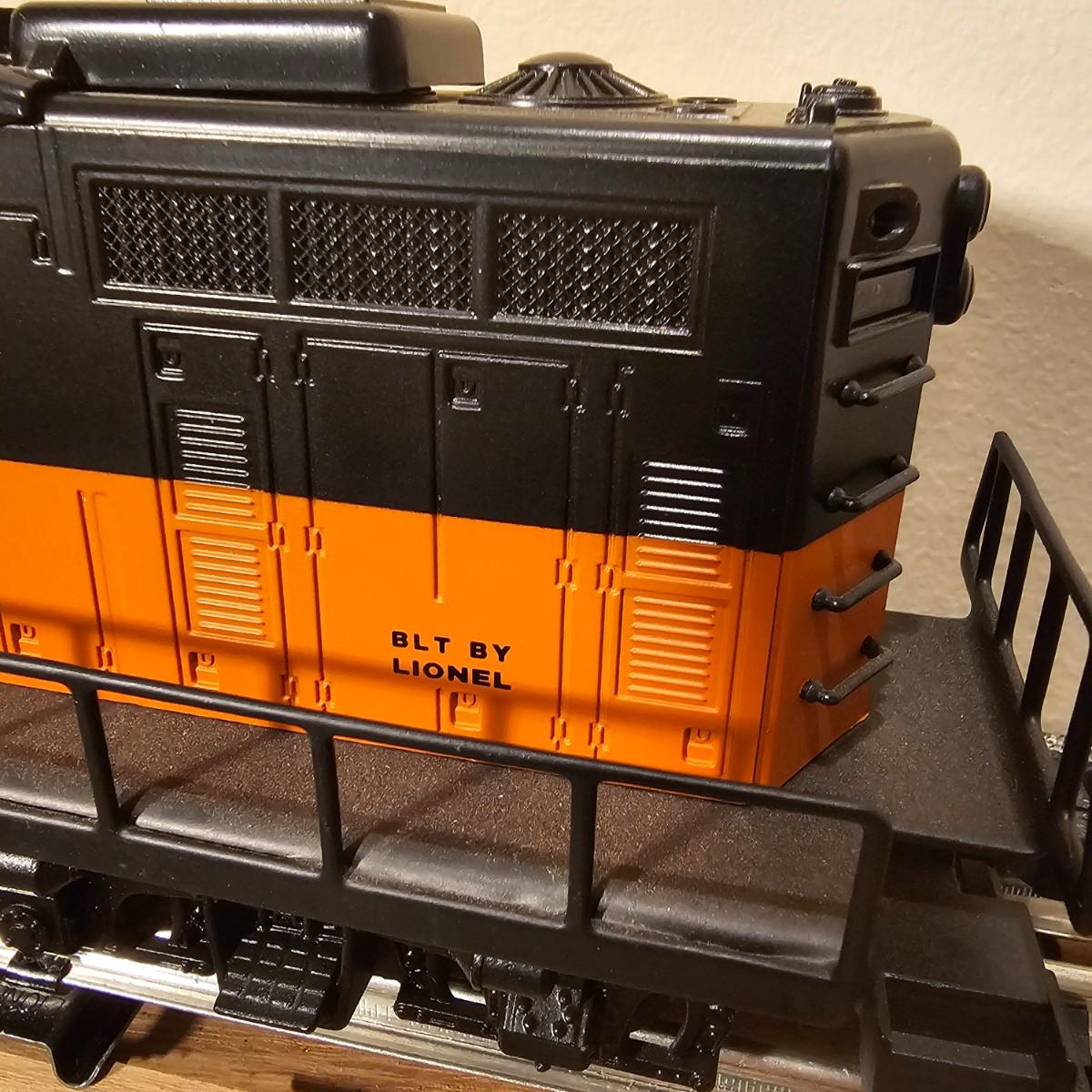 Classic orange and black on this Milwaukee Road GP-9 4-axle diesel. Realistic details, railings and more. Engine measures 14" x 3" x 4"H, started and ran on layout. Has additional features listed on box end photo. In original Lionel box, box shows wear and tear on flaps and sides. See photos for details. Shipping available. Please note that any price tag seen on an item was not put there by Sterling Transitions and does not reflect the current value of the item. Tracks in photos are not included with this lot, but available elsewhere in this auction.