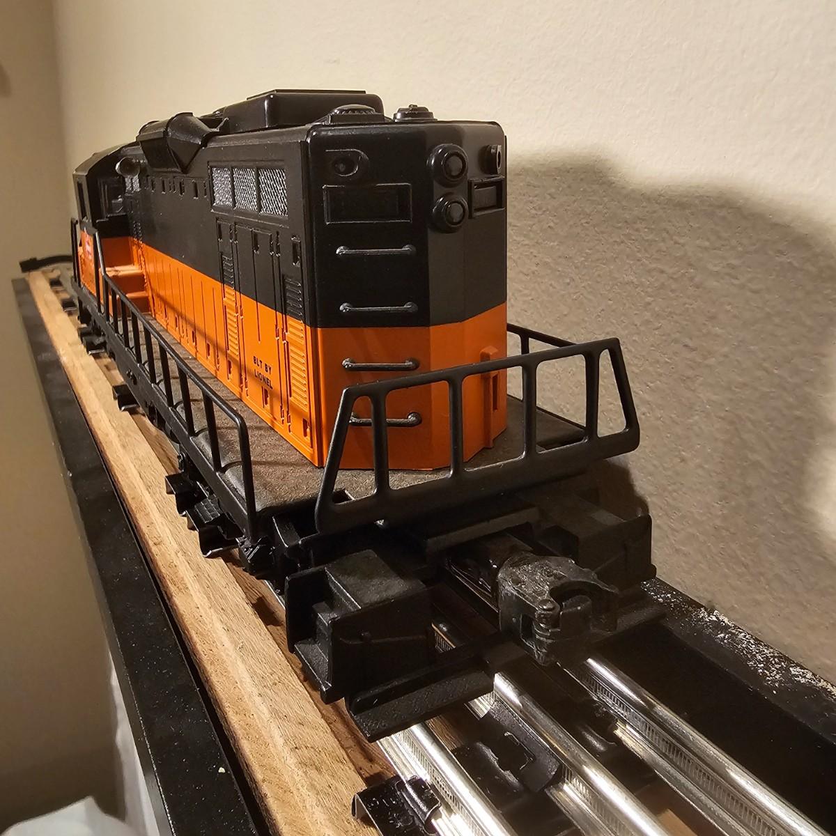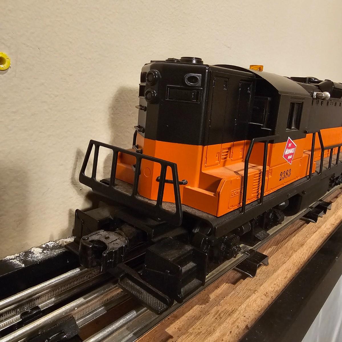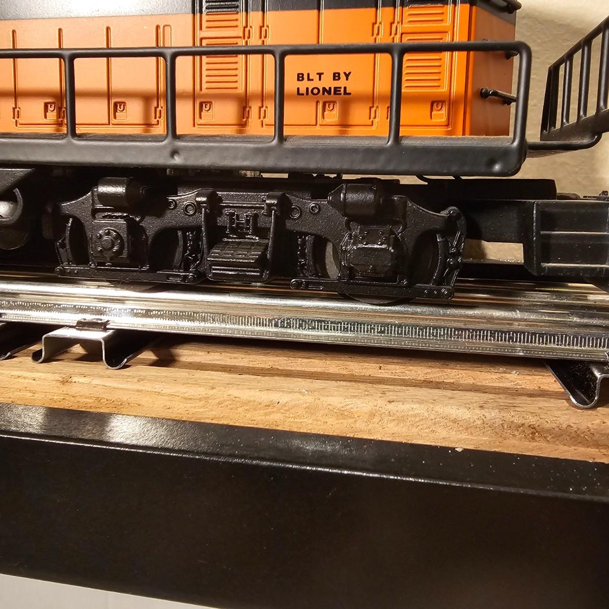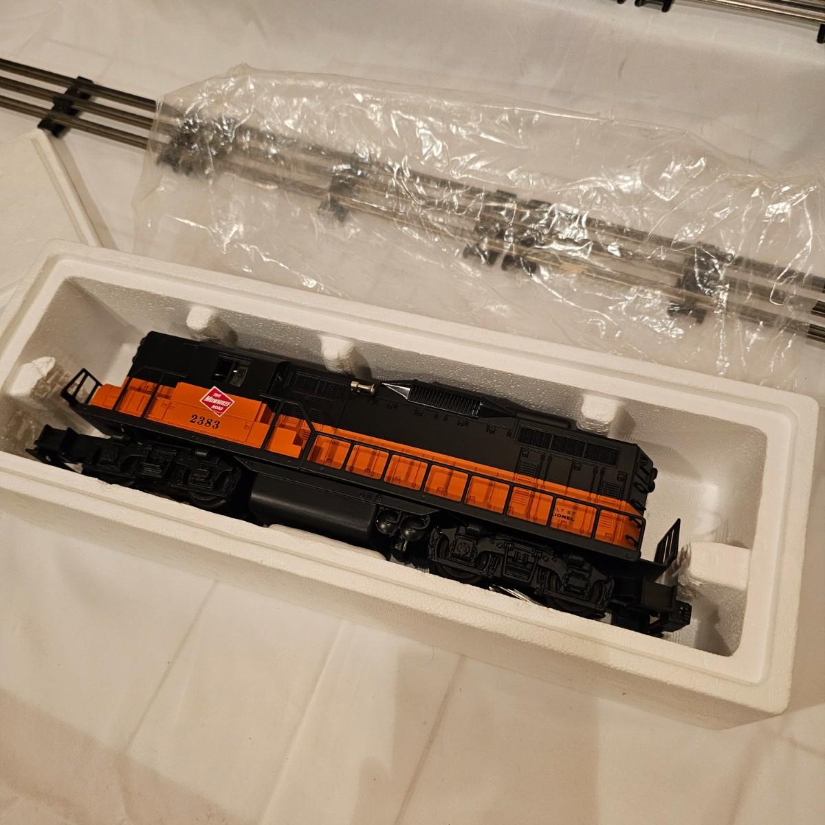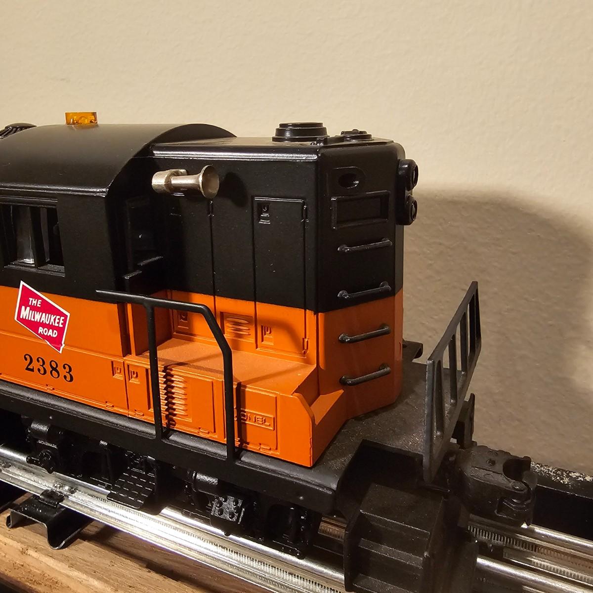 Classic orange and black on this Milwaukee Road GP-9 4-axle diesel. Realistic details, railings and more. Engine measures 14" x 3" x 4"H, started and ran on layout. Has additional features listed on box end photo. In original Lionel box, box shows wear and tear on flaps and sides. See photos for details. Shipping available. Please note that any price tag seen on an item was not put there by Sterling Transitions and does not reflect the current value of the item. Tracks in photos are not included with this lot, but available elsewhere in this auction.
