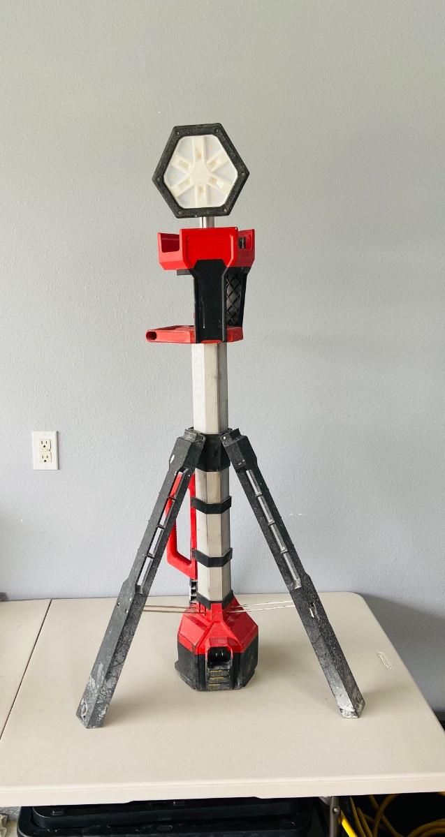 Light is used and fully functional with some paint splatter present. Light adjusts and swivels with 3 brightness settings. Light can be powered by extension cord. NO BATTERY INCLUDED. Pictures are part of item description and should be viewed prior to bidding.