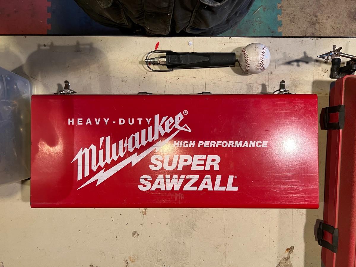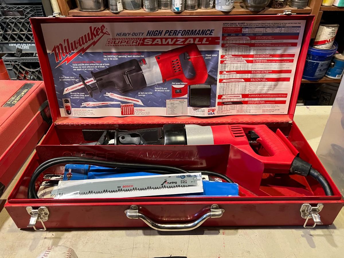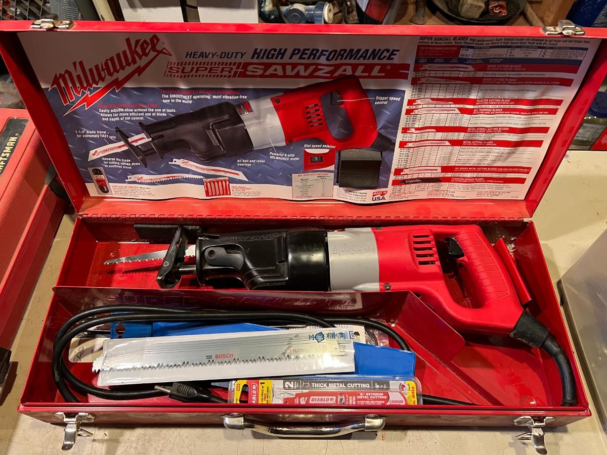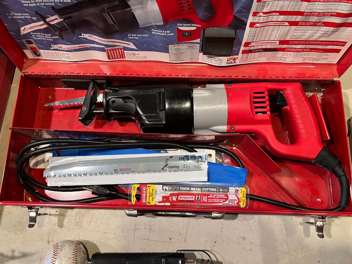 Milwaukee Sawzall In Case Very Good Condition. Includes case and all items shown inside case. Appears to be in very good condition, though we did not test it ourselves. Sold as-is, where-is.