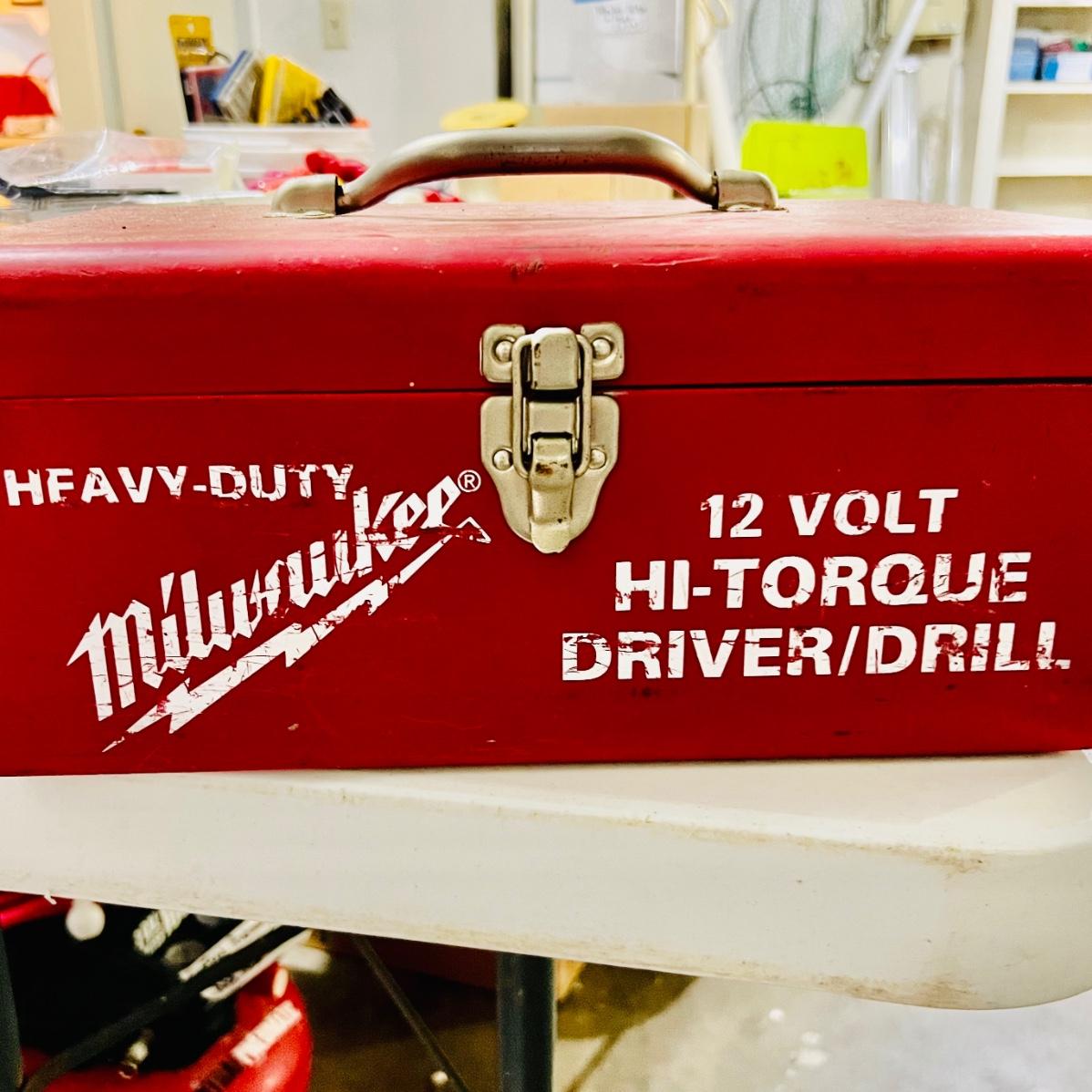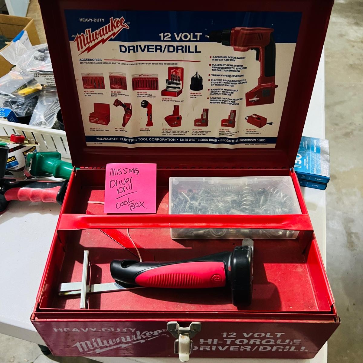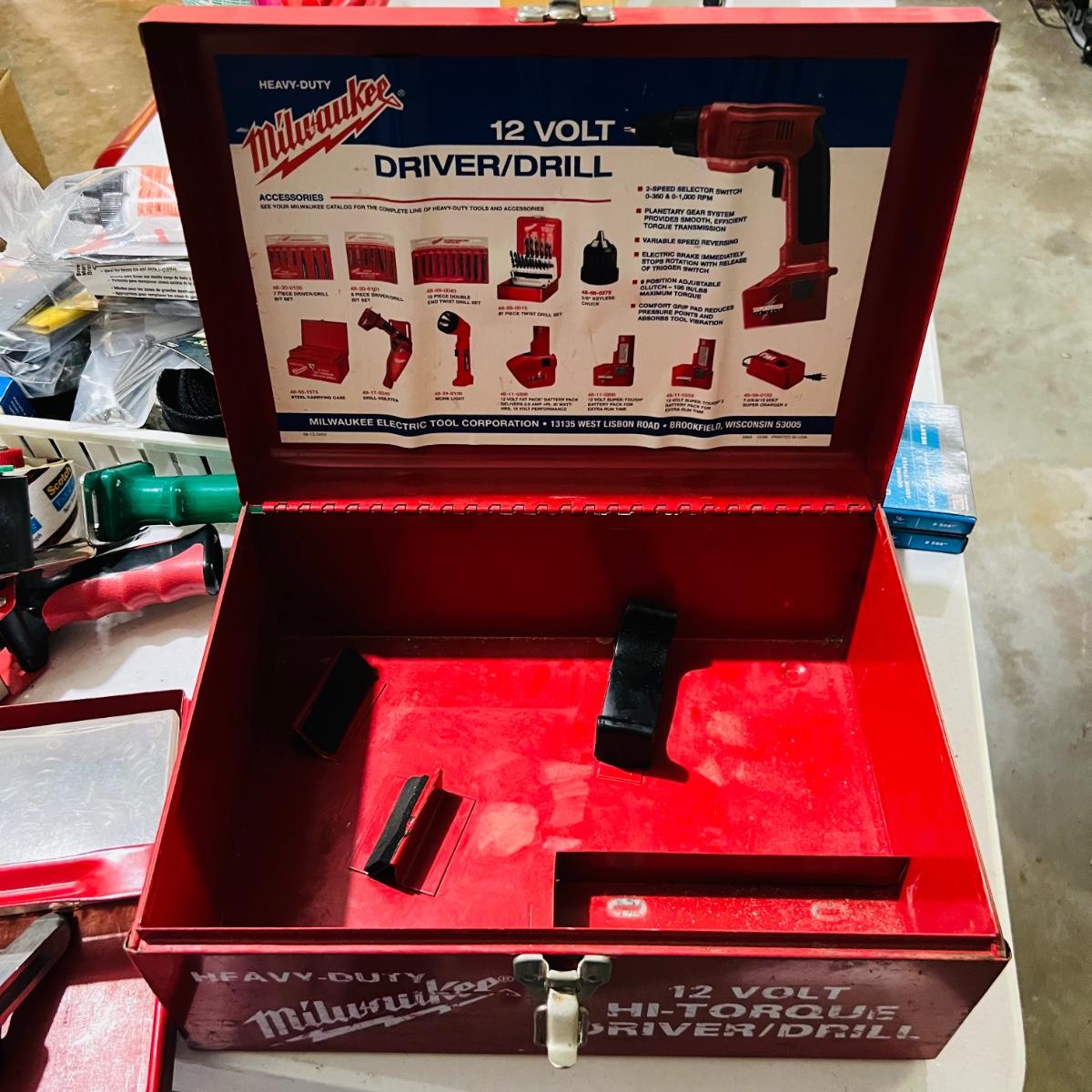 Heavy duty Milwaukee tool box measures 13.5Wx9.5”Wx6”H. Driver drill not included.