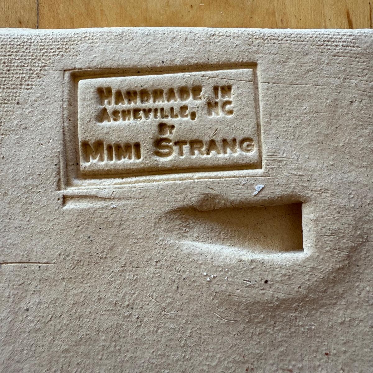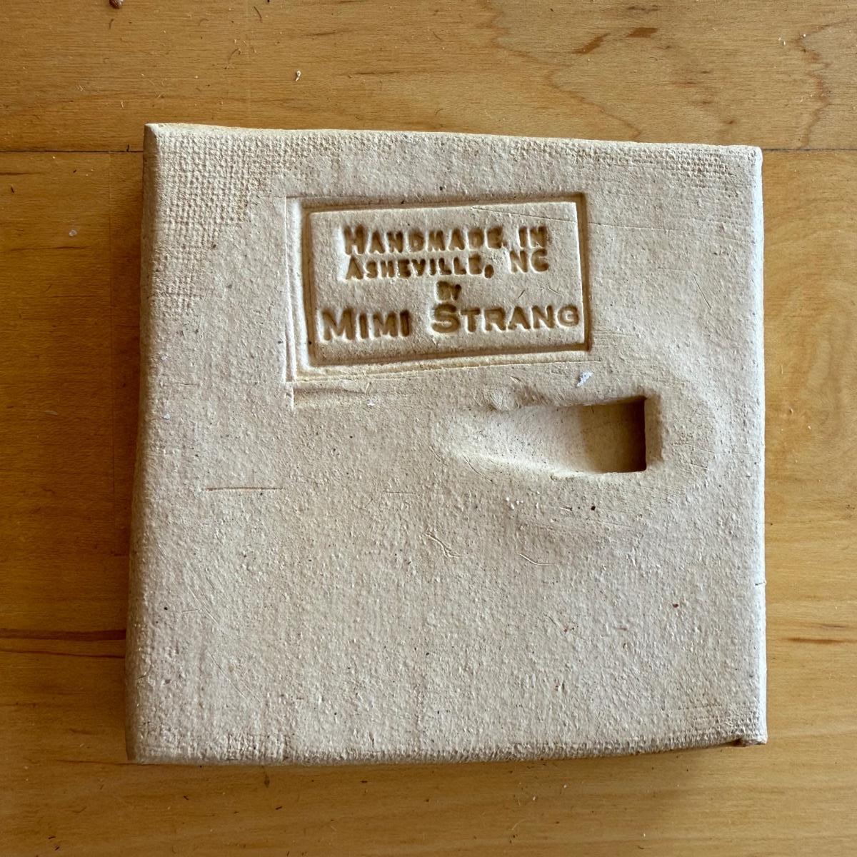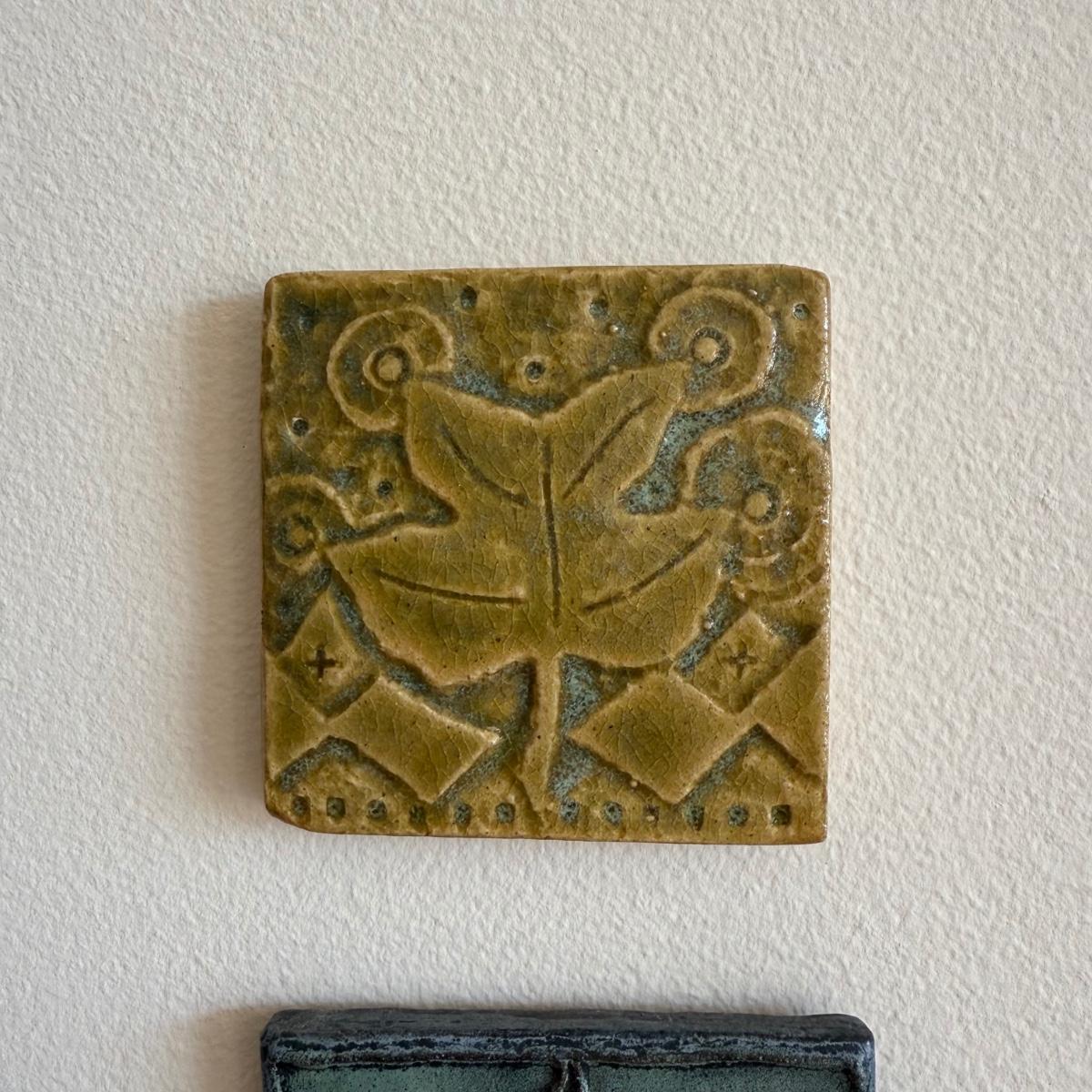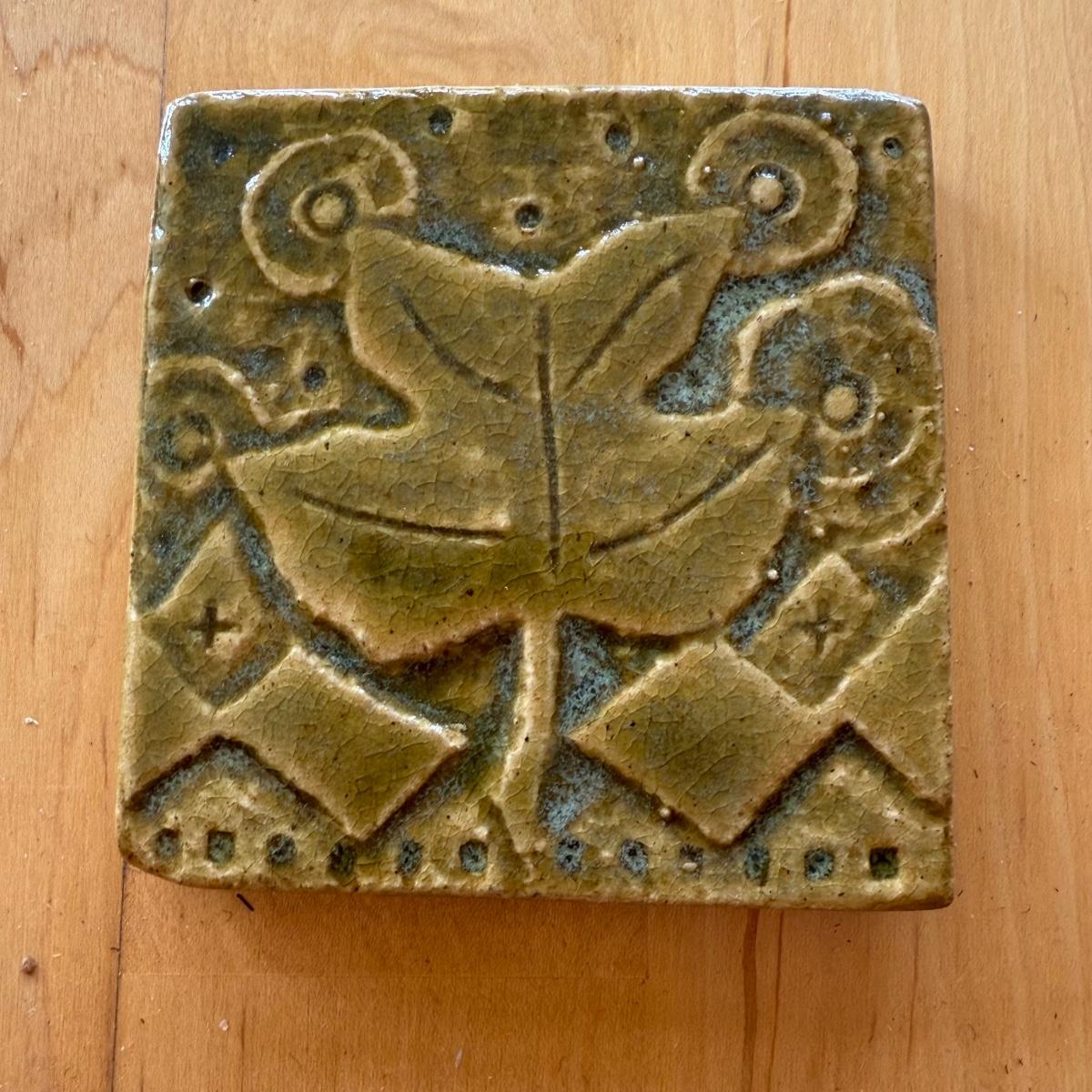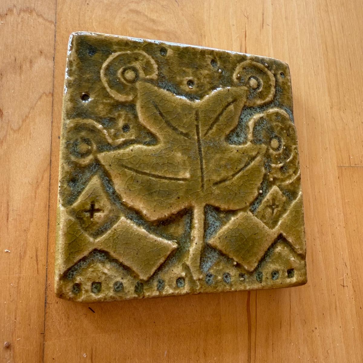 This lot contains a pretty ceramic tile by local Asheville artist Mimi Strang. This piece features a leaf with geometric background and an olive green glaze. It measures 3.75” x 3.75” and has an indent on the back to be hung. Shipping available.