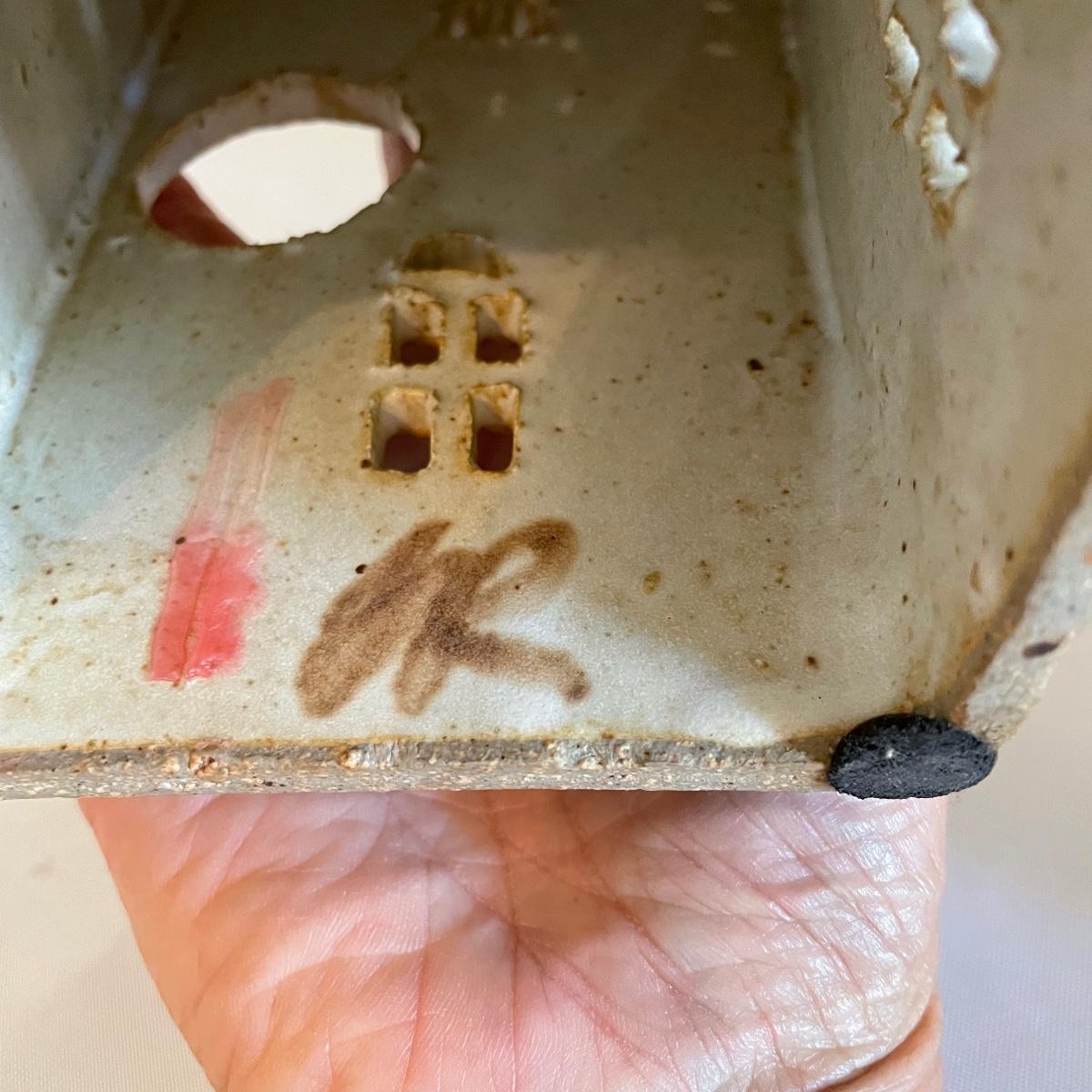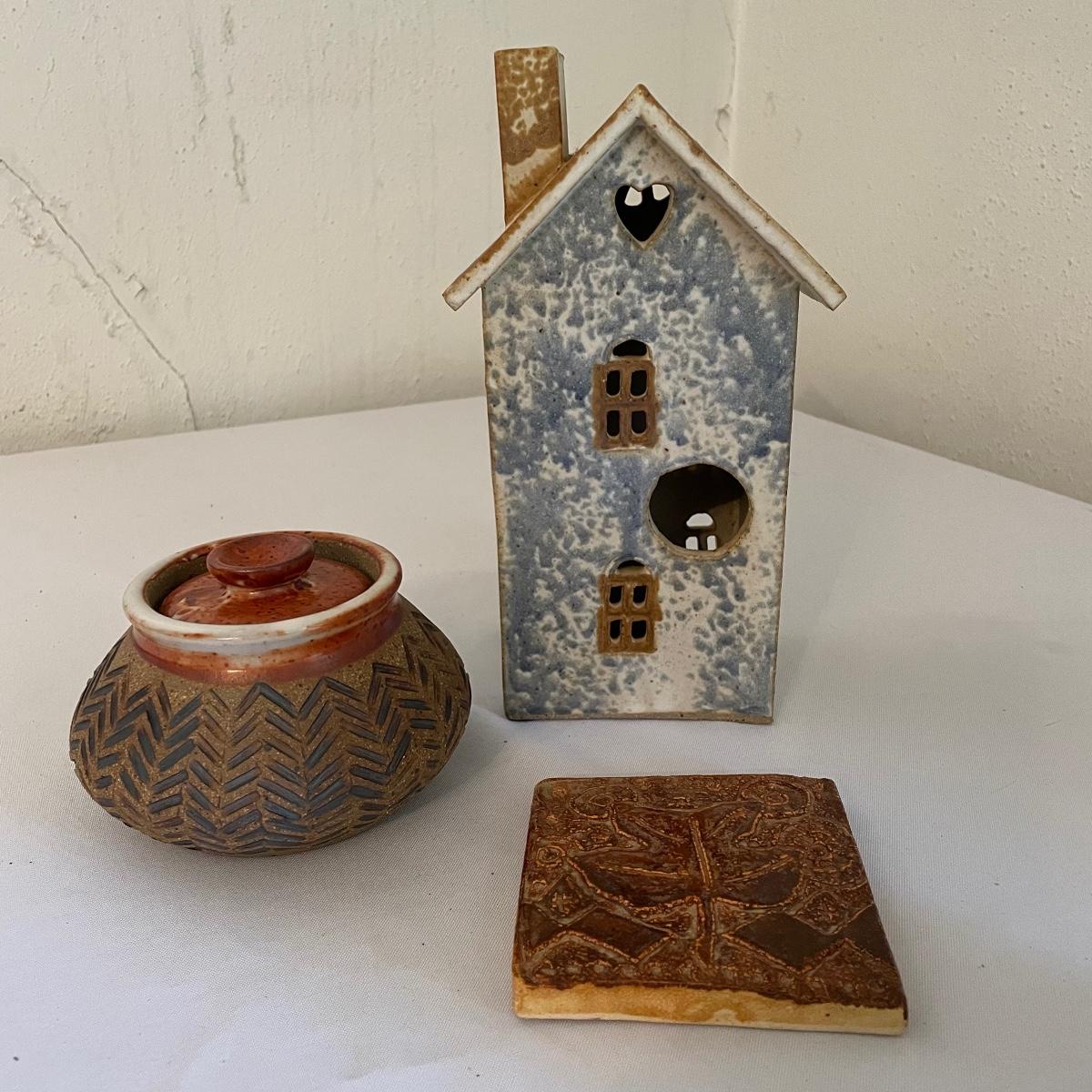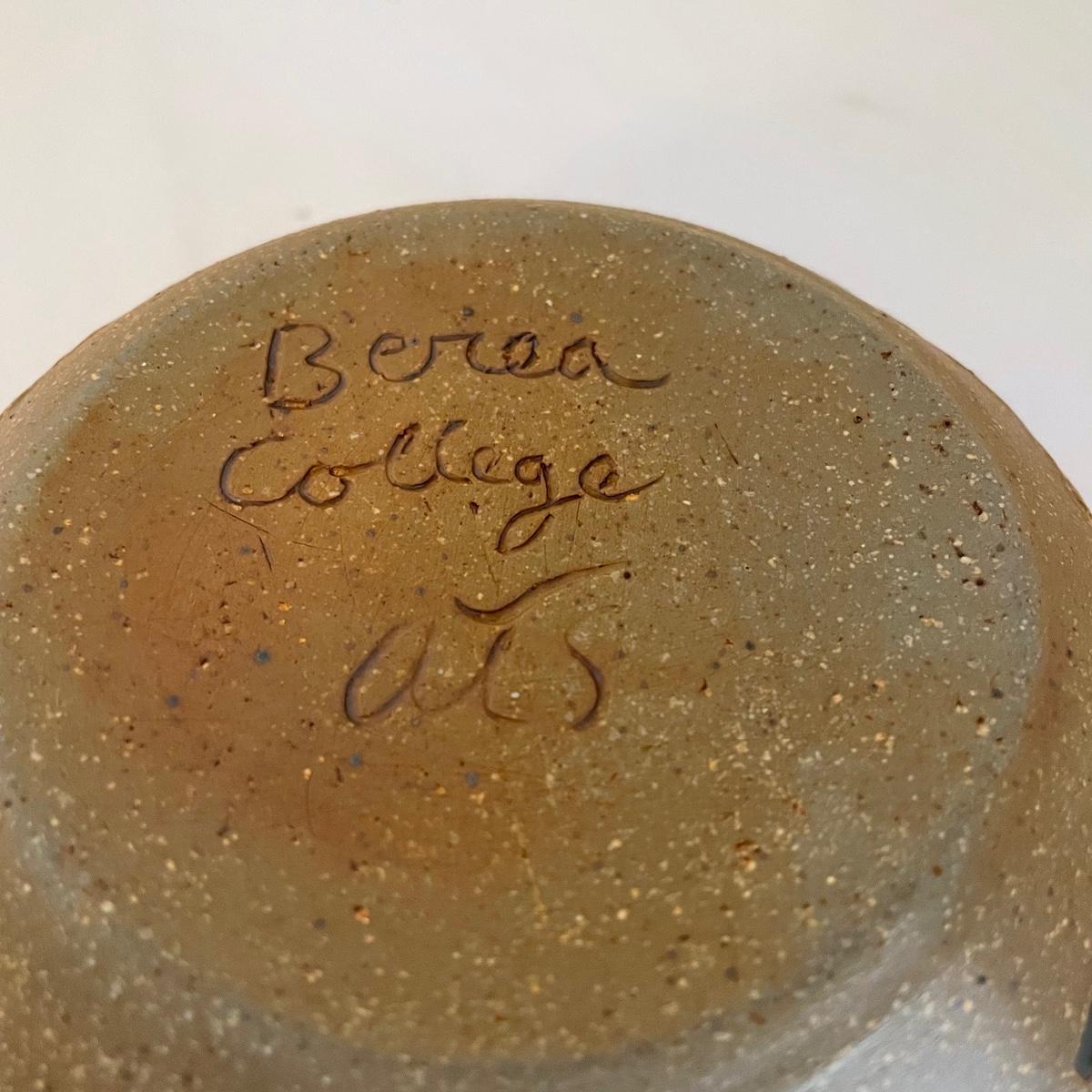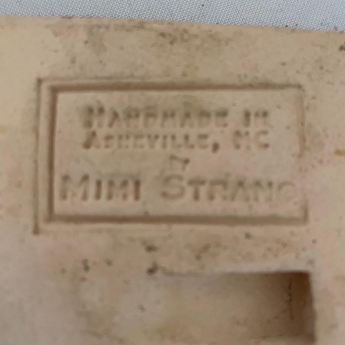 These three pieces of pottery are all signed. The coaster is from local Asheville potter Mimi Strang. The lidded jar is from Berea College.