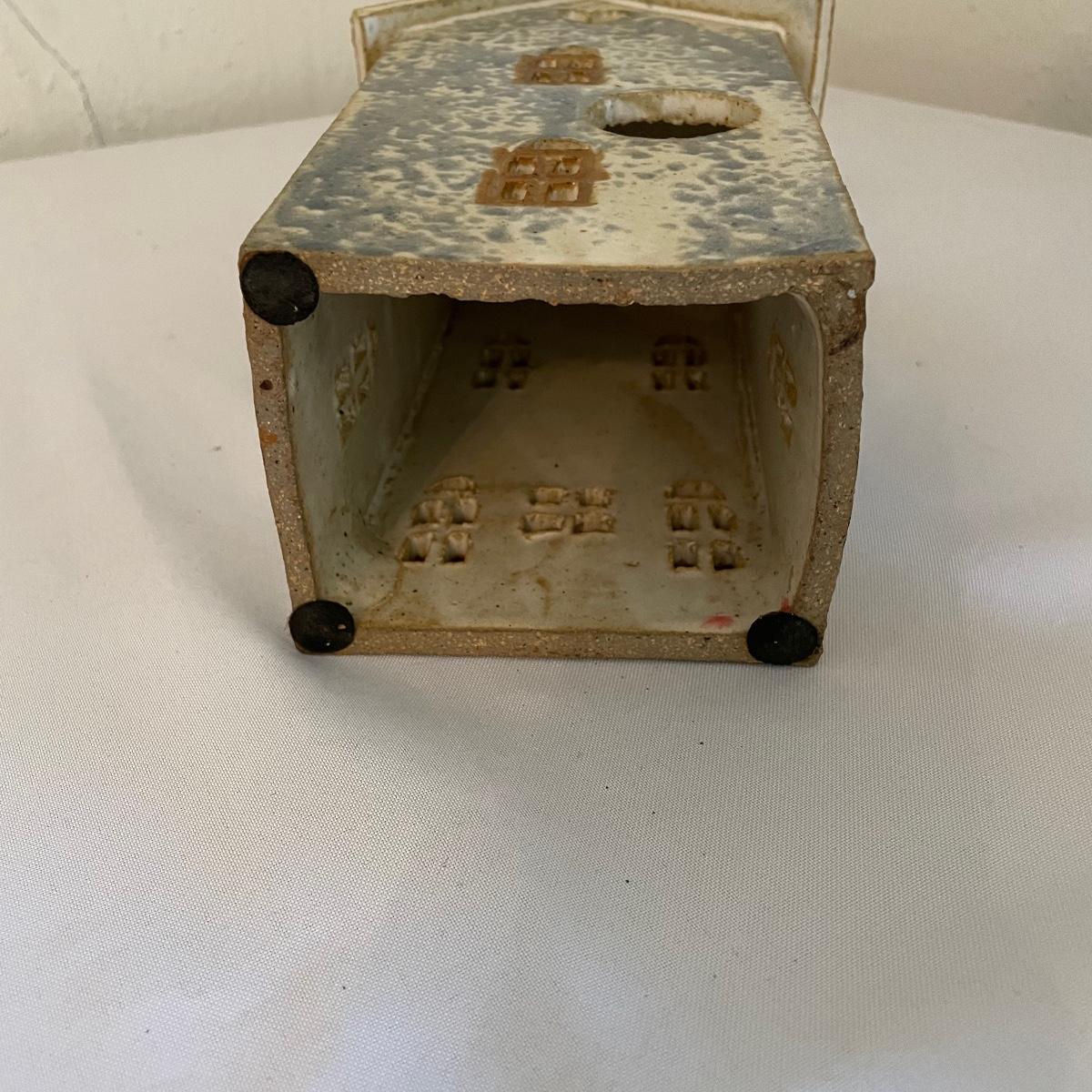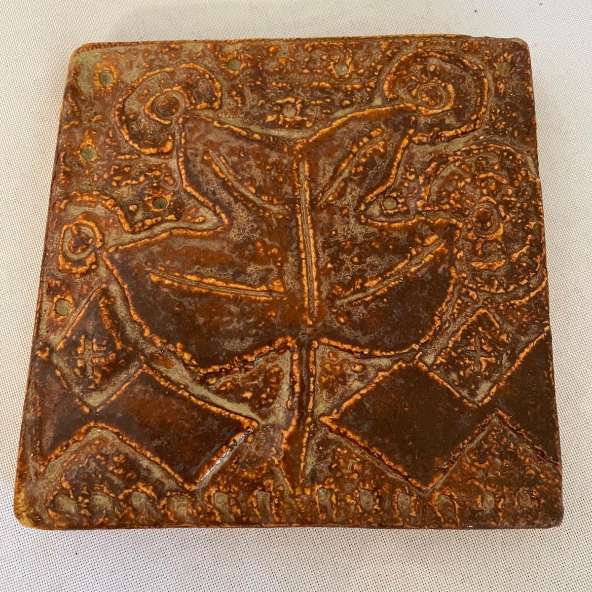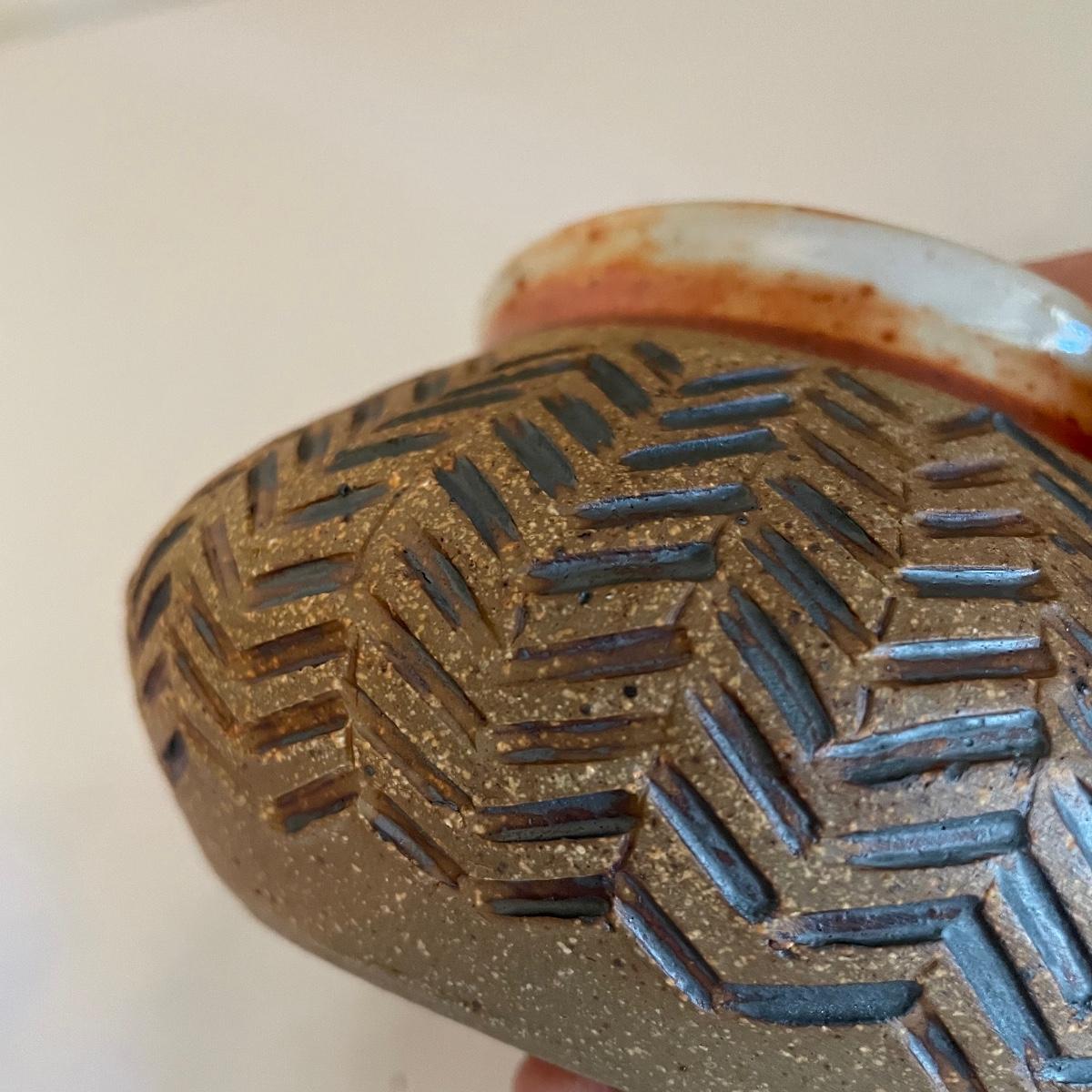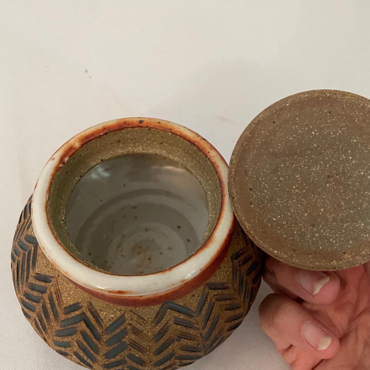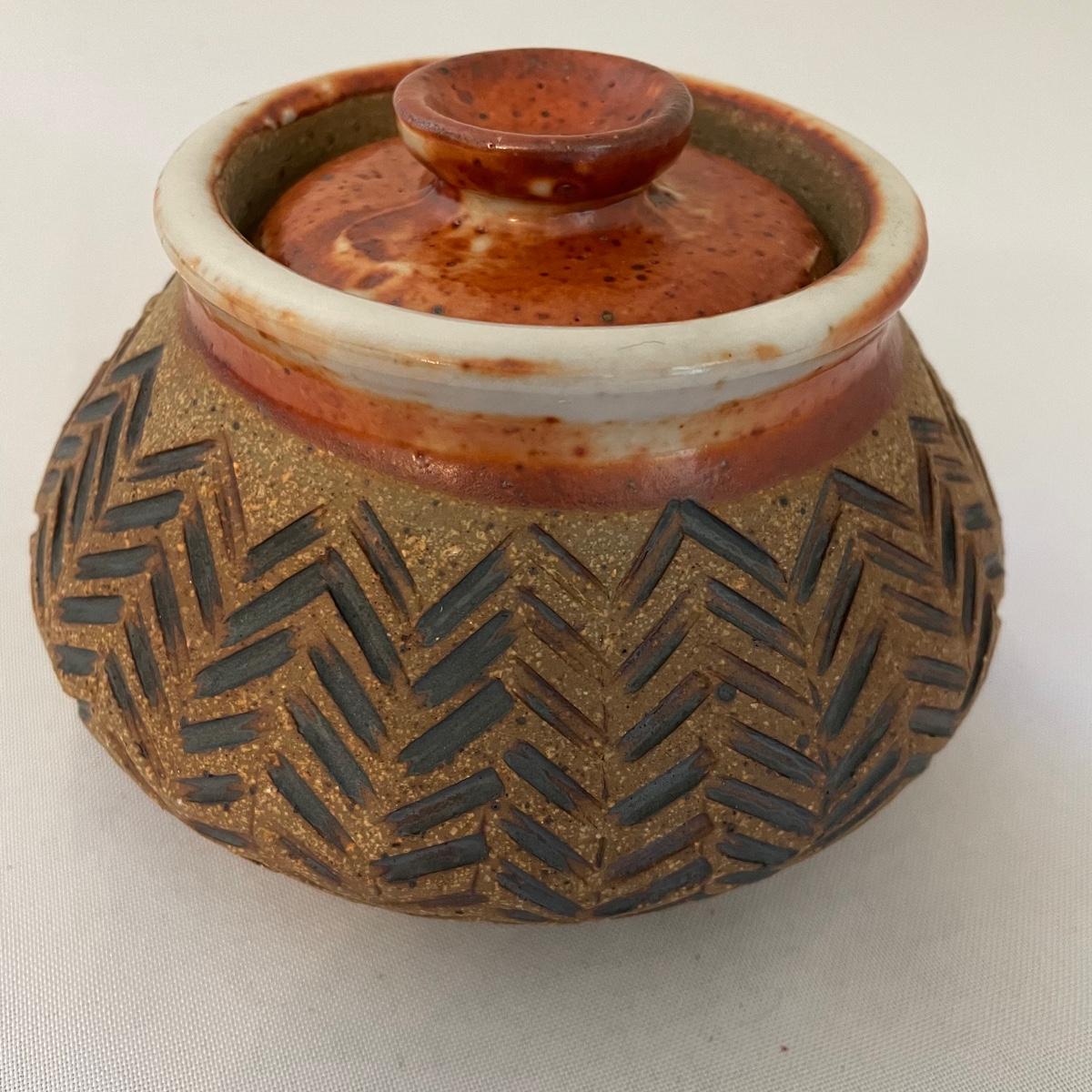 These three pieces of pottery are all signed. The coaster is from local Asheville potter Mimi Strang. The lidded jar is from Berea College.