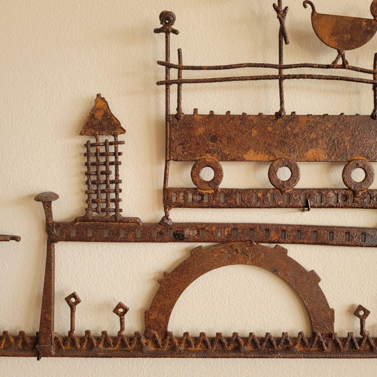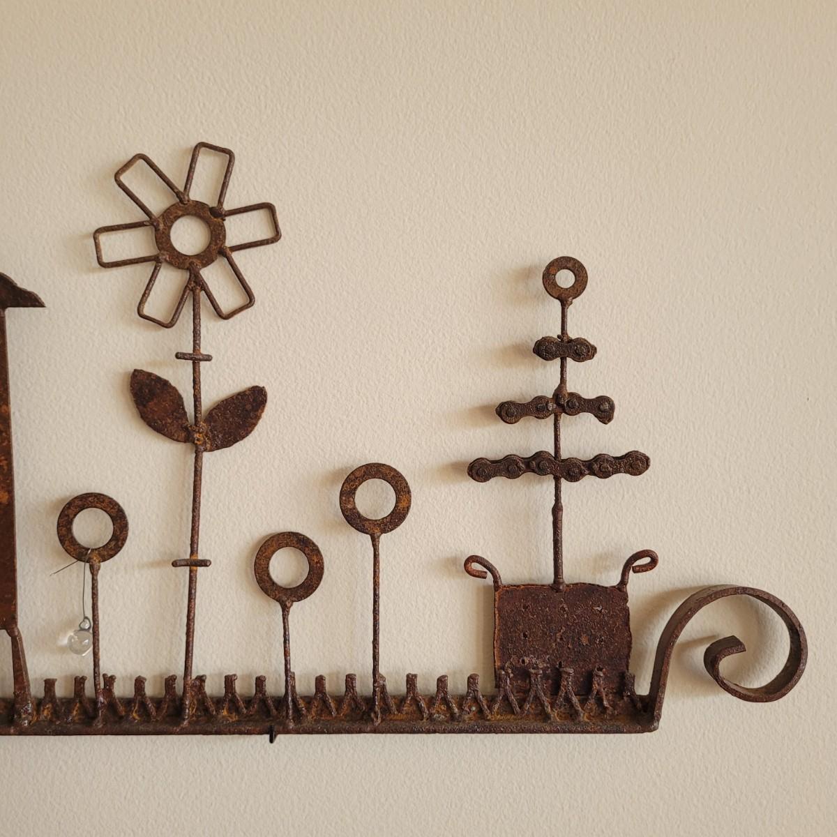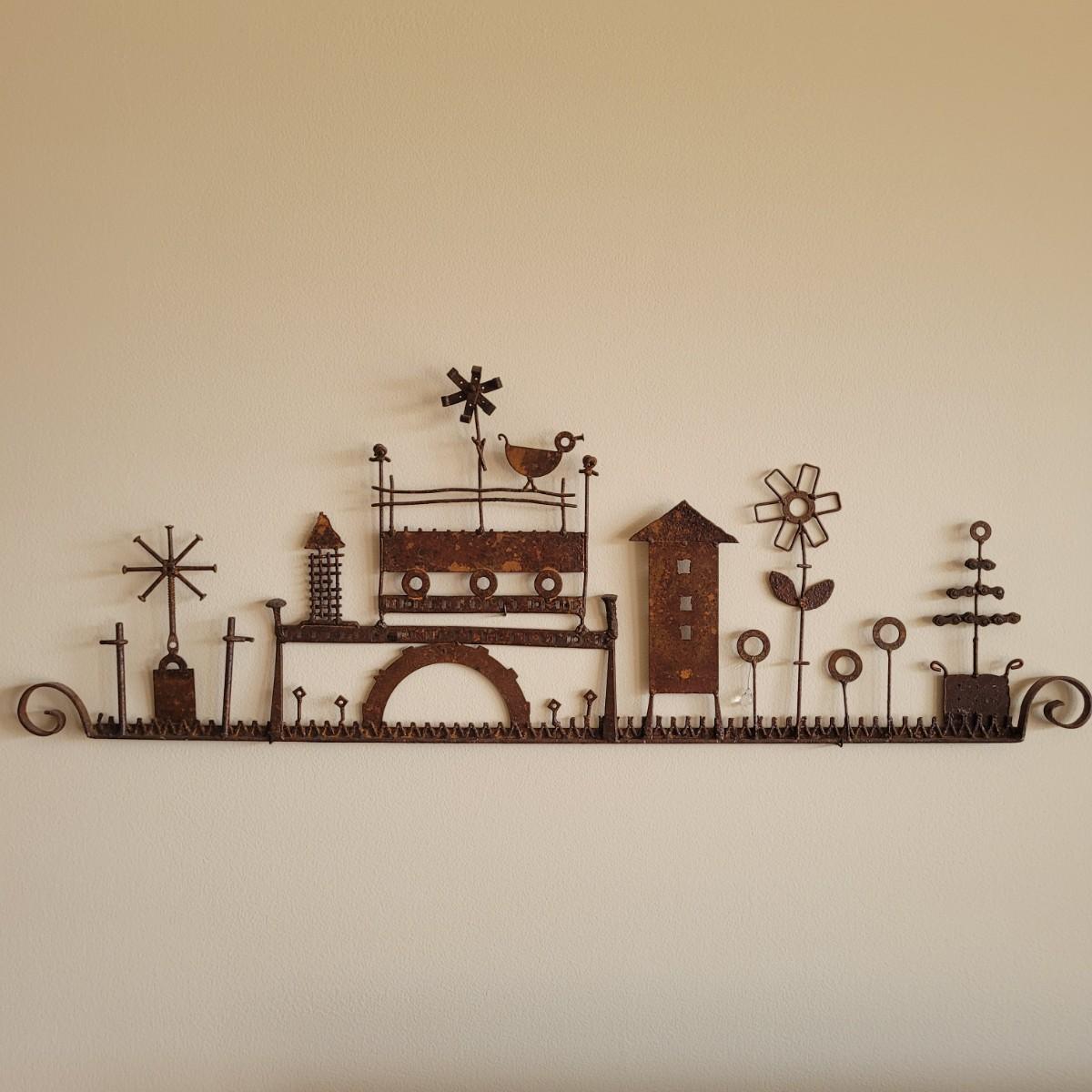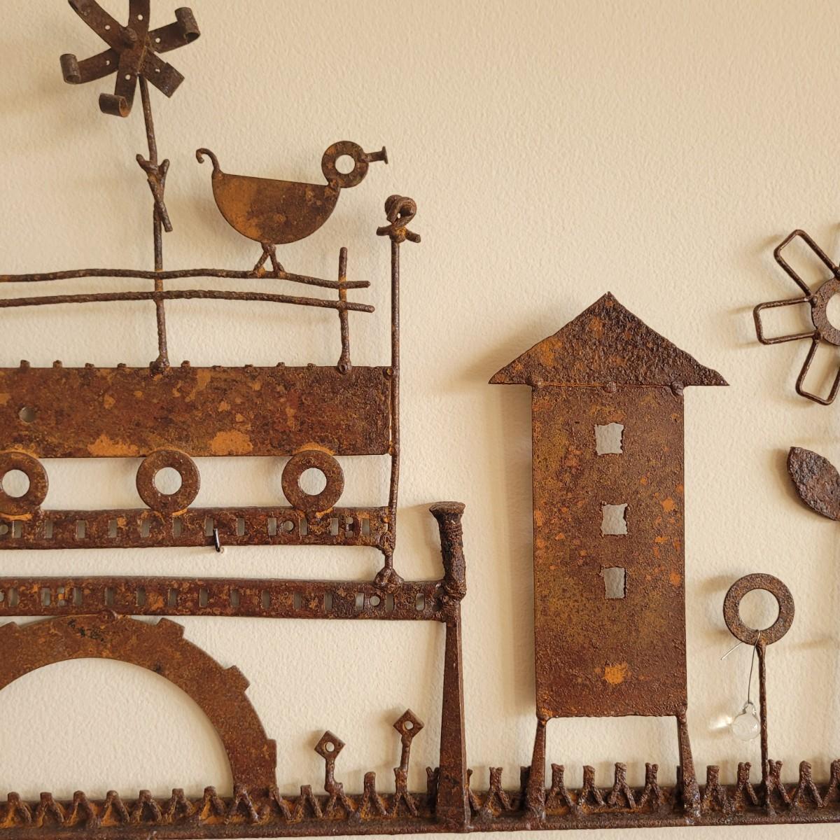 This lot includes one original piece that appears to be the work of Asheville, NC local artist Mimi Strang. The medium is welded metal and depicts a farm style scene with ducks, windmills, flowers, and structures. It has a natural rust color and can easily be mounted on the wall. The piece measures 37.5" x 13.5"H.