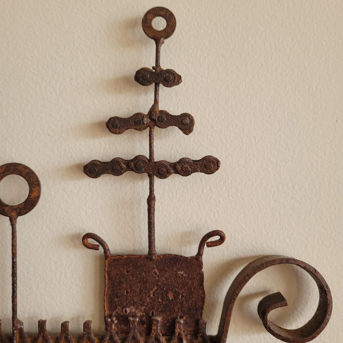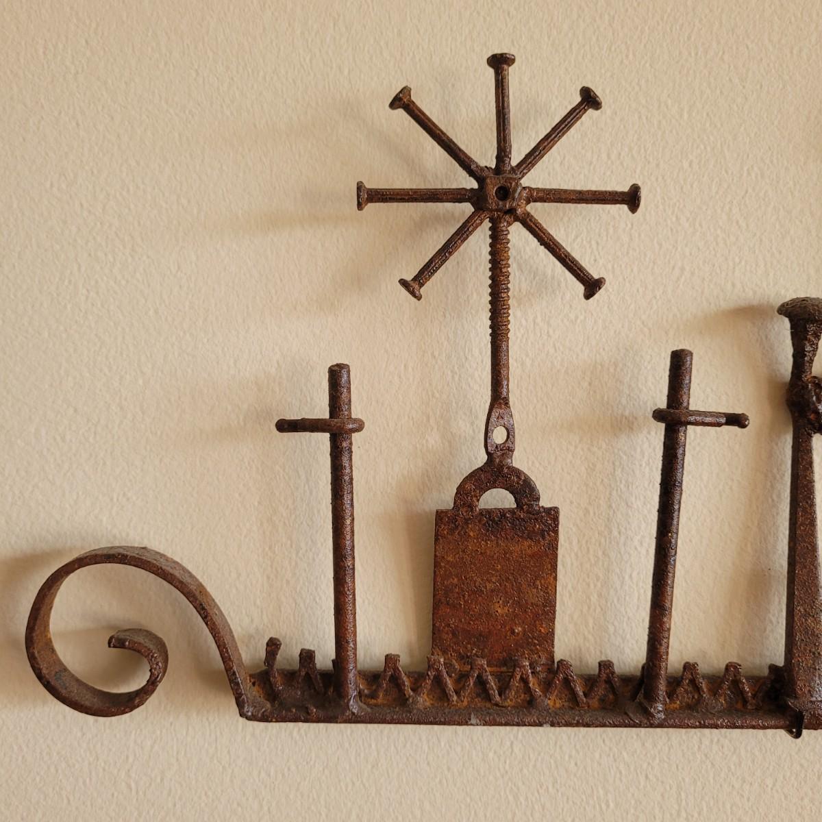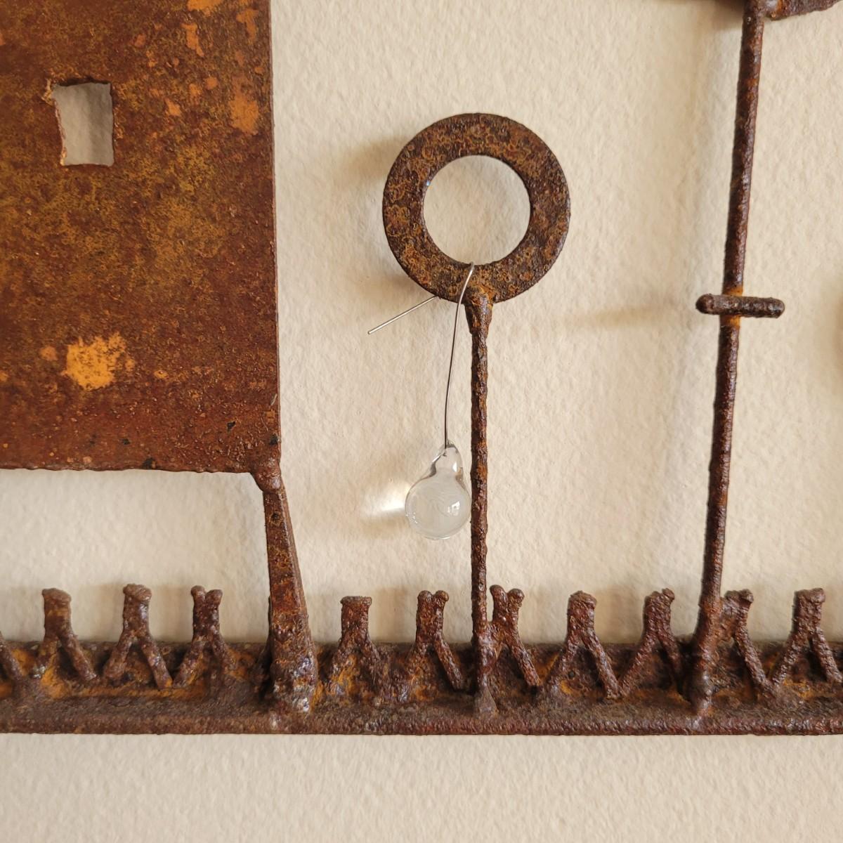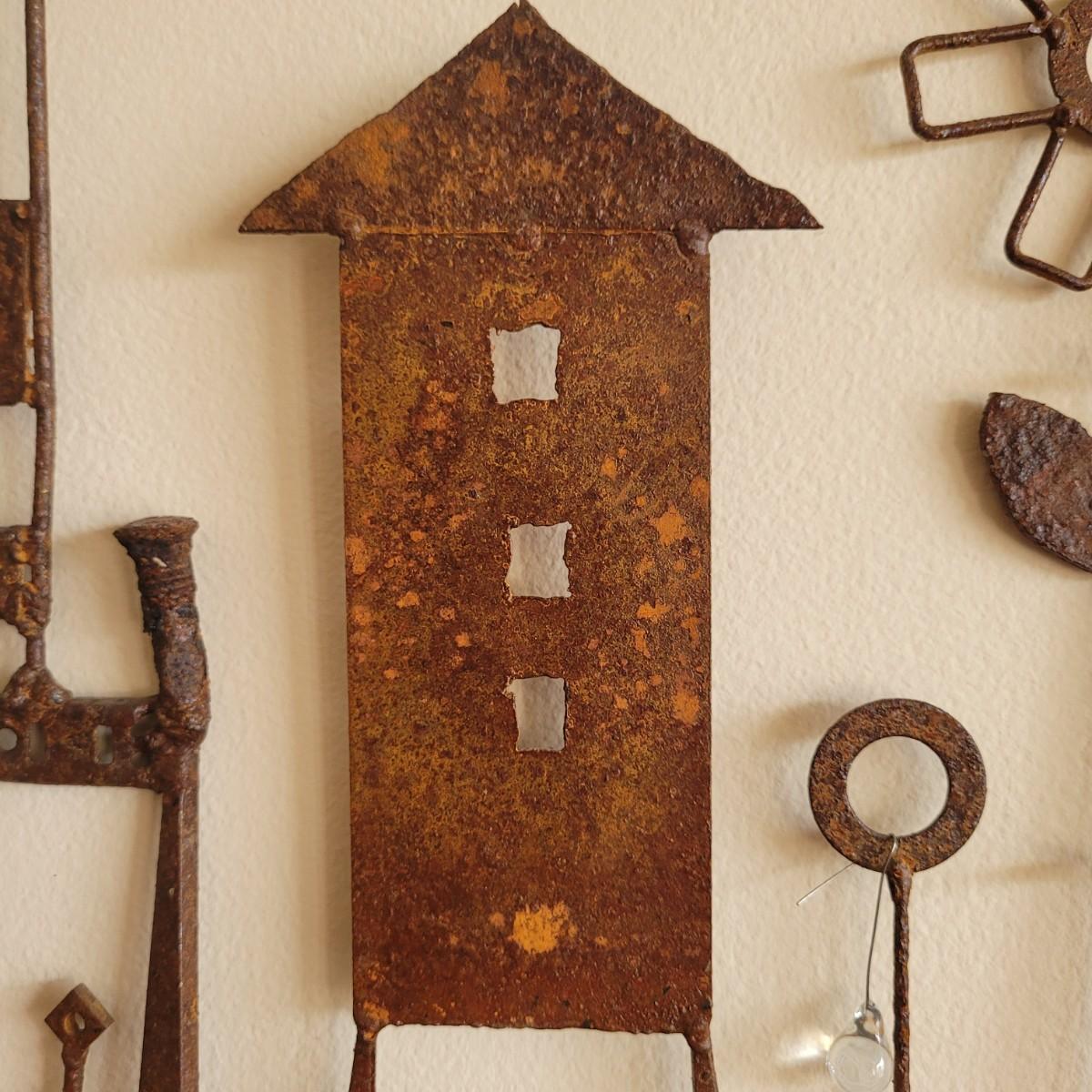 This lot includes one original piece that appears to be the work of Asheville, NC local artist Mimi Strang. The medium is welded metal and depicts a farm style scene with ducks, windmills, flowers, and structures. It has a natural rust color and can easily be mounted on the wall. The piece measures 37.5" x 13.5"H.