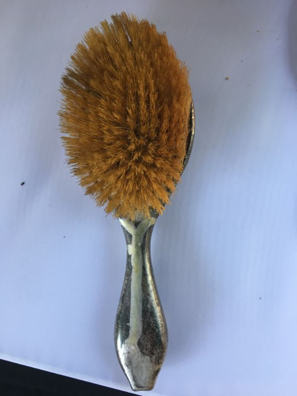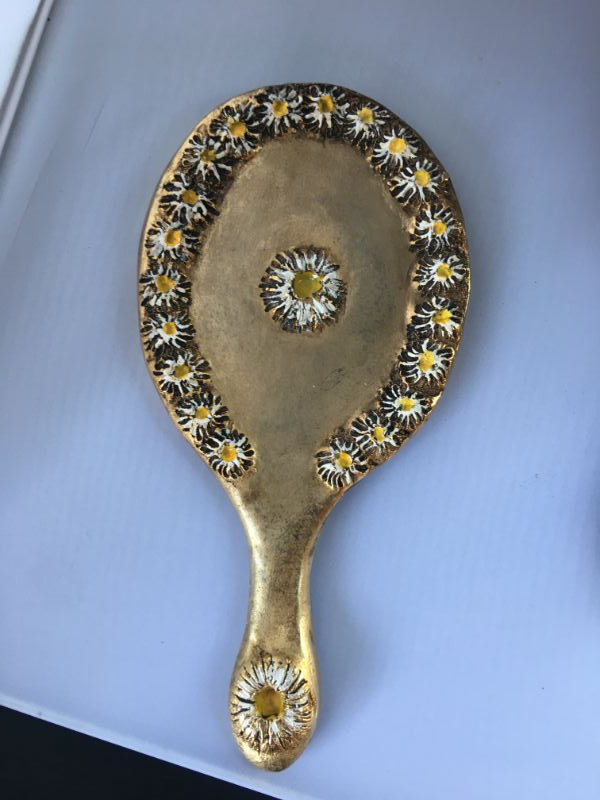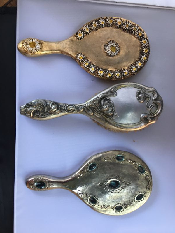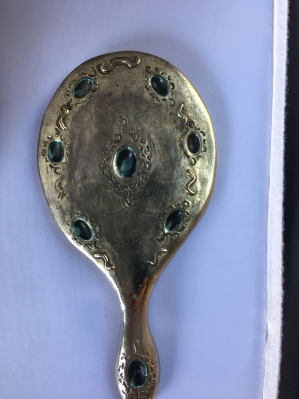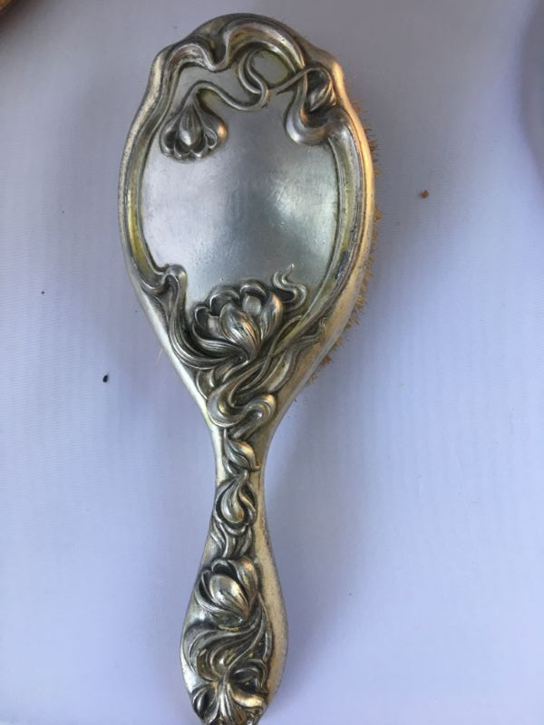 Min-Century Set of Ladies" Toiletry 2 Mirrors and 1 Brush colored glass decorated