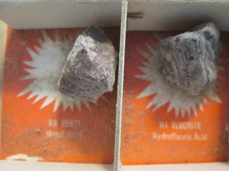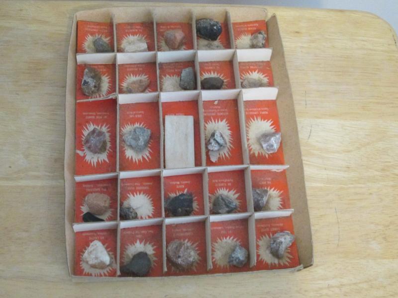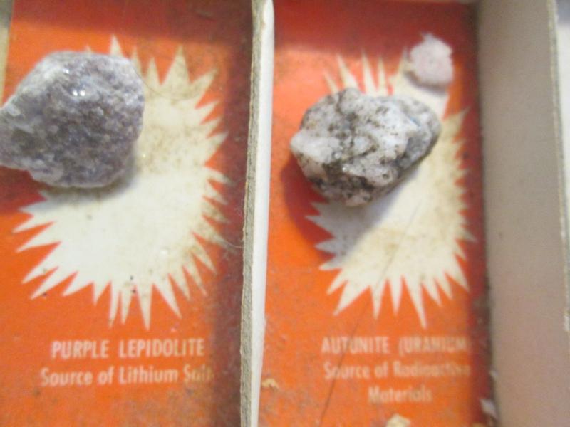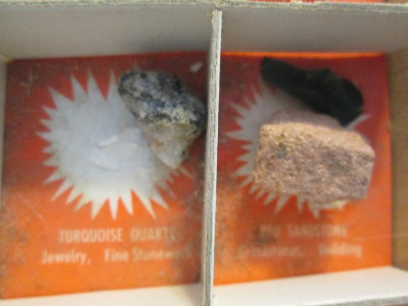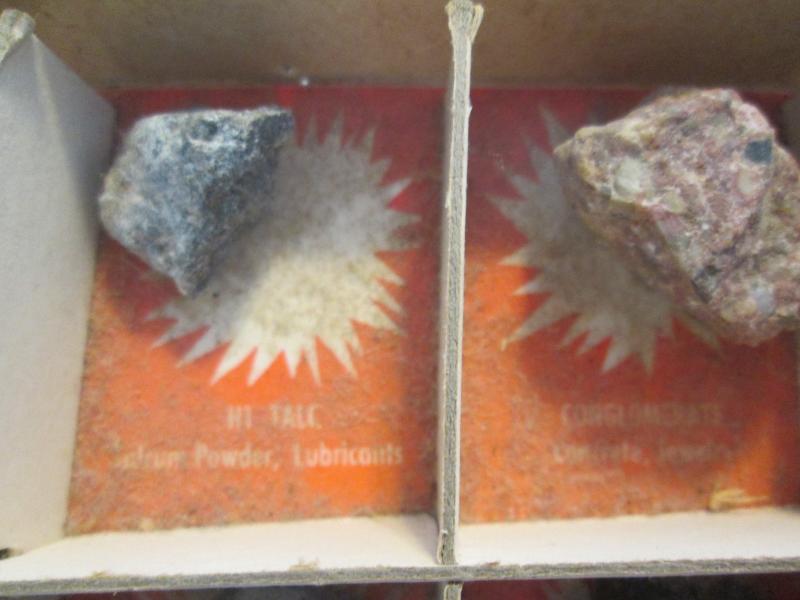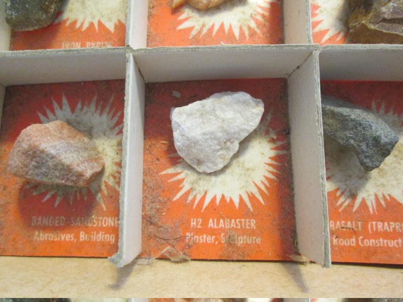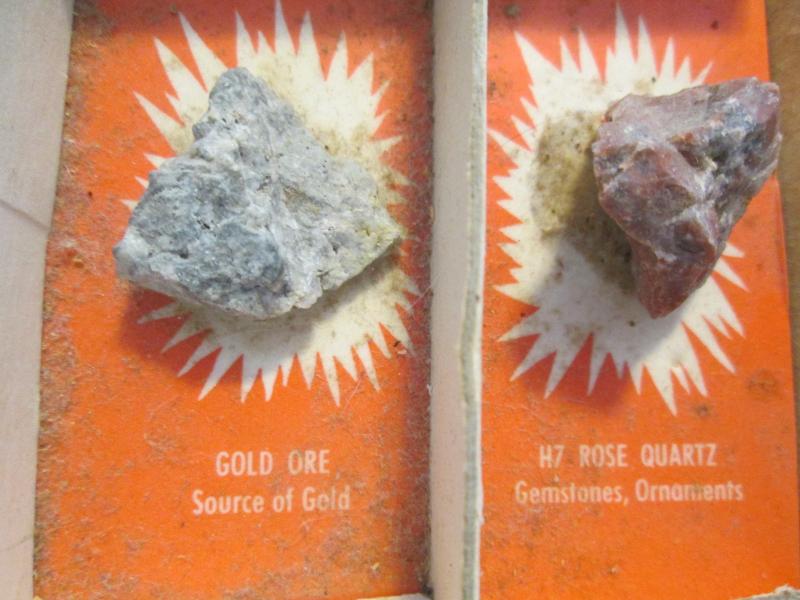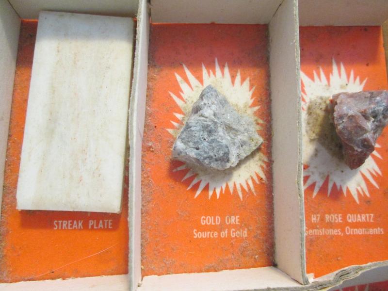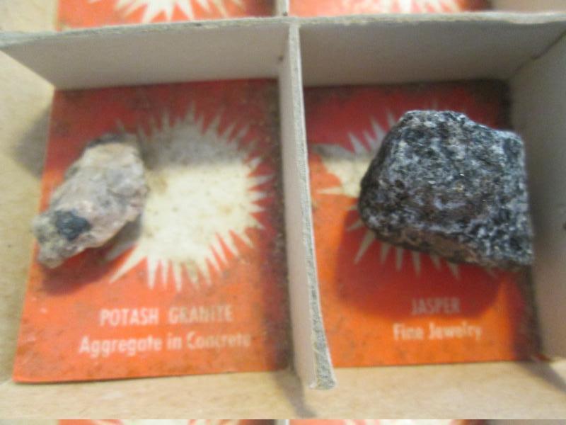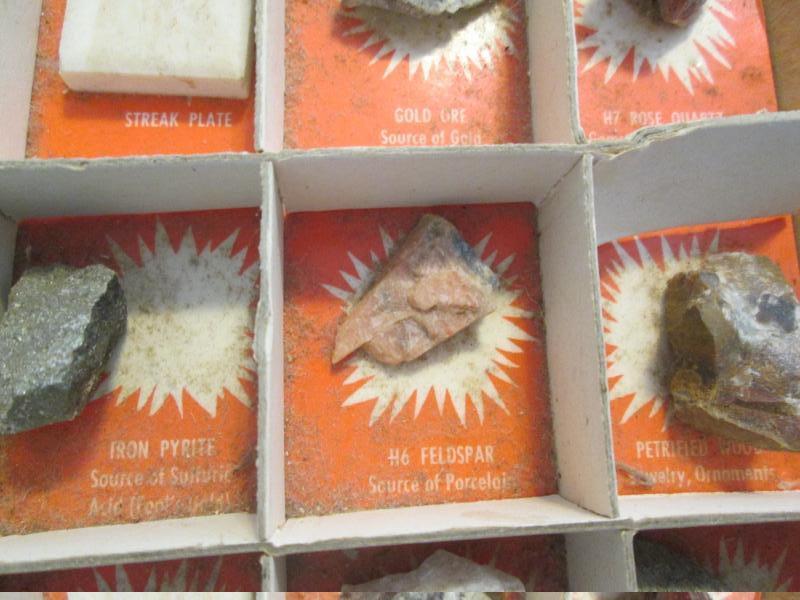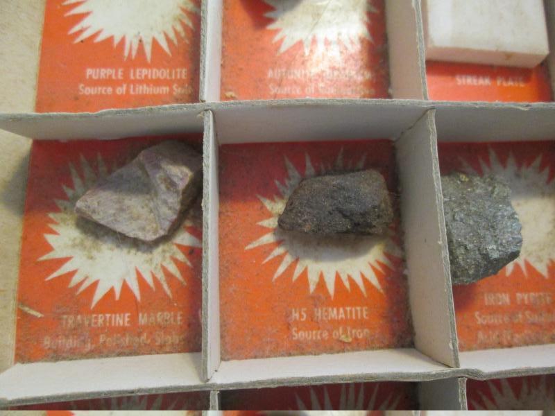 Included in this display are purple lepidolite, gold ore, banded sandstone, potash granite, streak plate and feldspar just to name a few. Please note that we did not create this collection. Please look at pictures.