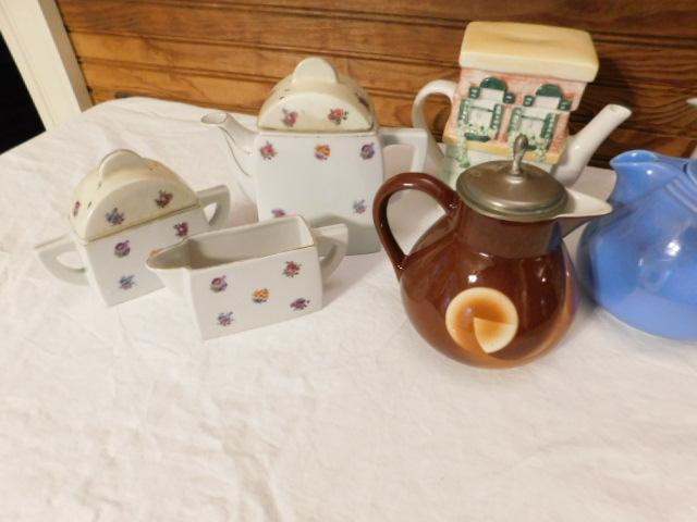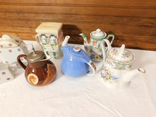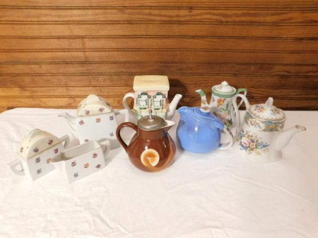 Mingling of various teapots. One has matching creamer and sugar bowl. Some are vintage items. Could be some chipping and signs of wear.