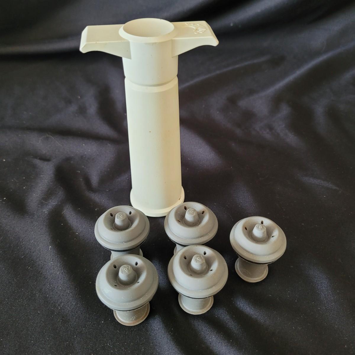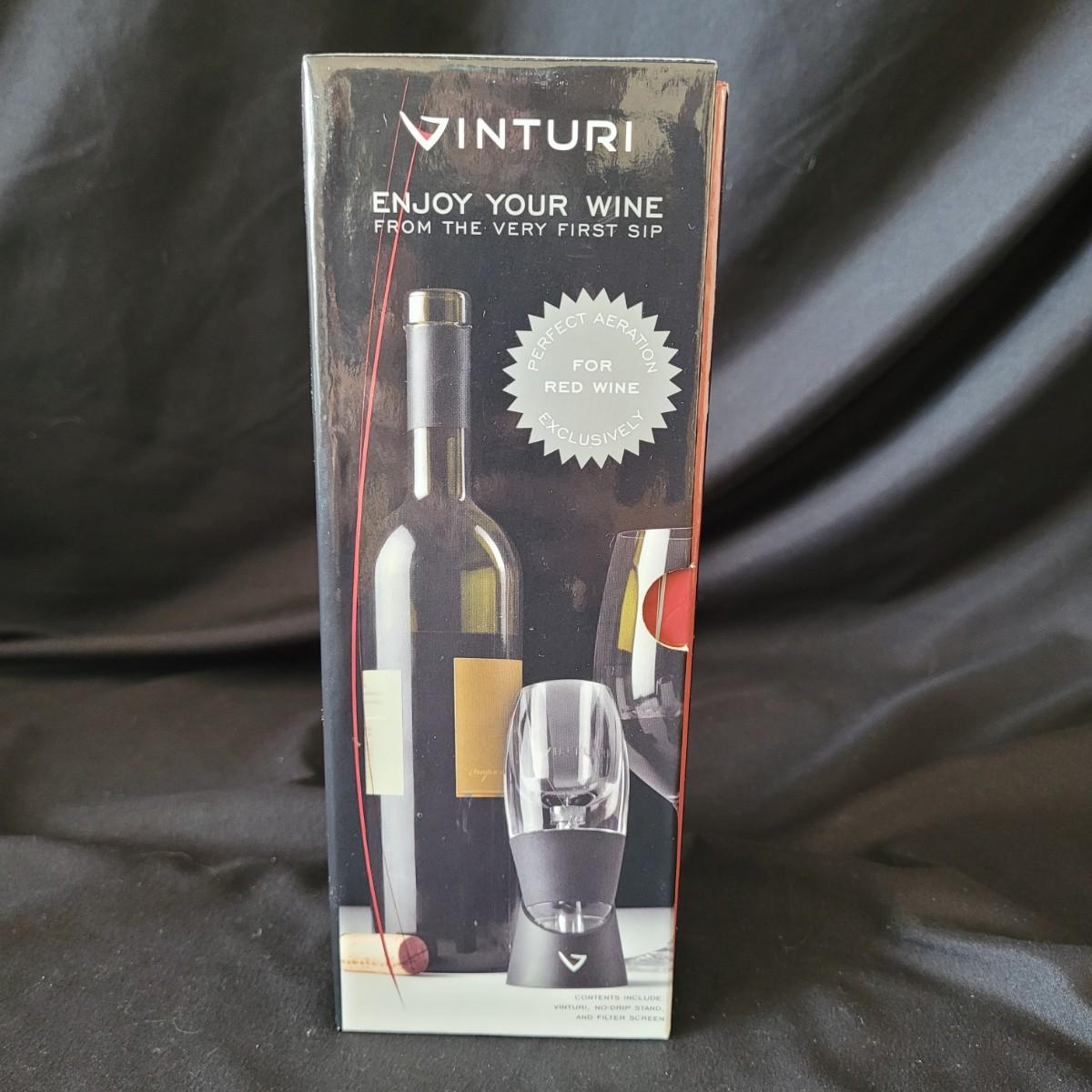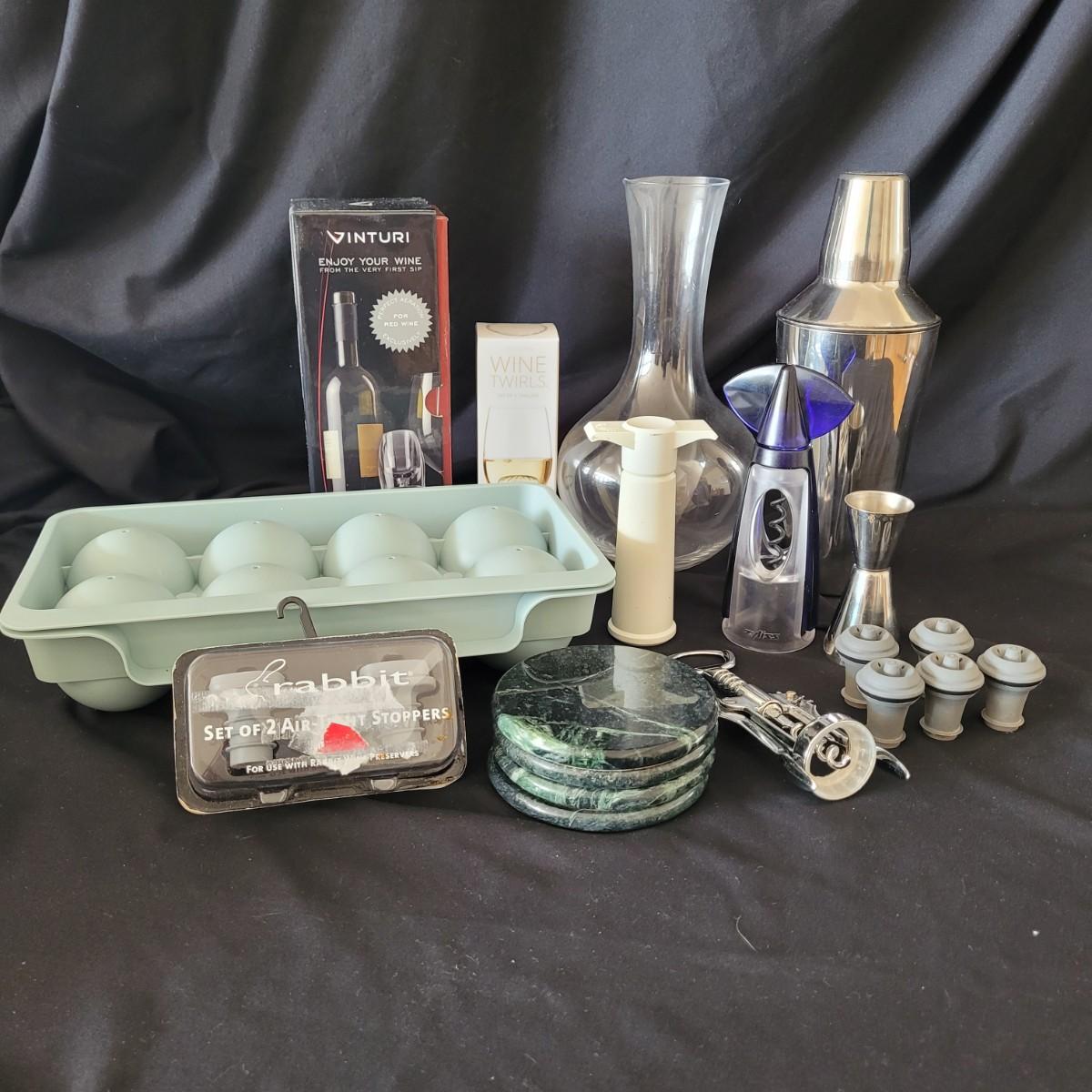 This lot includes various items for a home bar. Items include Vinturi wine aerator, Riedel glass decanter, drink shaker, shot measurer, corkscrews, spherical ice maker, marble coasters, Wine Twirls chillers, rubber corks, and air remover. See photos for individual items.