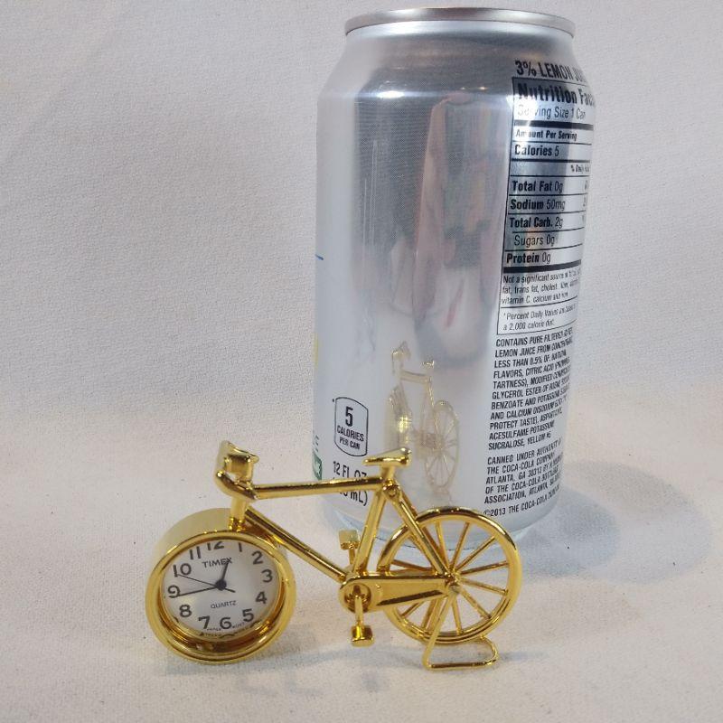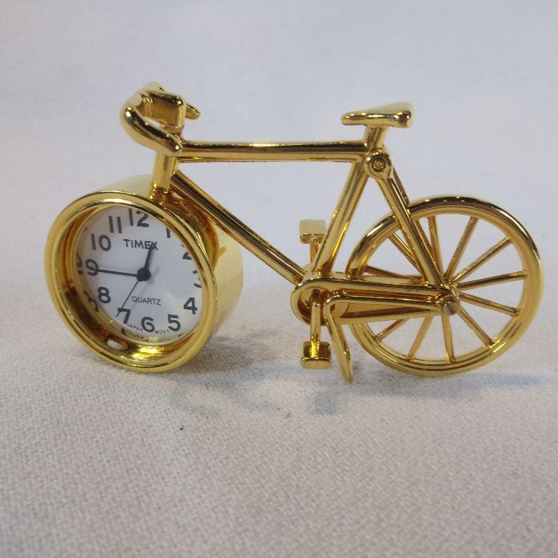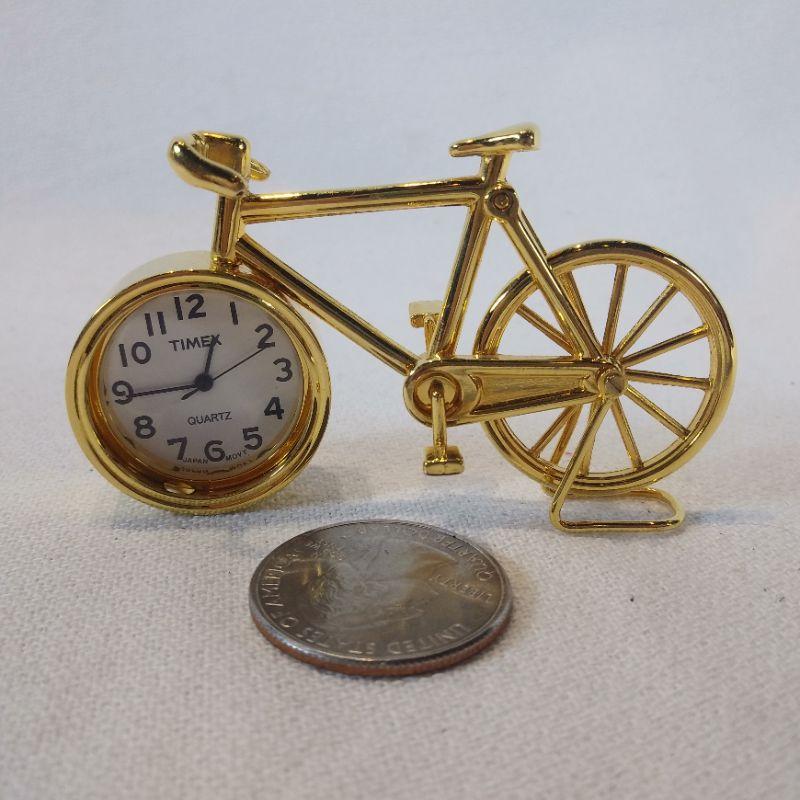 This offering is a solid brass Timex clock set in the front wheel of a bicycle. A wonderful mini model, just perfect for any biking enthusiasts shelf or desk. New battery, working great! Wheels turn. So neat!